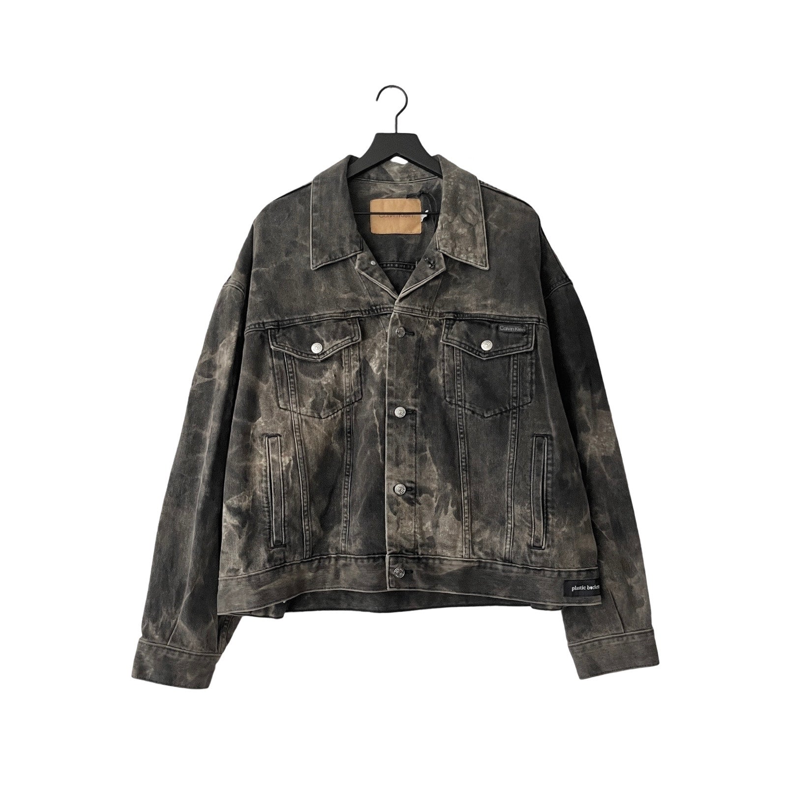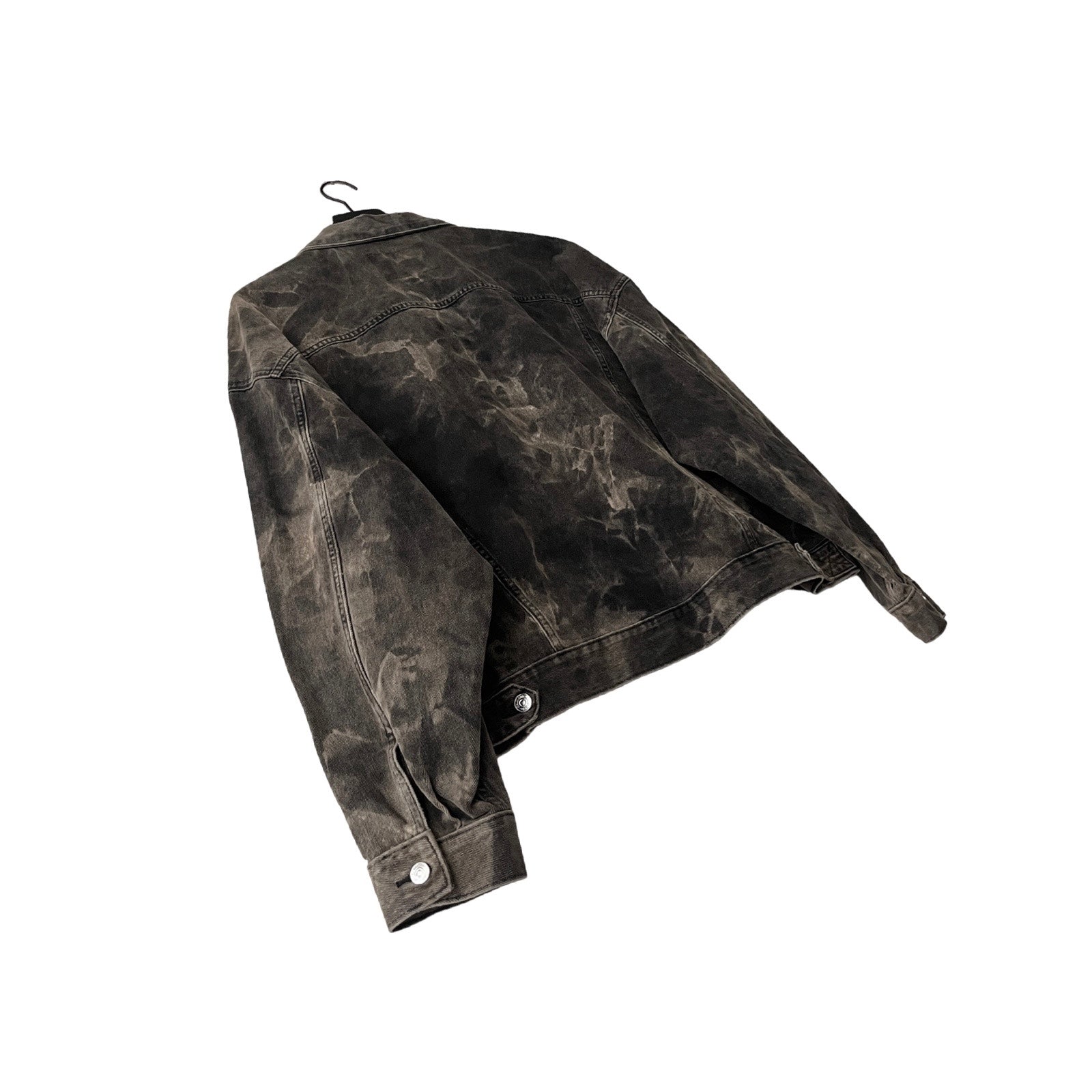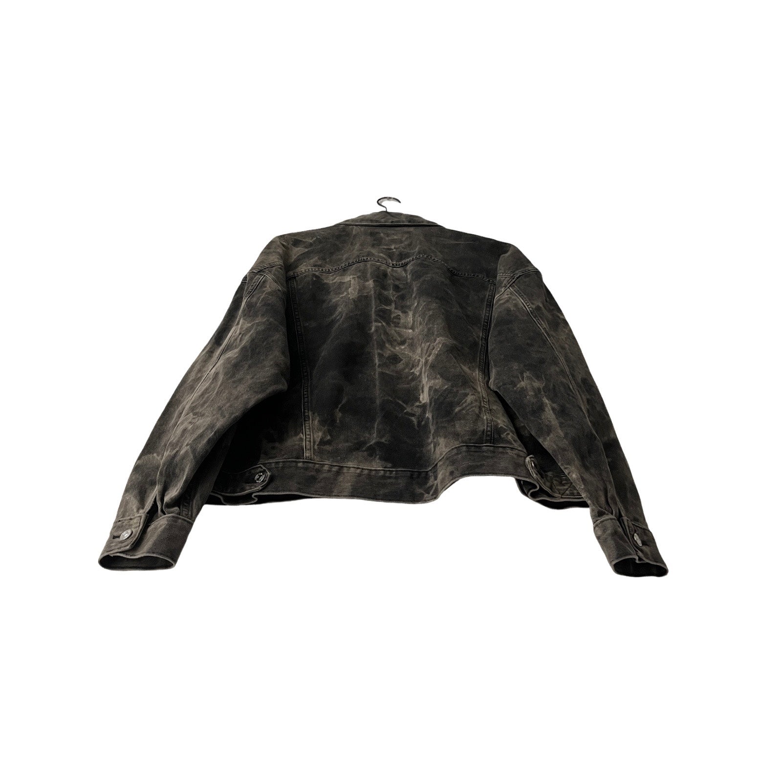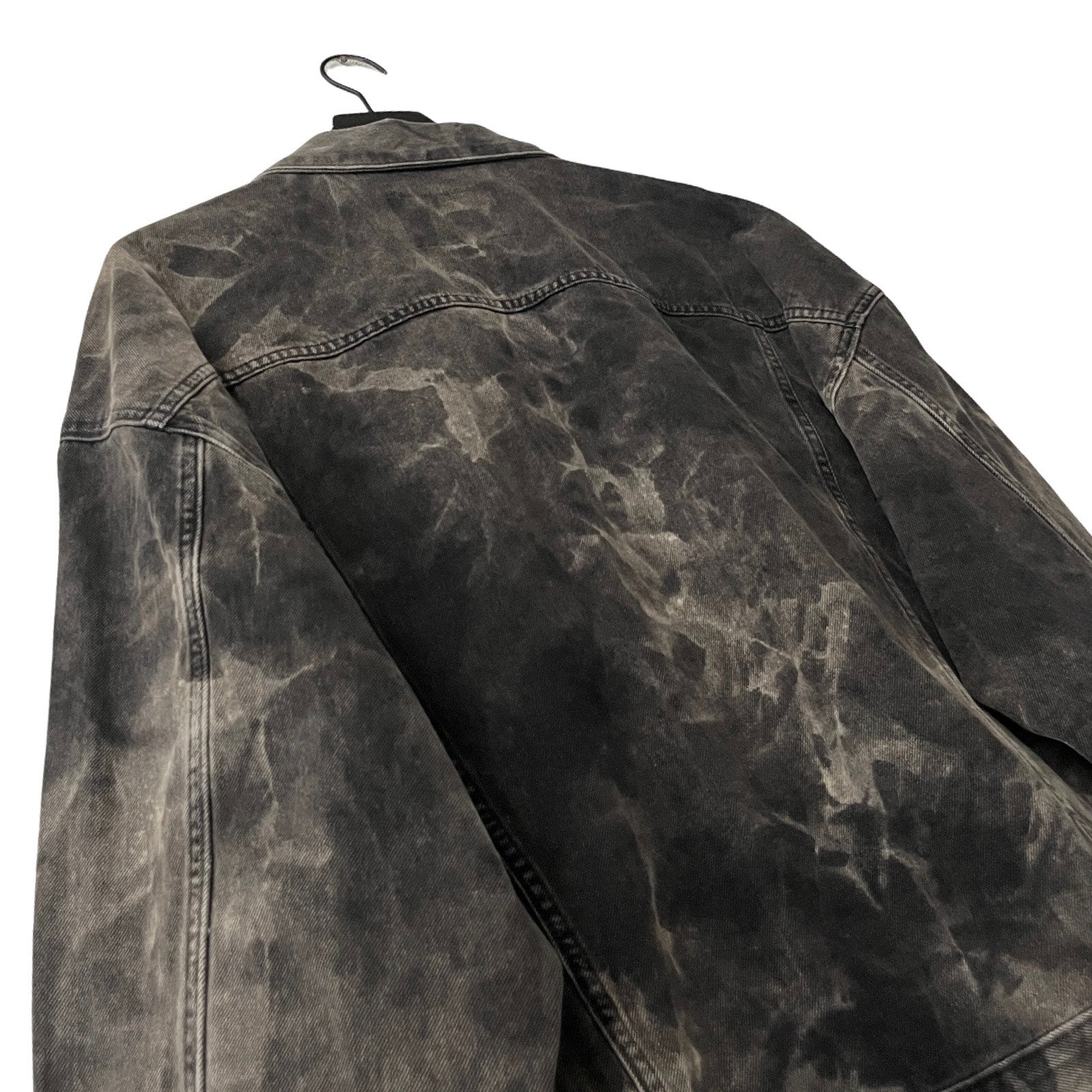 The jacket began as solid black prior to receiving a bleach treatment, resulting in a tonally vaporous, cloudy, textured finish.