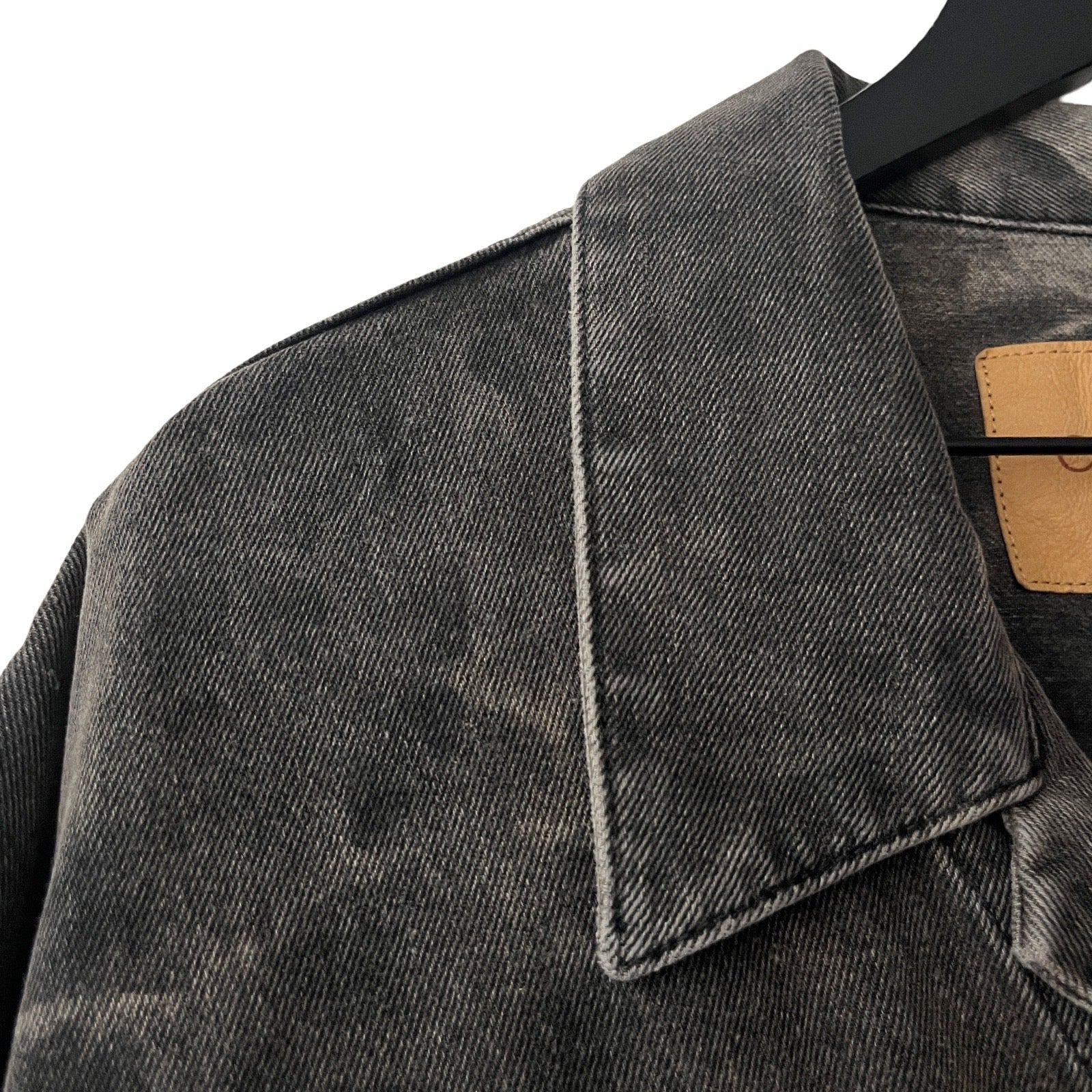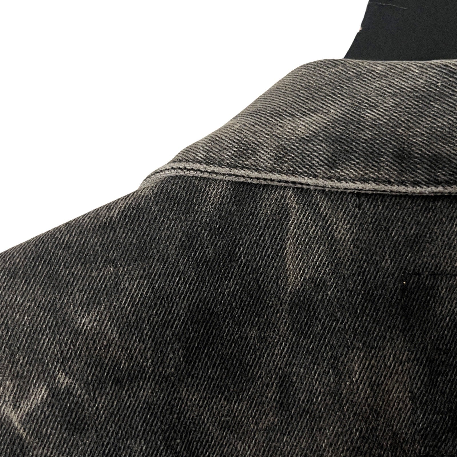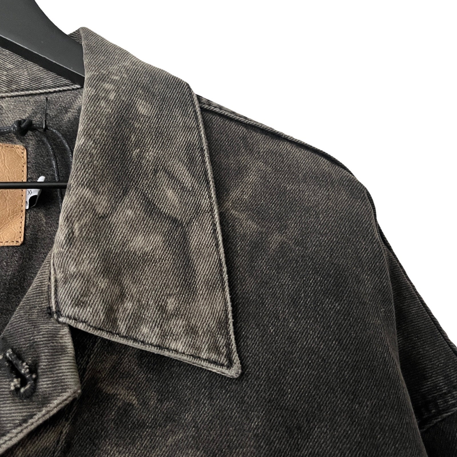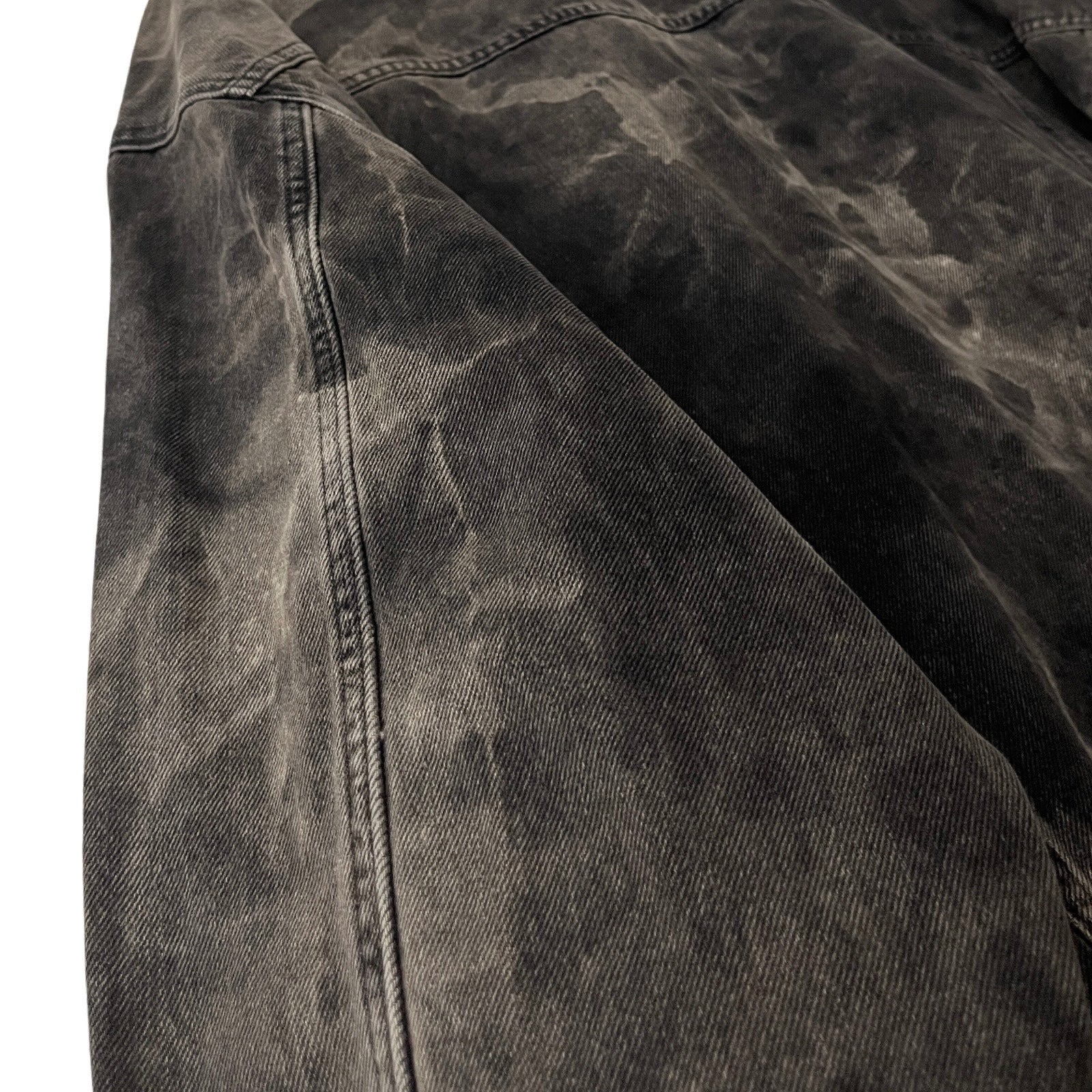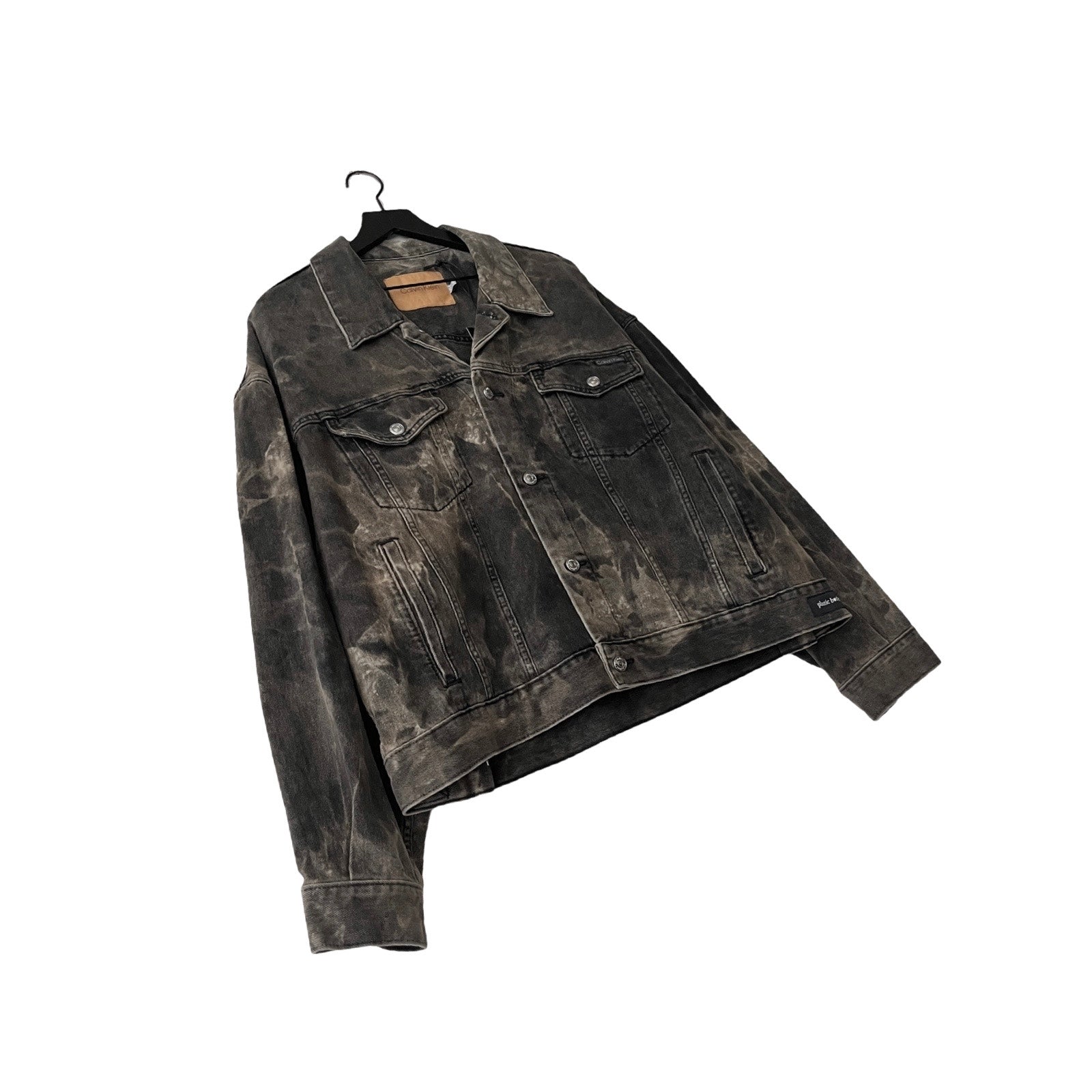 The jacket began as solid black prior to receiving a bleach treatment, resulting in a tonally vaporous, cloudy, textured finish.
