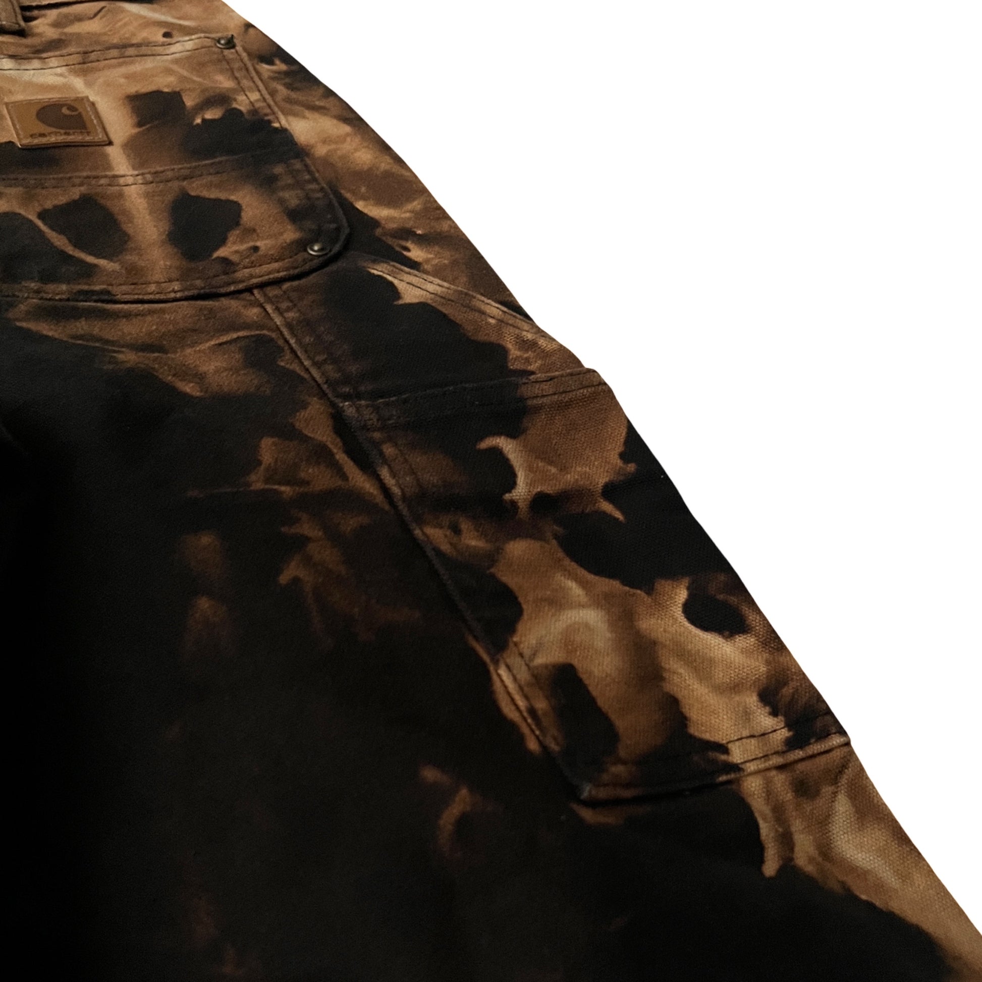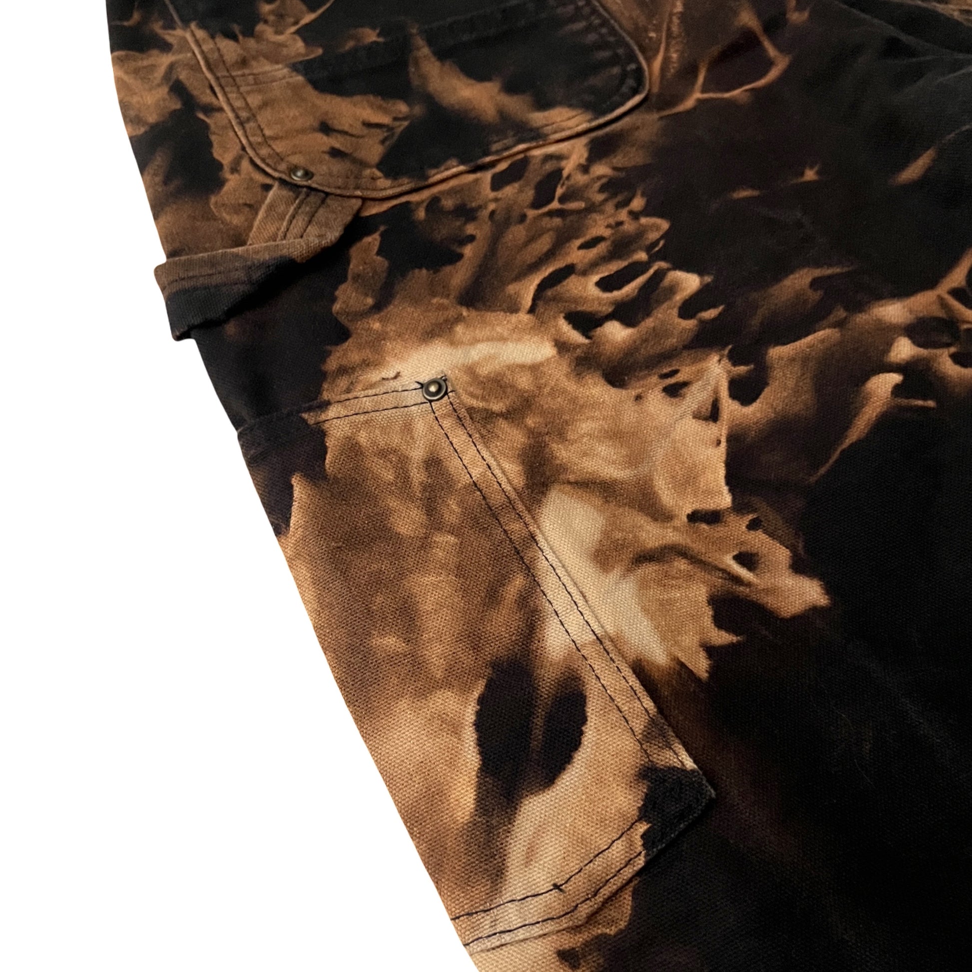 This is a customized, 1 of 1 pair of Carhartt Double Knee loose fit denim work pants. Pants have durable triple stitch construction and brass-toned rivets and buttons.
