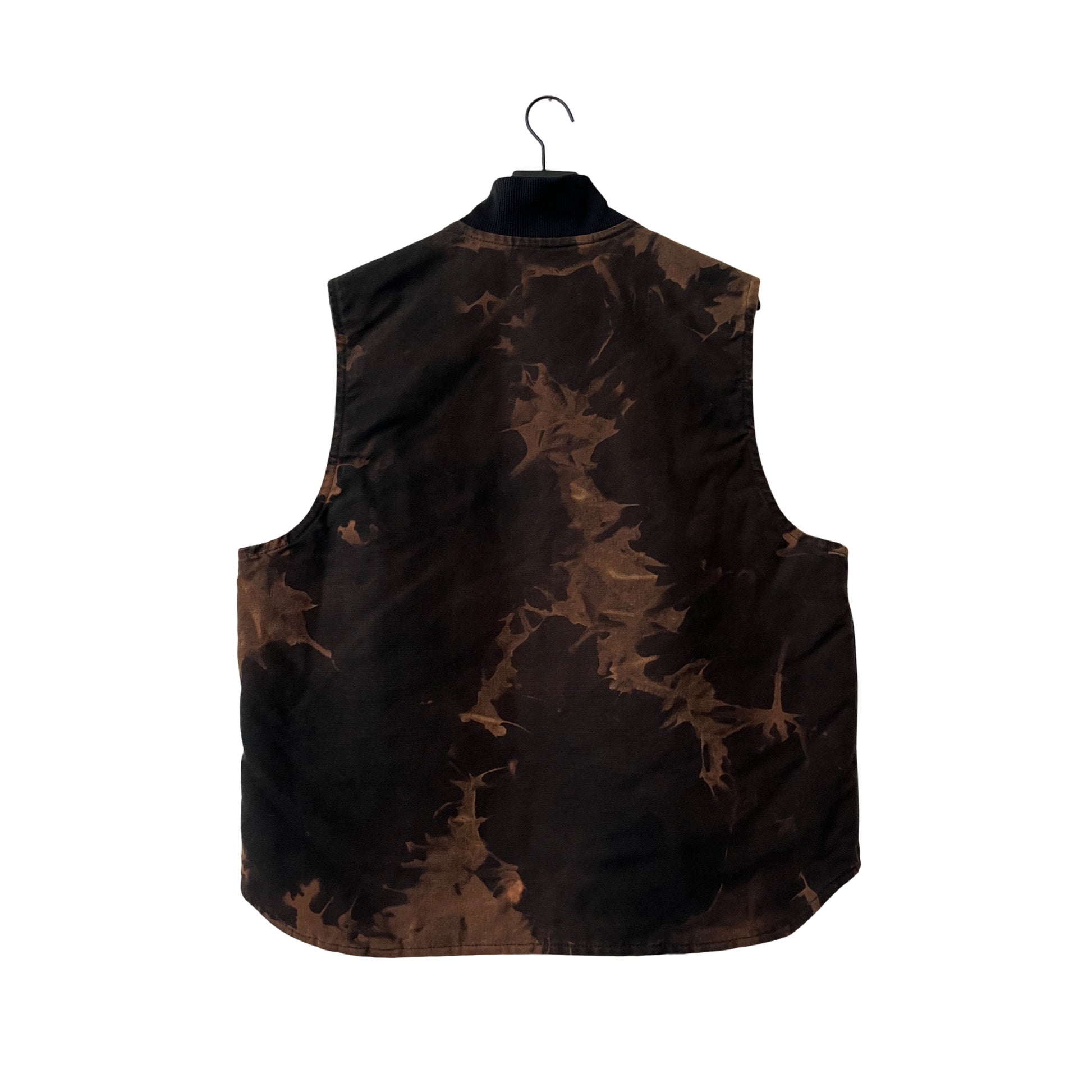 Vest began as solid black prior to receiving a bleach treatment, resulting in a vaporous finish of rust, copper, brown, and black tones.