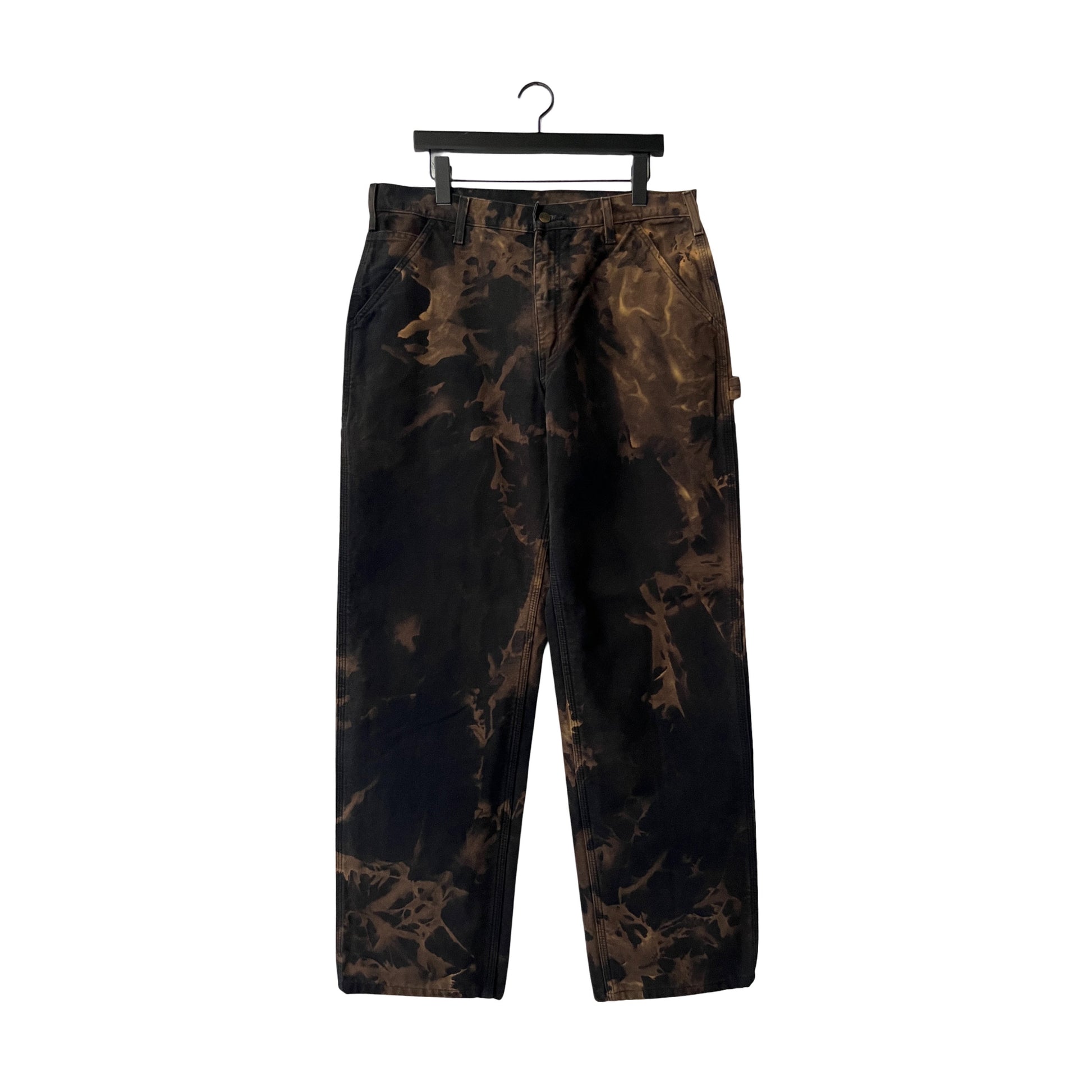 Pants began as solid black prior to receiving a bleach treatment. The result is a vaporous finish with tones of rust, copper, and brown.