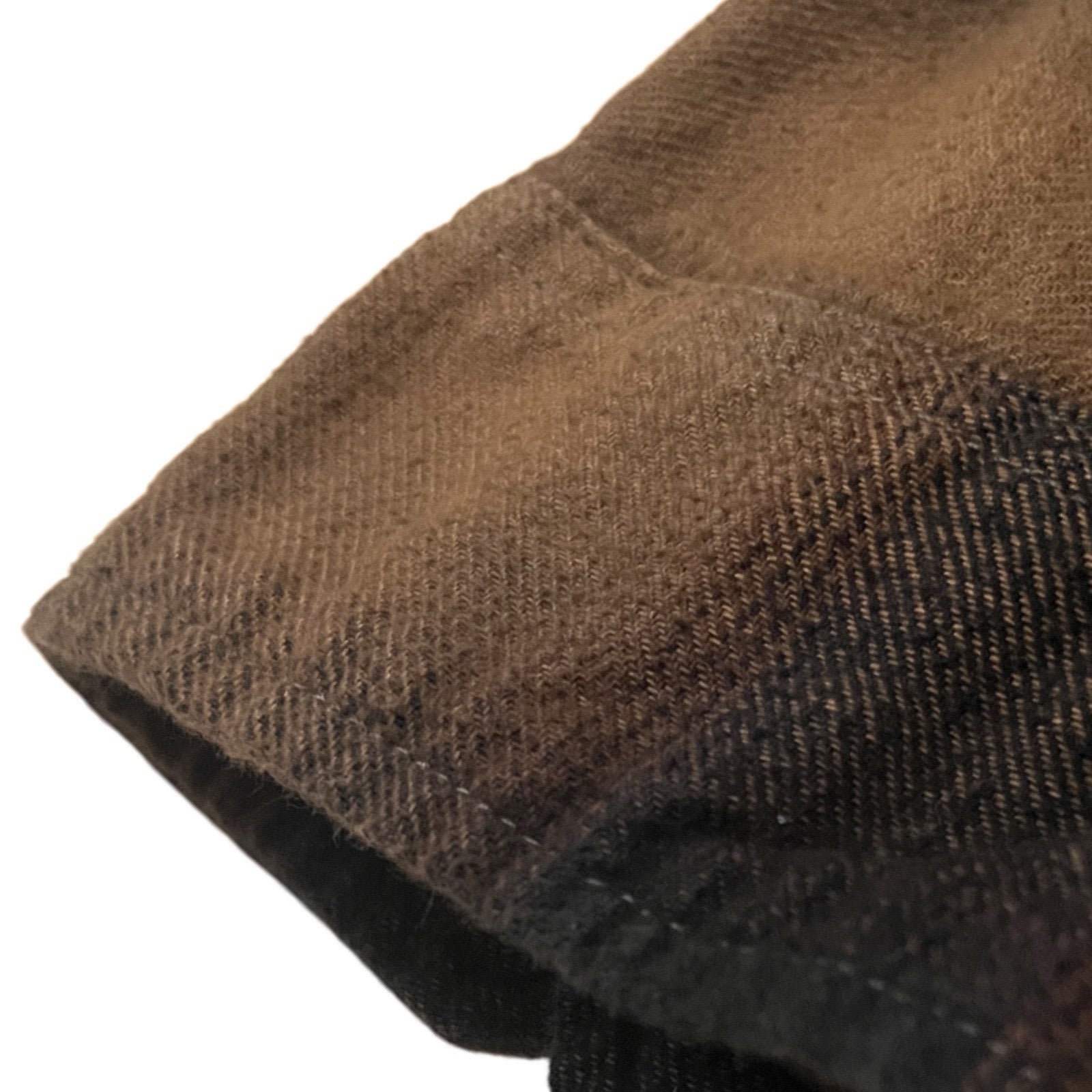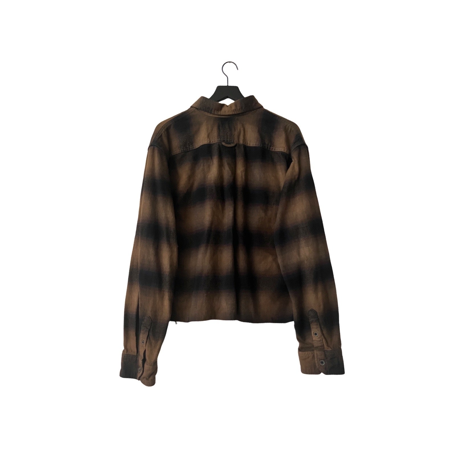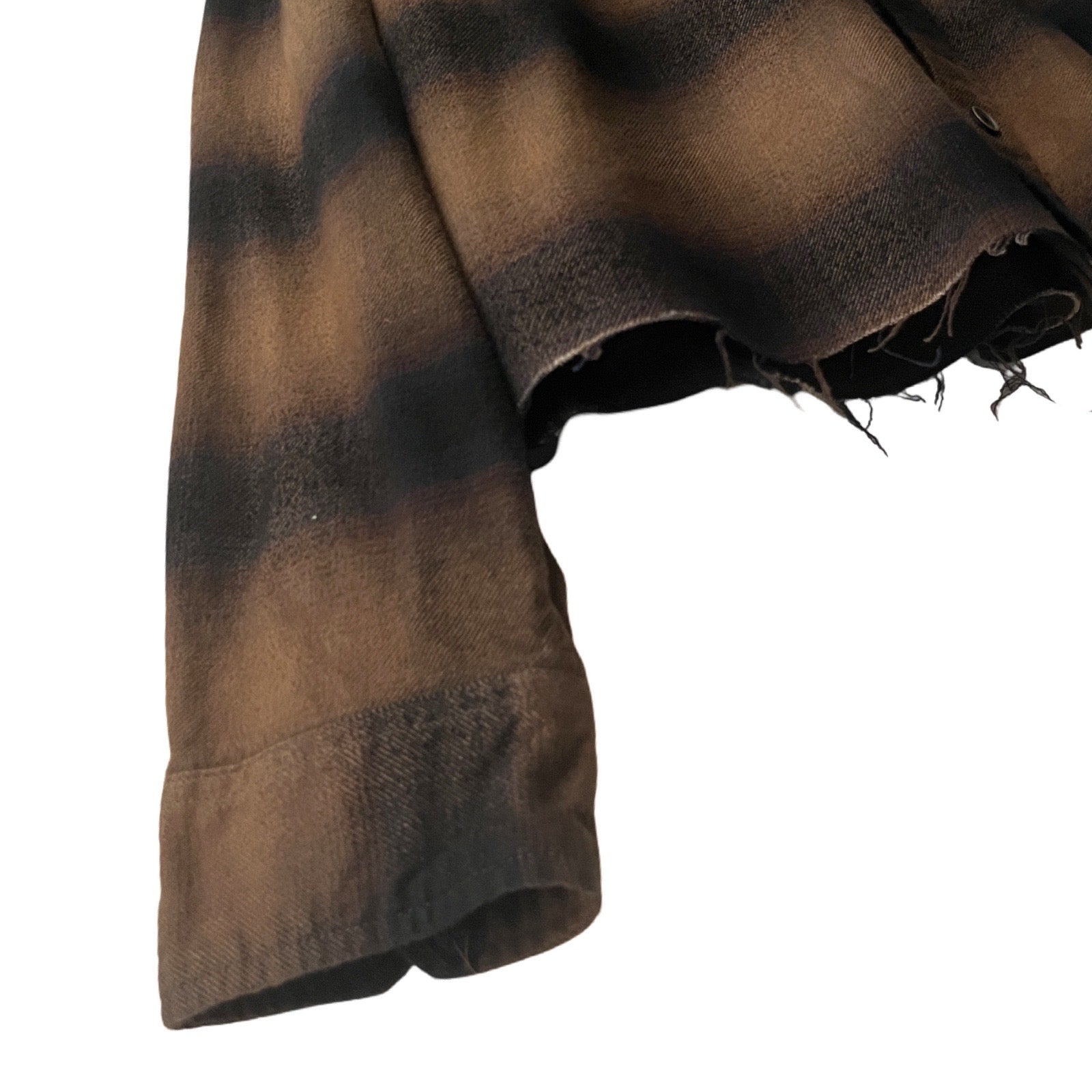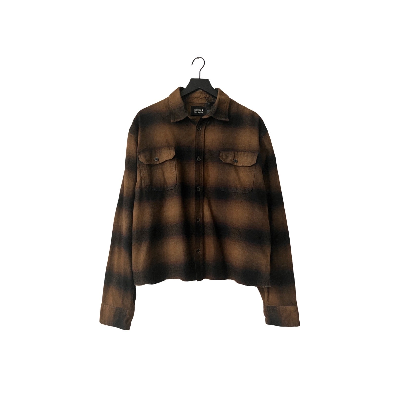 This is a custom, 1 of 1, cropped flannel shirt. It has a very soft hand feel and a raw bottom hem. Fit is designed to hit just below beltline, as an oversized cropped look.