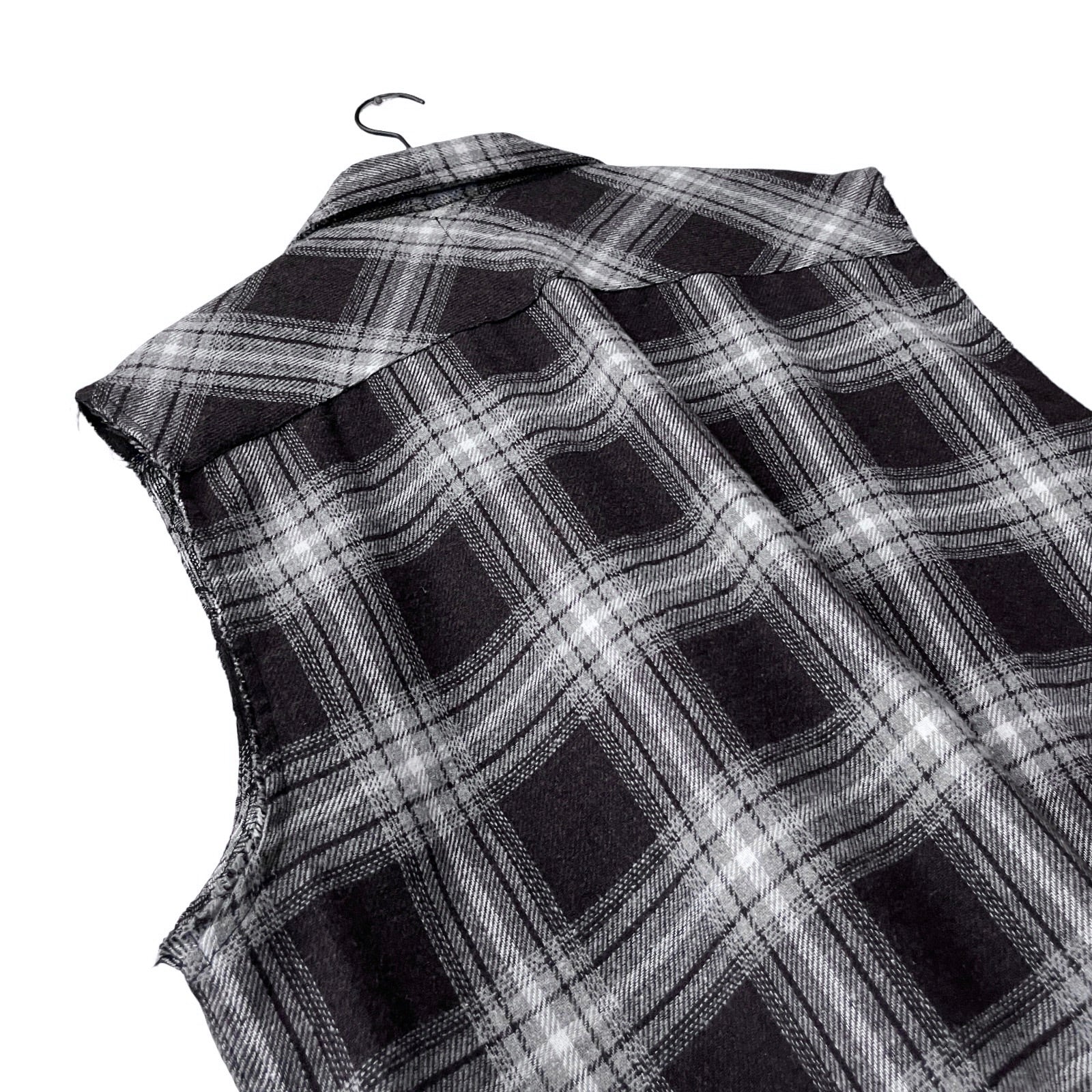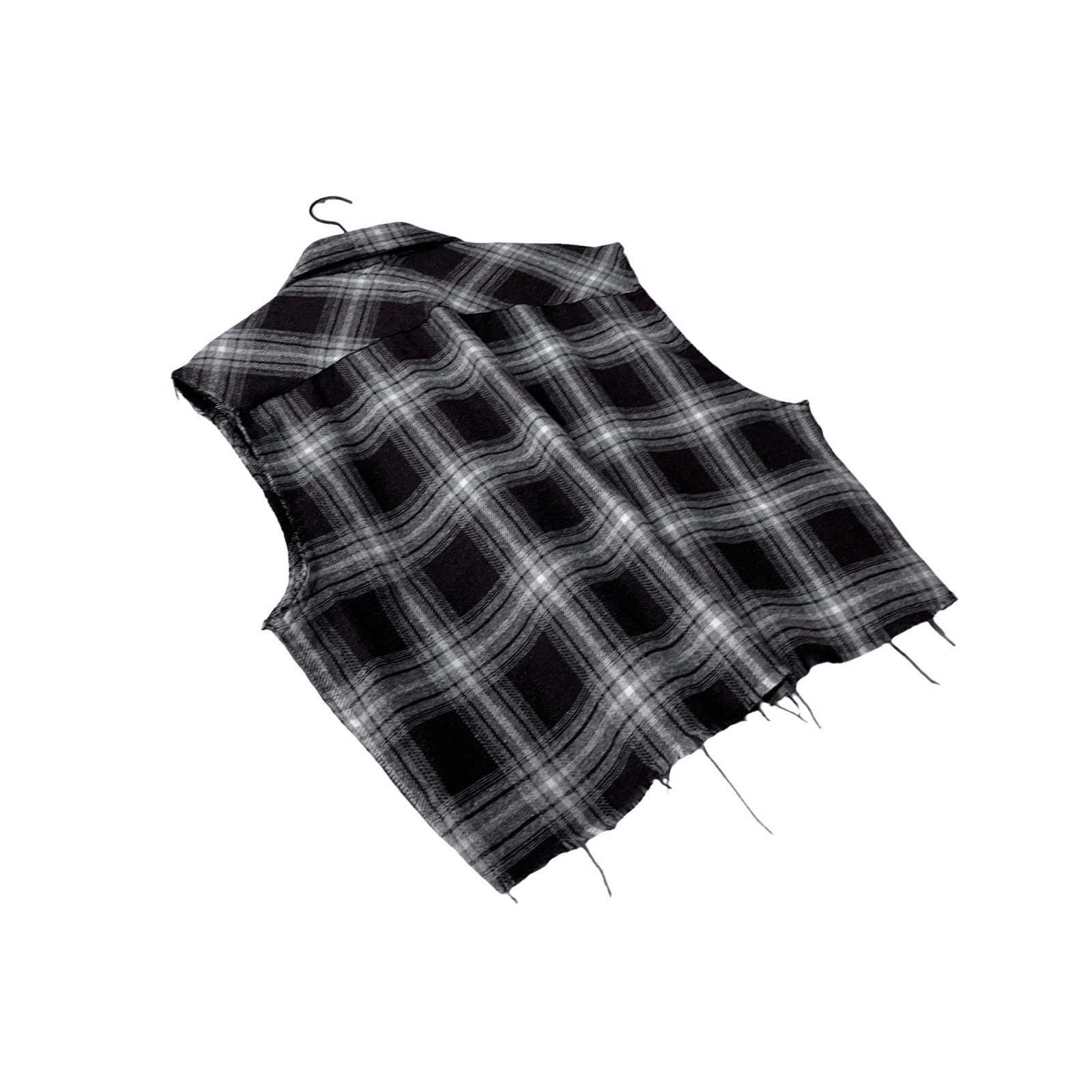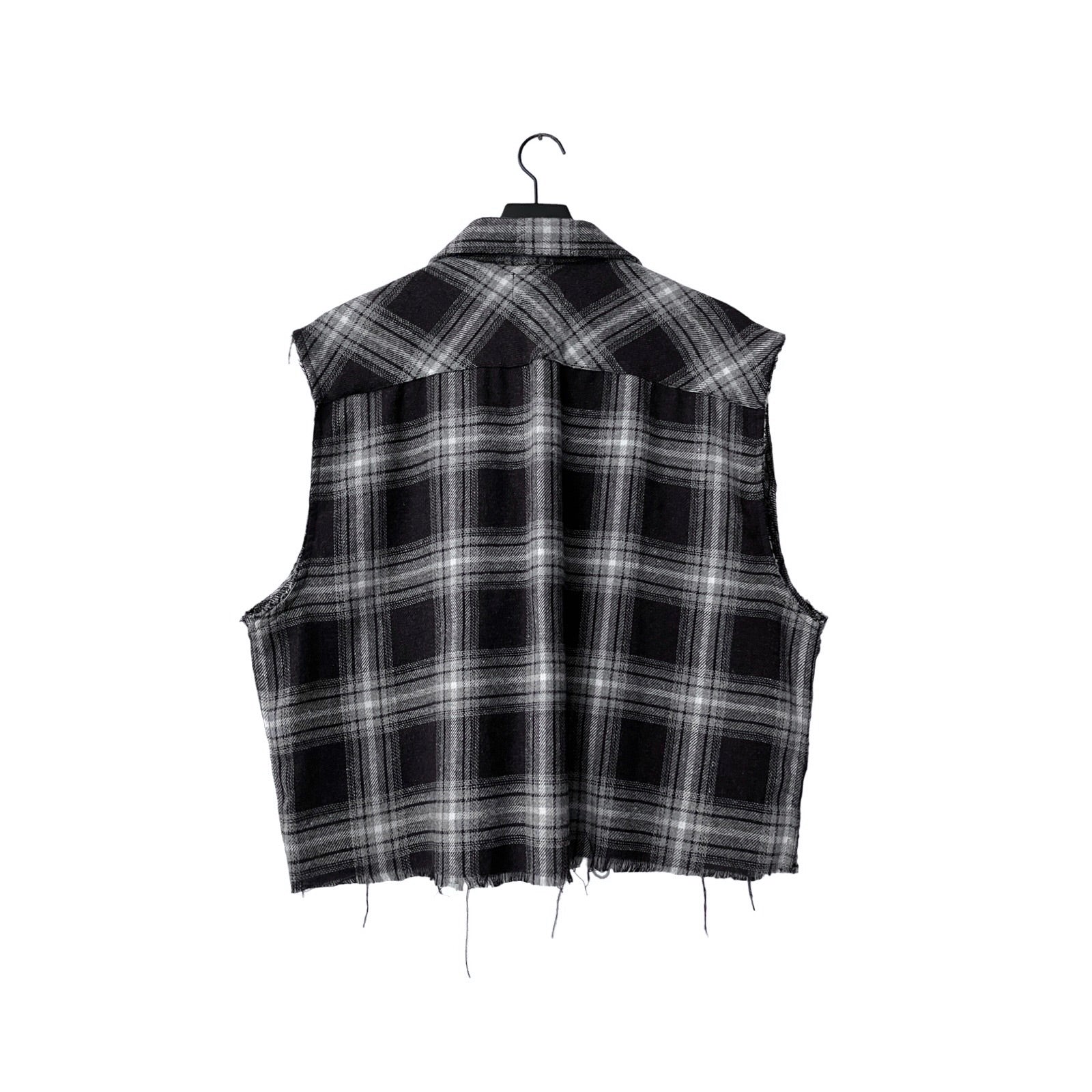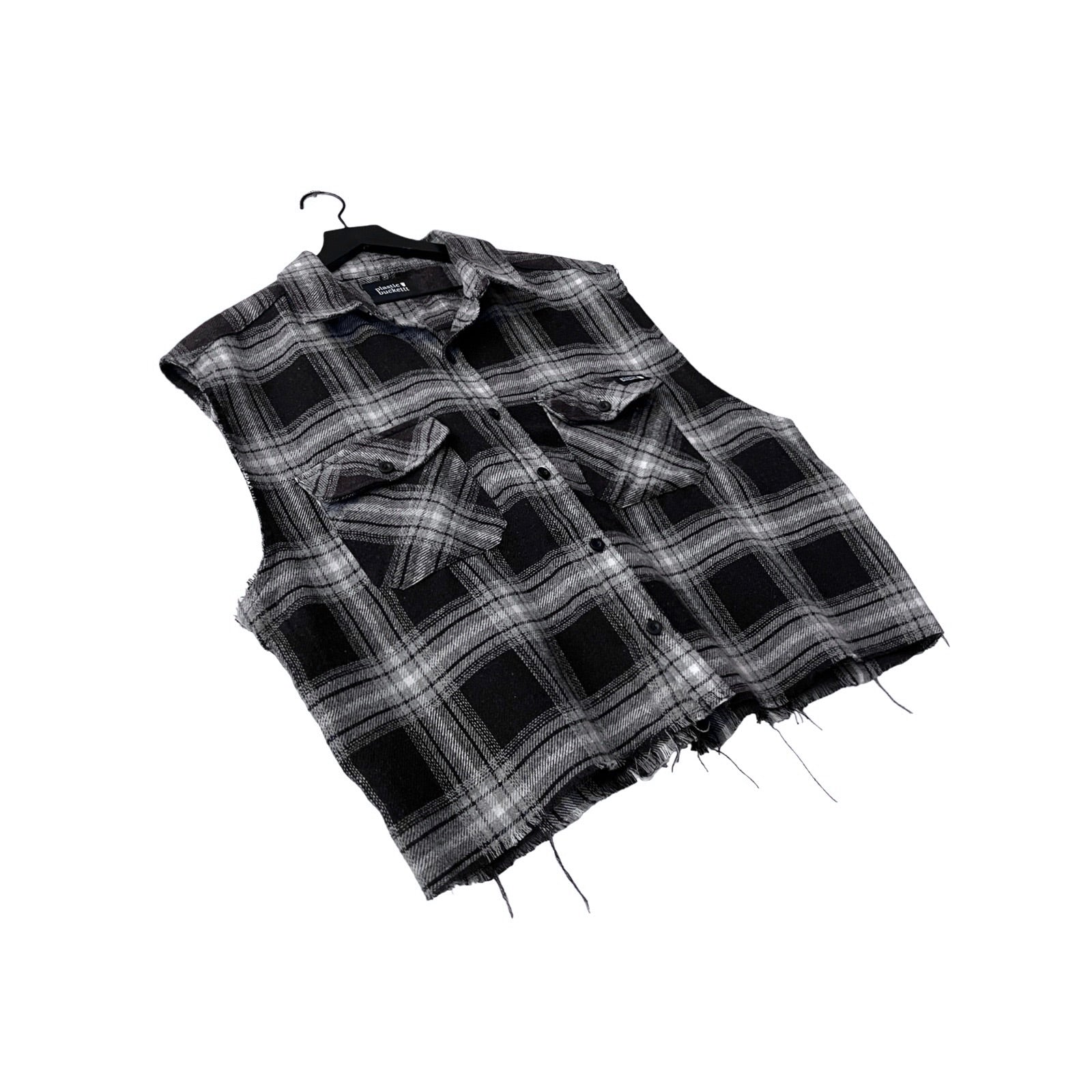 All units began as a black and white plaid long sleeve shirt prior to receiving a bleach treatment and having the arms cut off and the bottom hem cropped. The finish is a brown and white plaid with unsewn hems on the shoulders and hip adding a distressed touch.