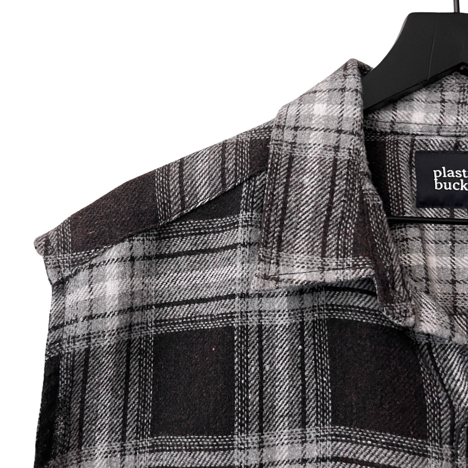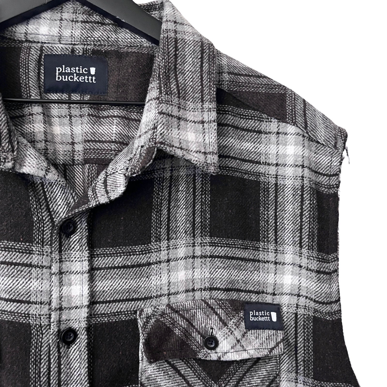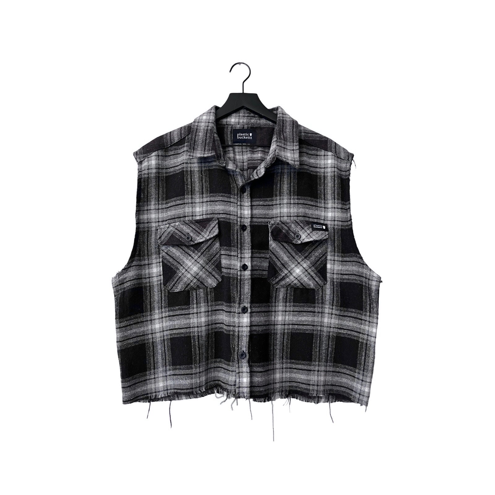 All units began as a black and white plaid long sleeve shirt prior to receiving a bleach treatment and having the arms cut off and the bottom hem cropped. The finish is a brown and white plaid with unsewn hems on the shoulders and hip adding a distressed touch.