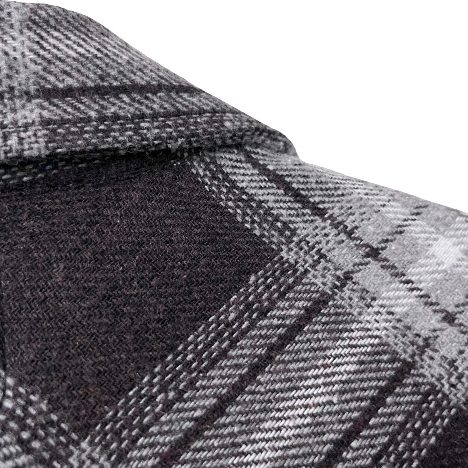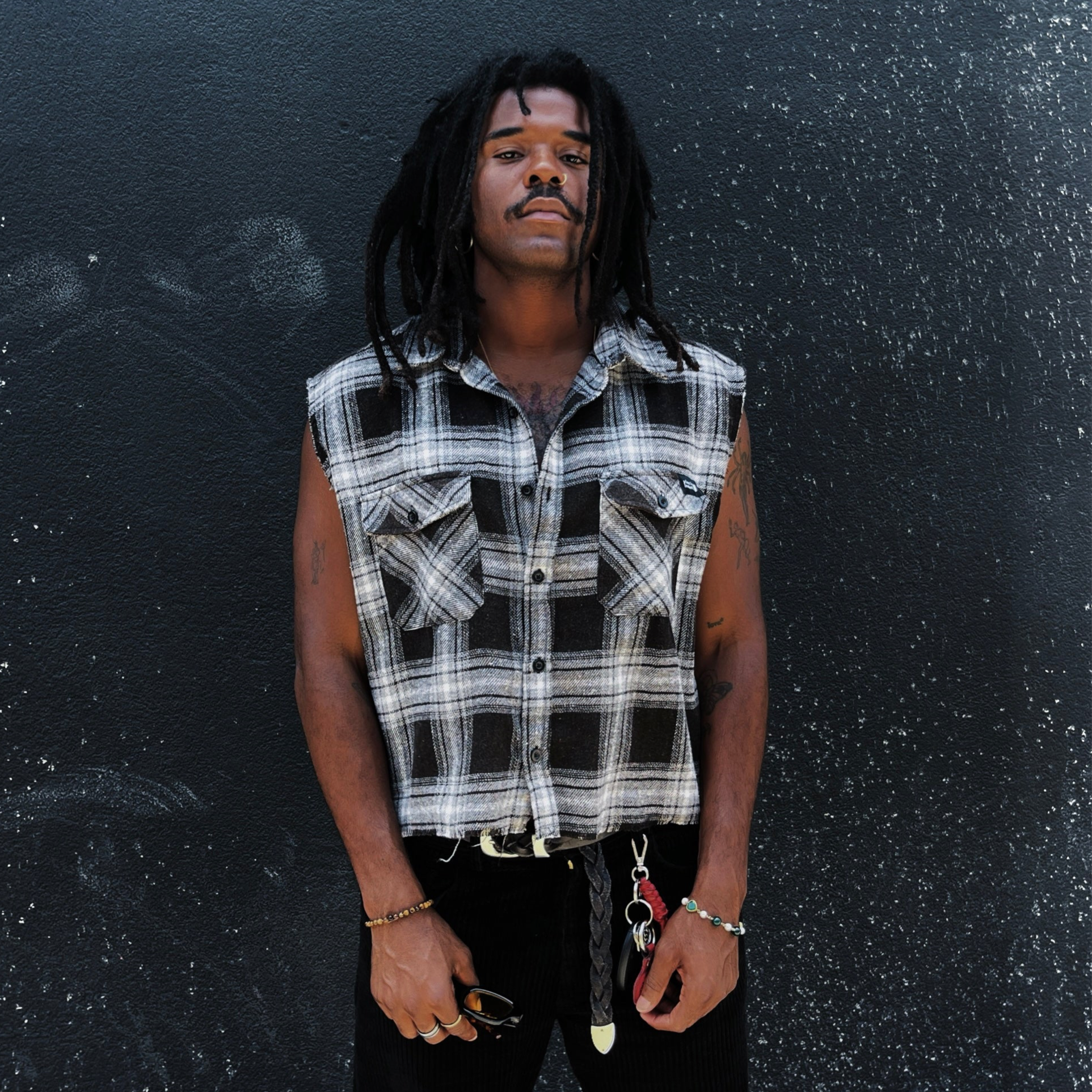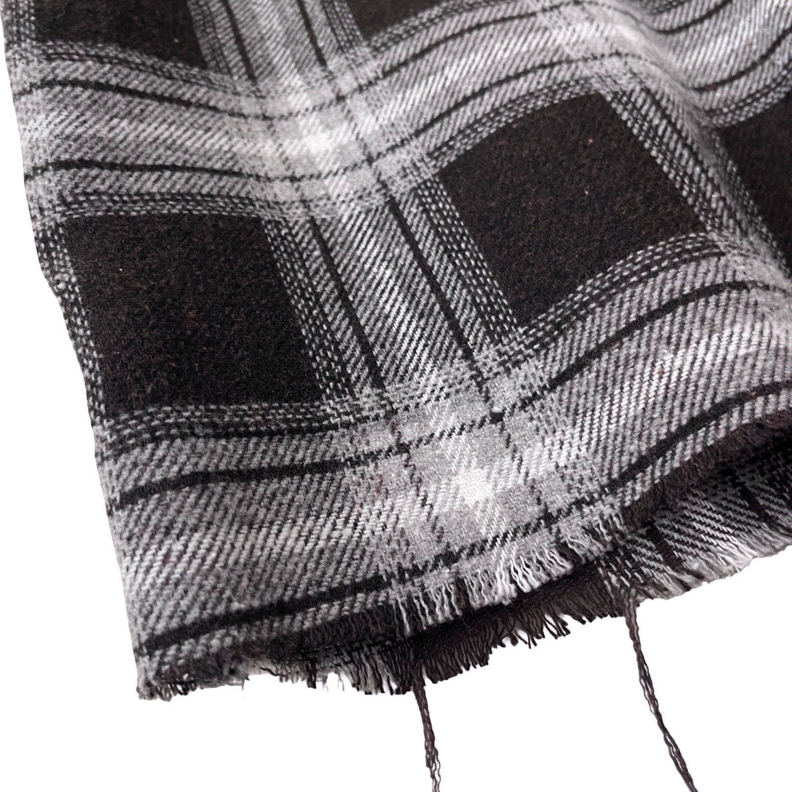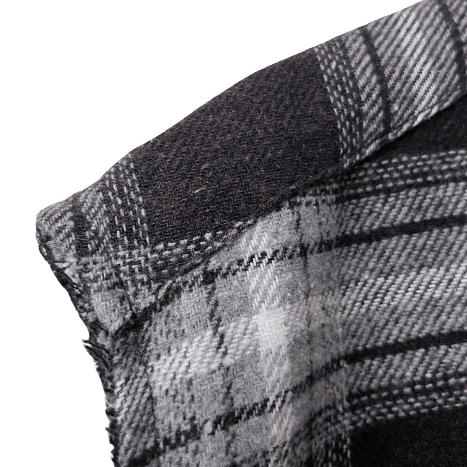 All units began as a black and white plaid long sleeve shirt prior to receiving a bleach treatment and having the arms cut off and the bottom hem cropped. The finish is a brown and white plaid with unsewn hems on the shoulders and hip adding a distressed touch.