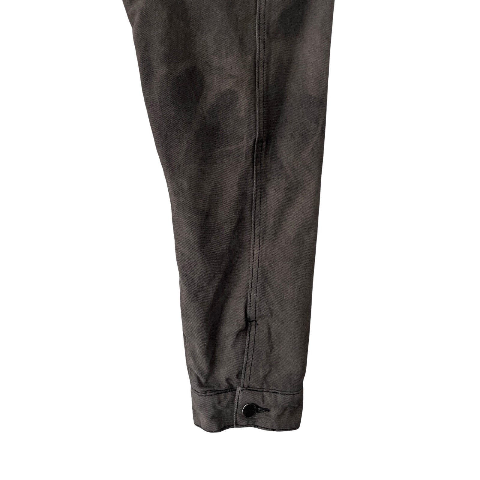 It started as solid black prior to receiving a bleach wash out treatment and an overdye treatment, producing a cloudy mixture of warm grey and hazy brown tones.