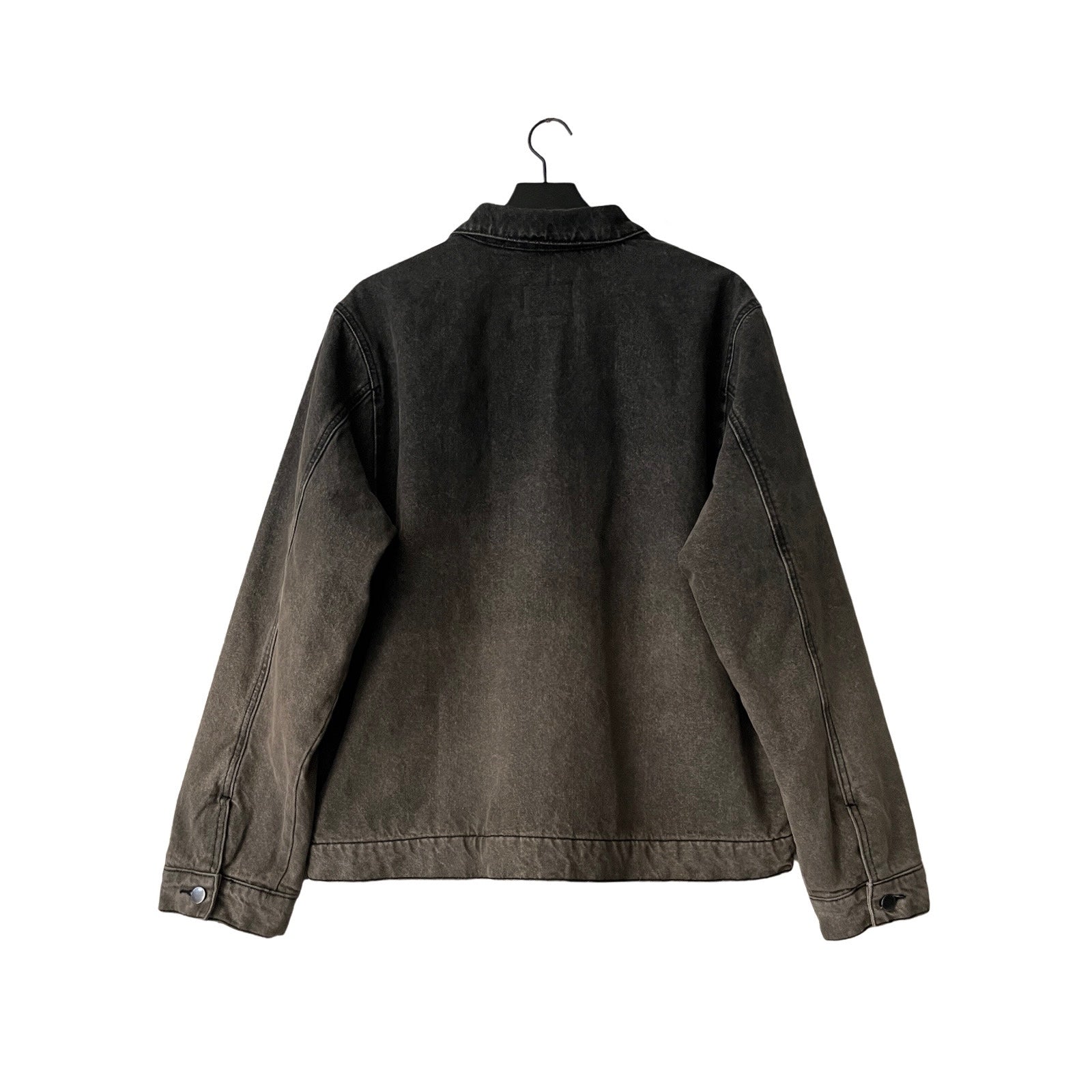 It started as solid black prior to receiving a bleach gradient wash out treatment, producing a vertical, ombre fade of grey tones.