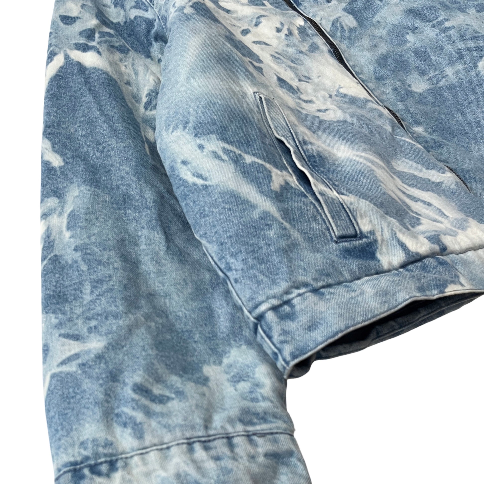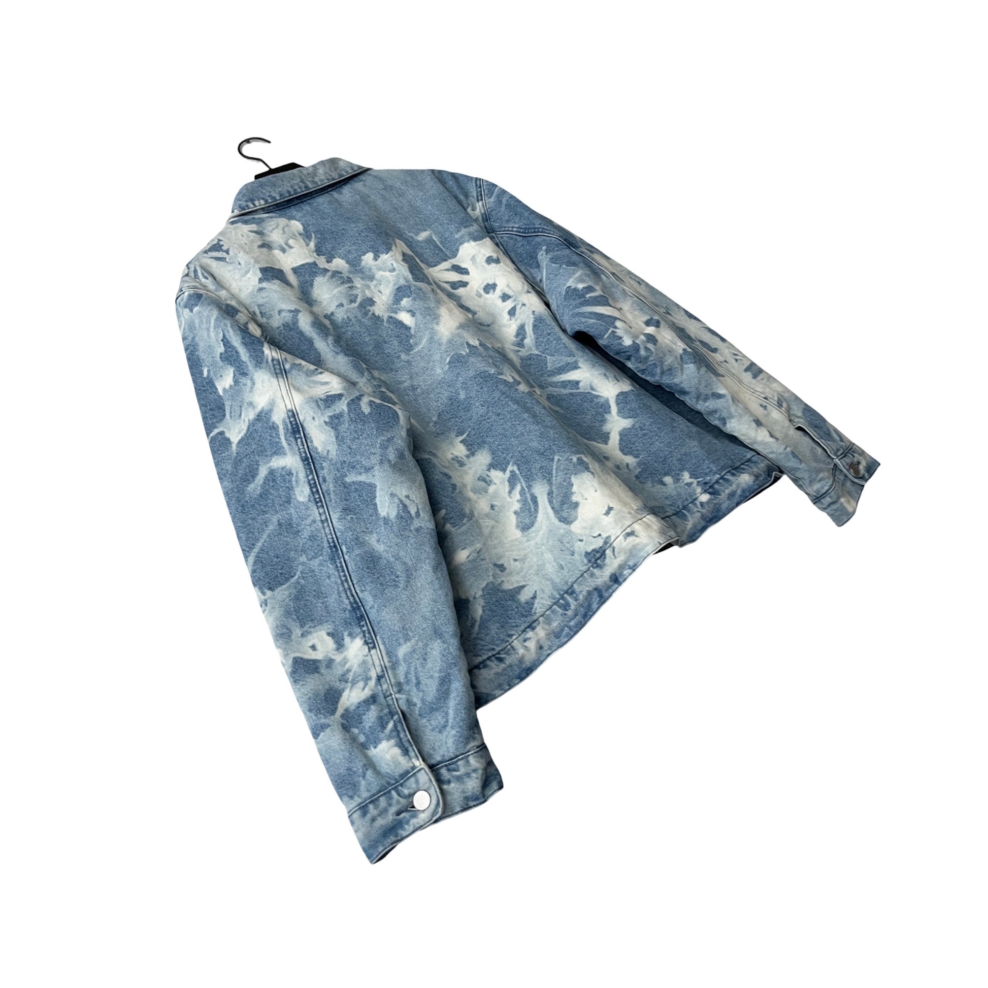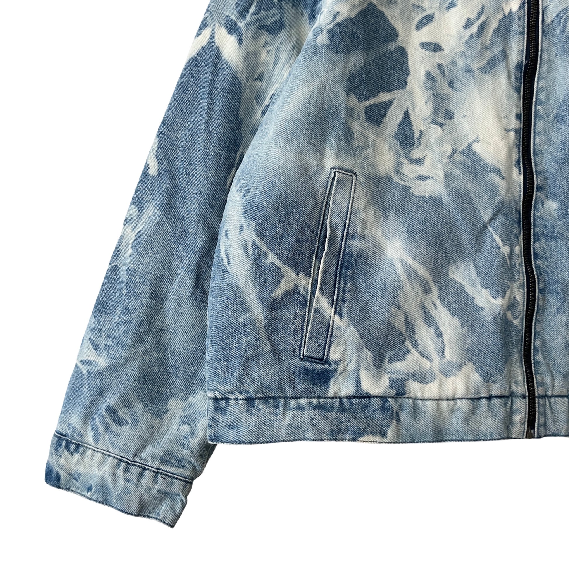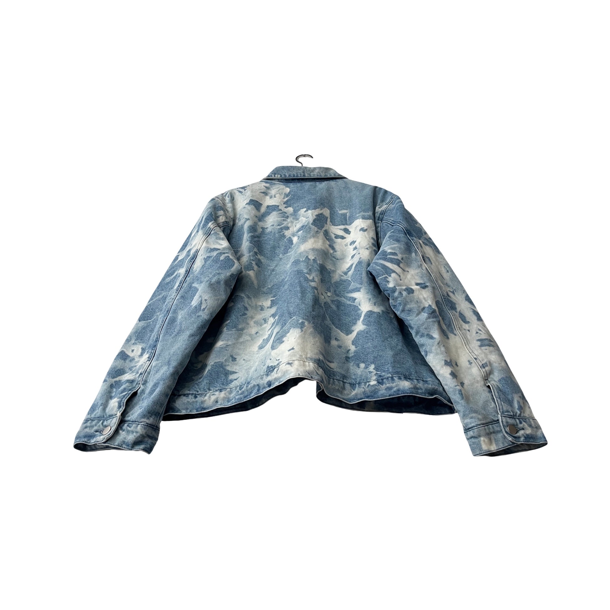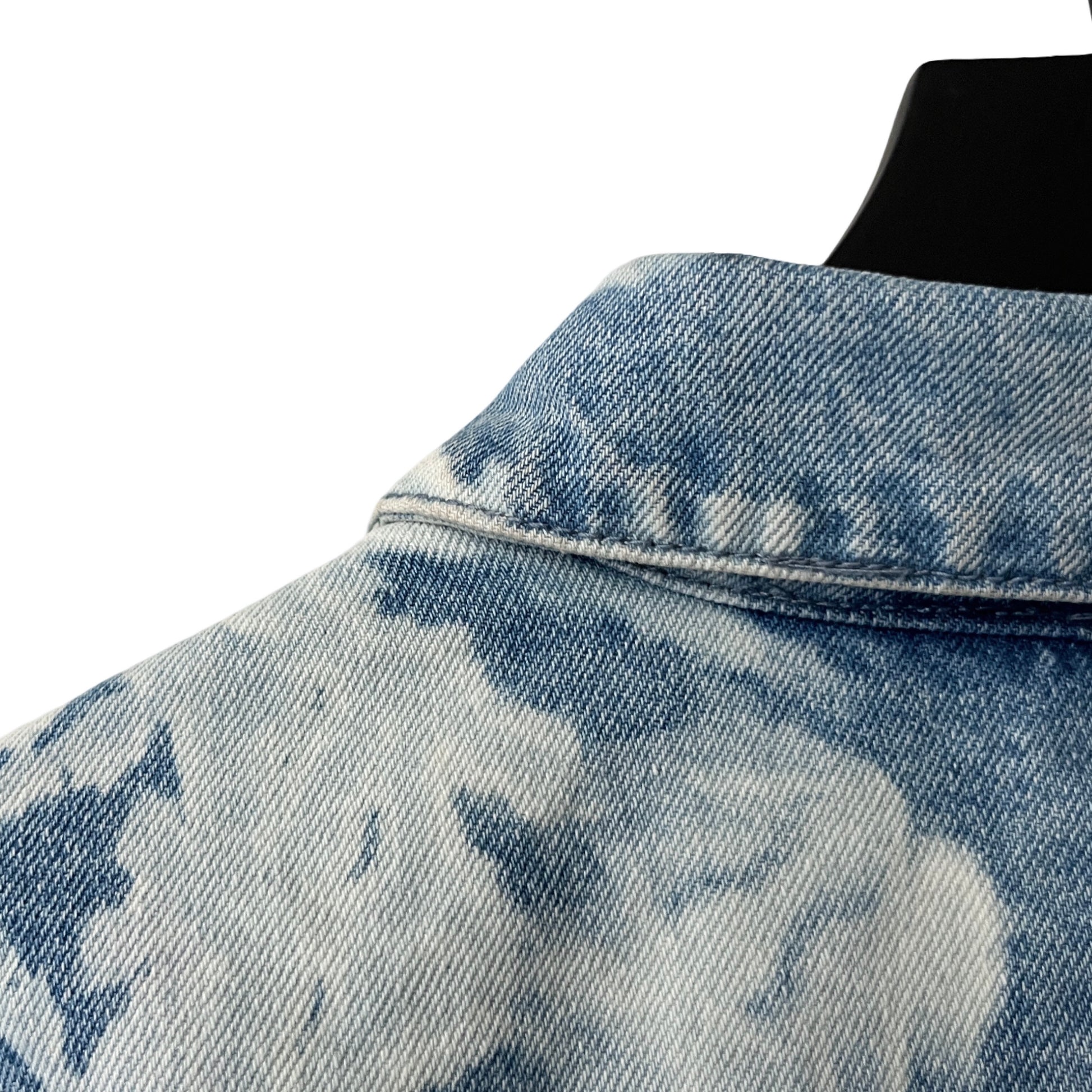 It started as a solid medium blue prior to receiving a bleach treatment, producing a washy, cloudy mixture of light blue and white tones.