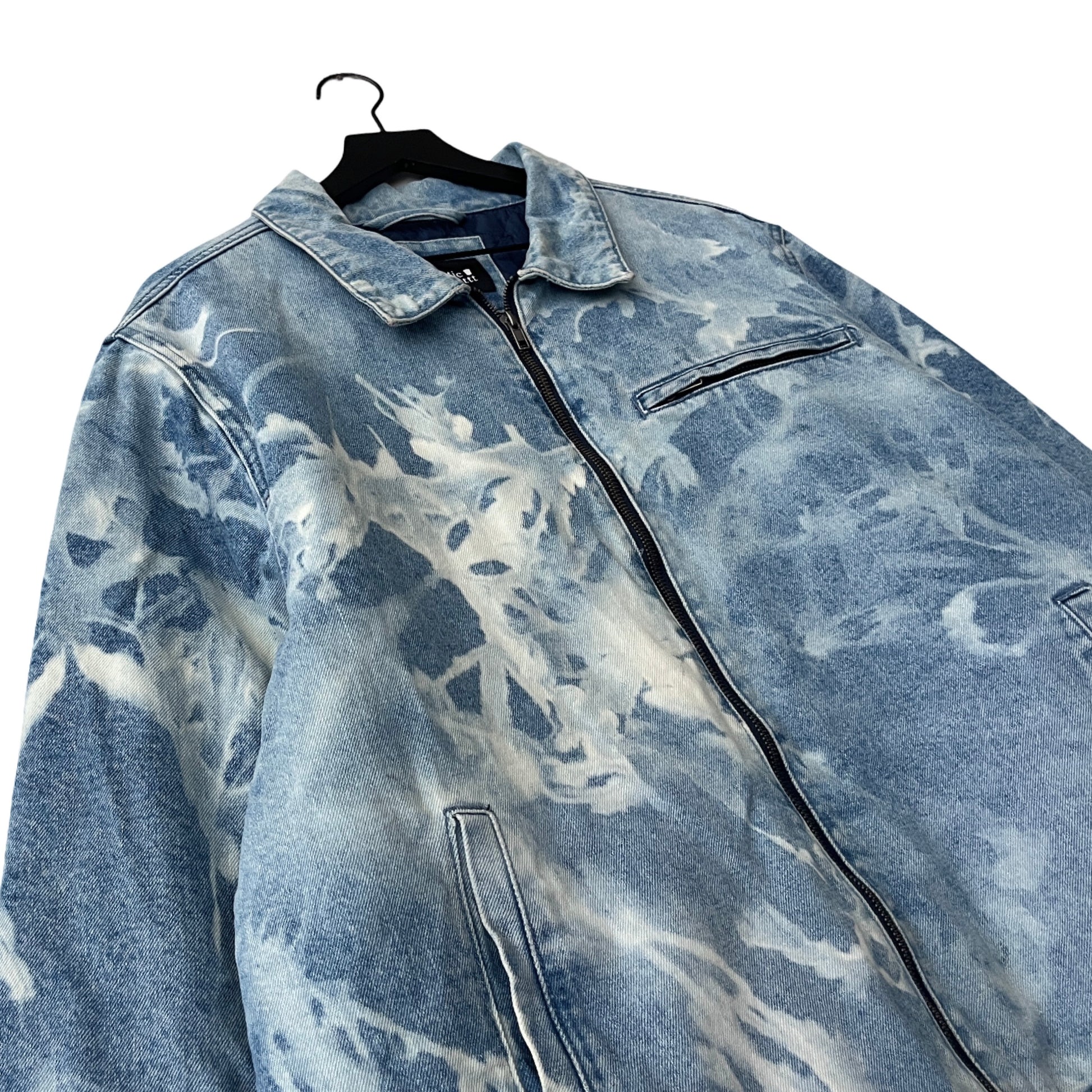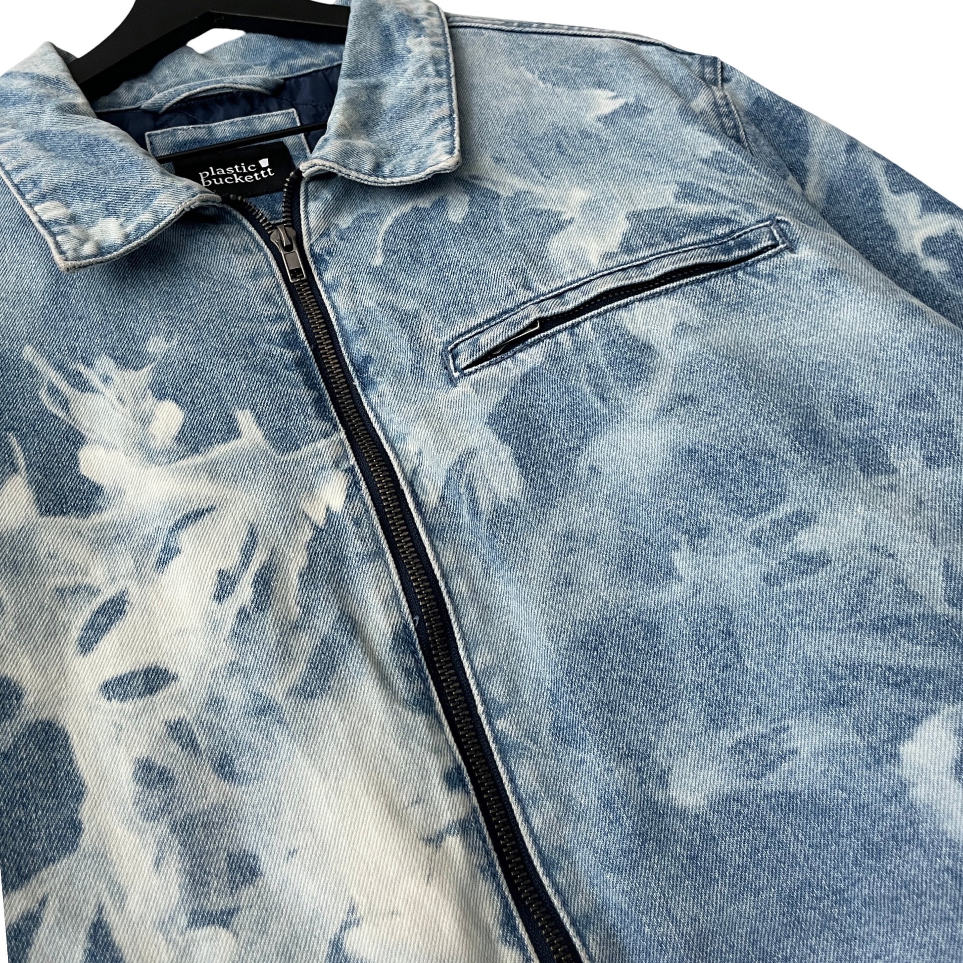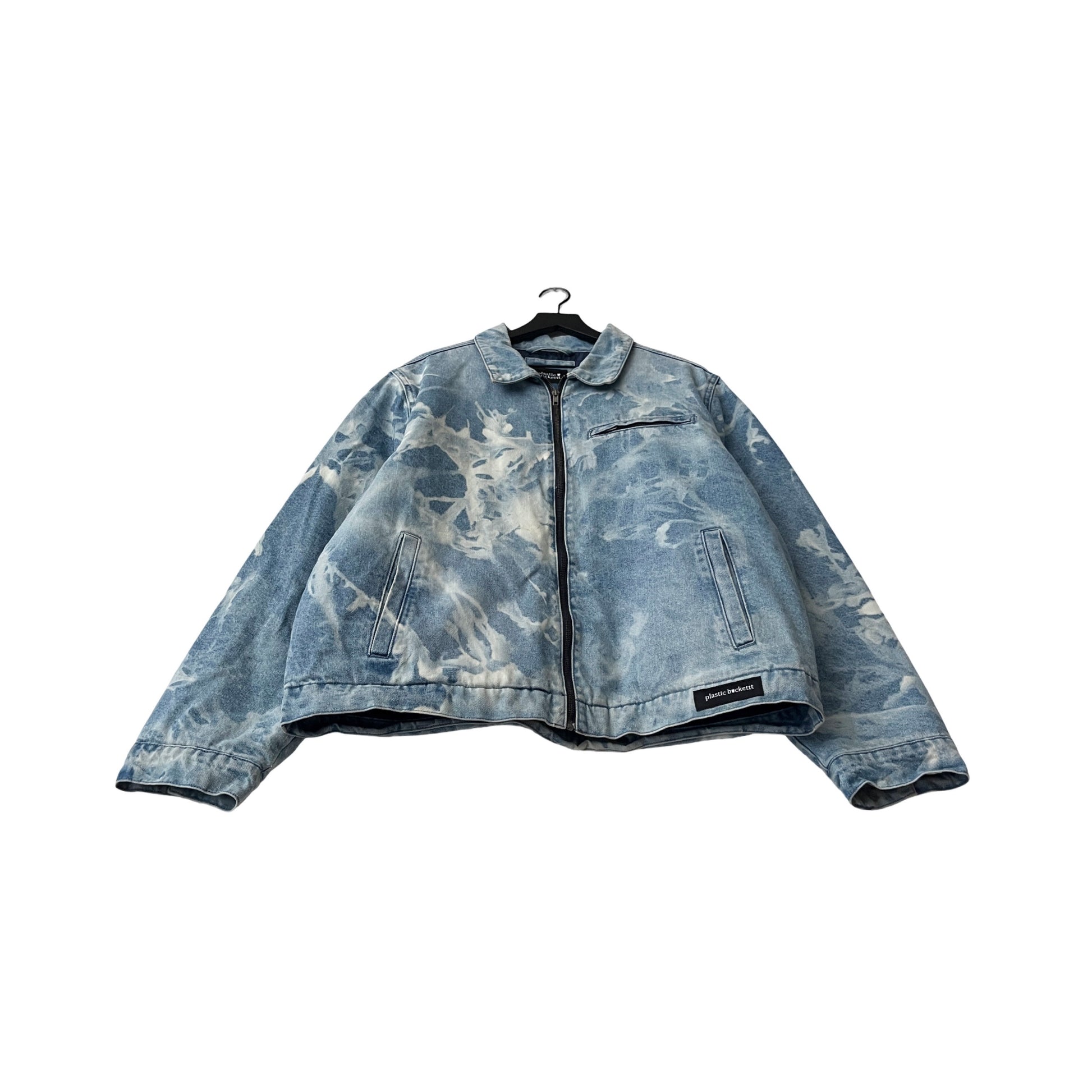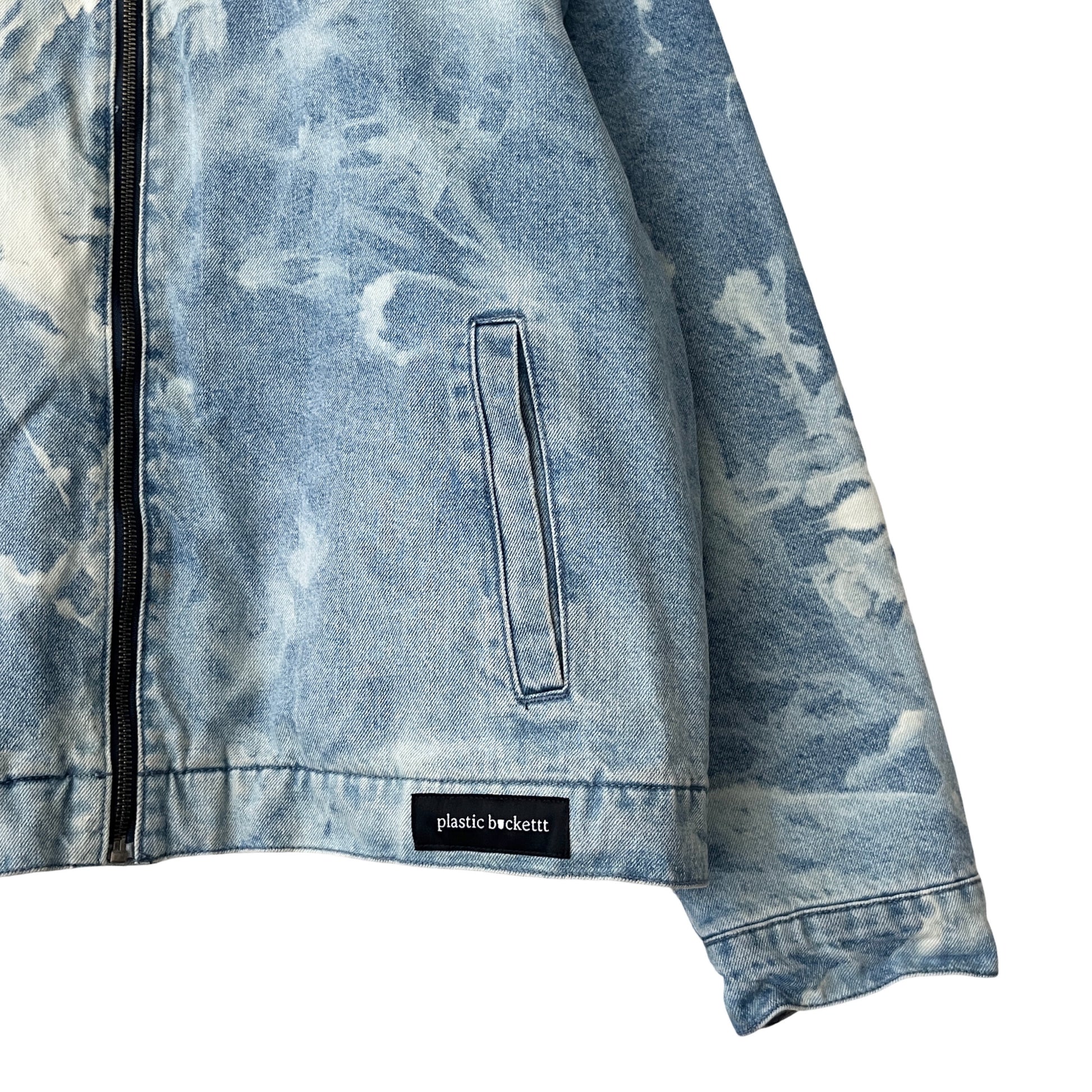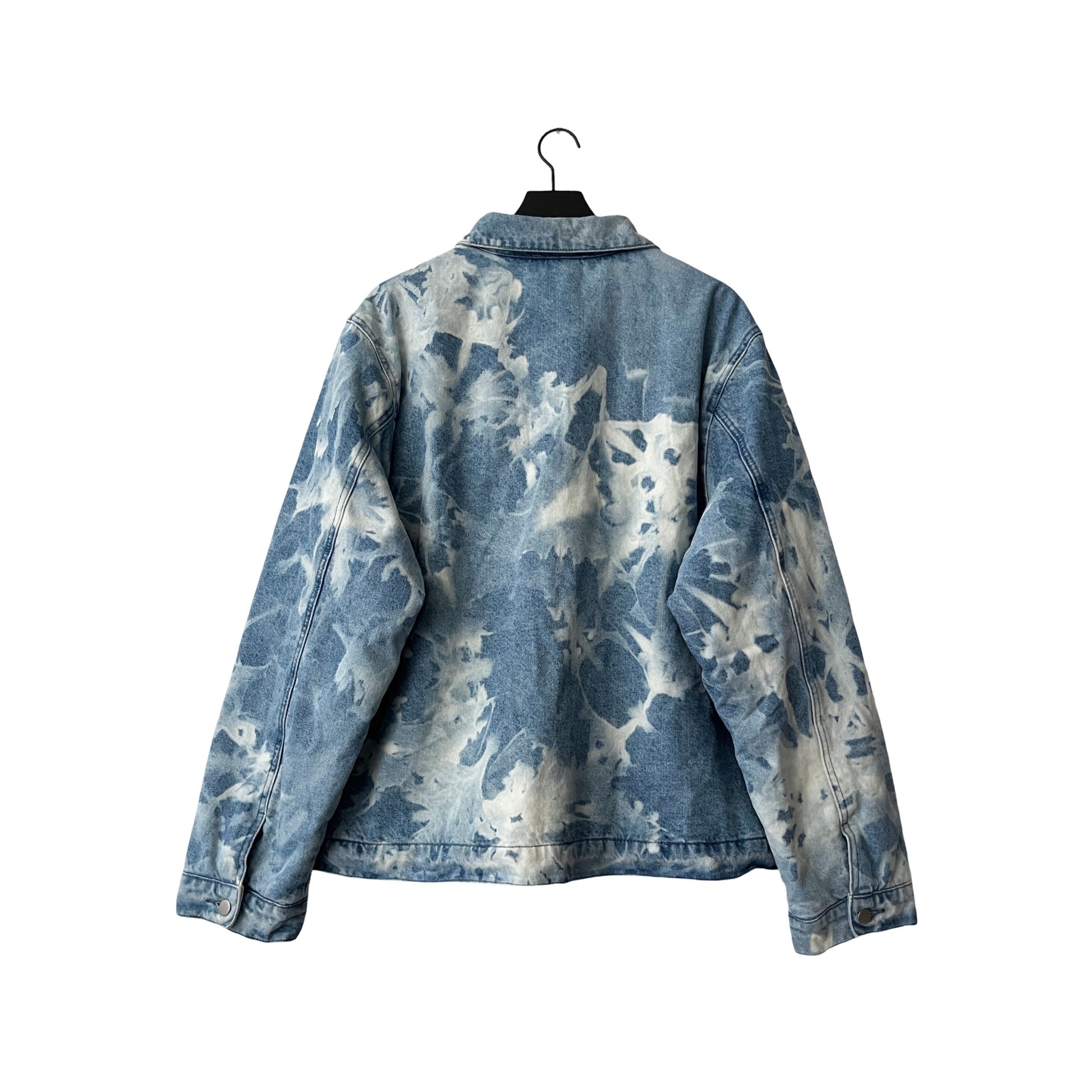 It started as a solid medium blue prior to receiving a bleach treatment, producing a washy, cloudy mixture of light blue and white tones.