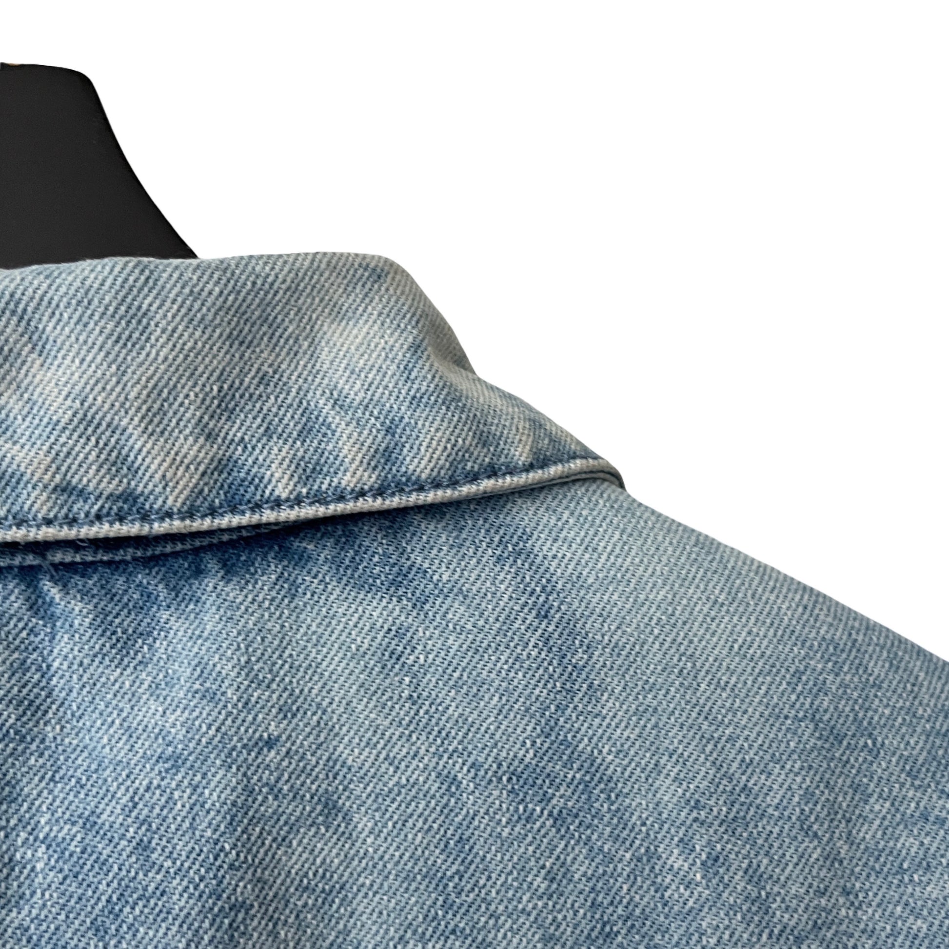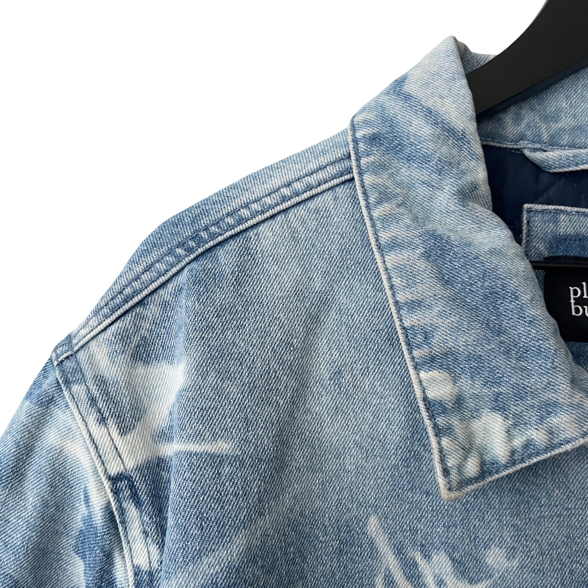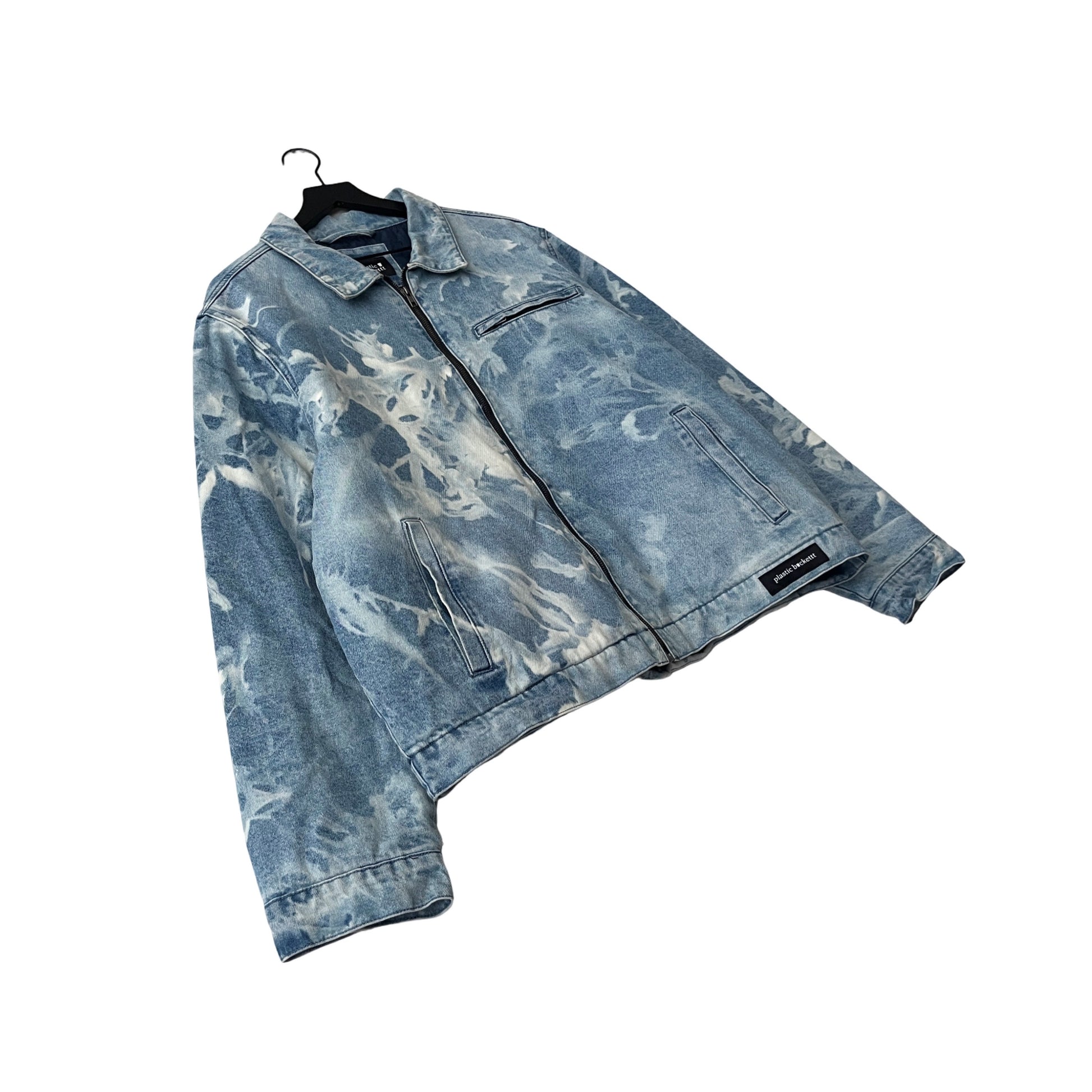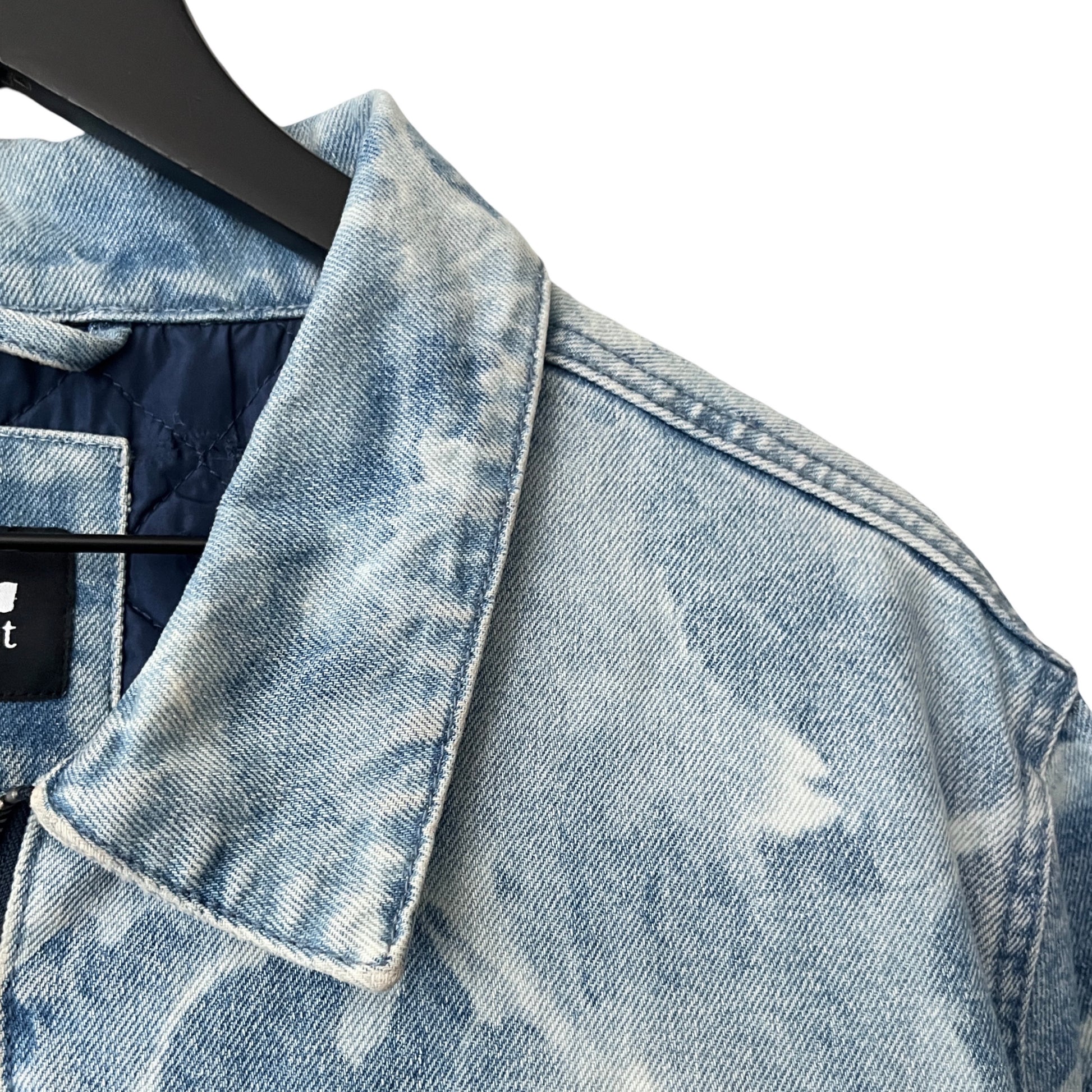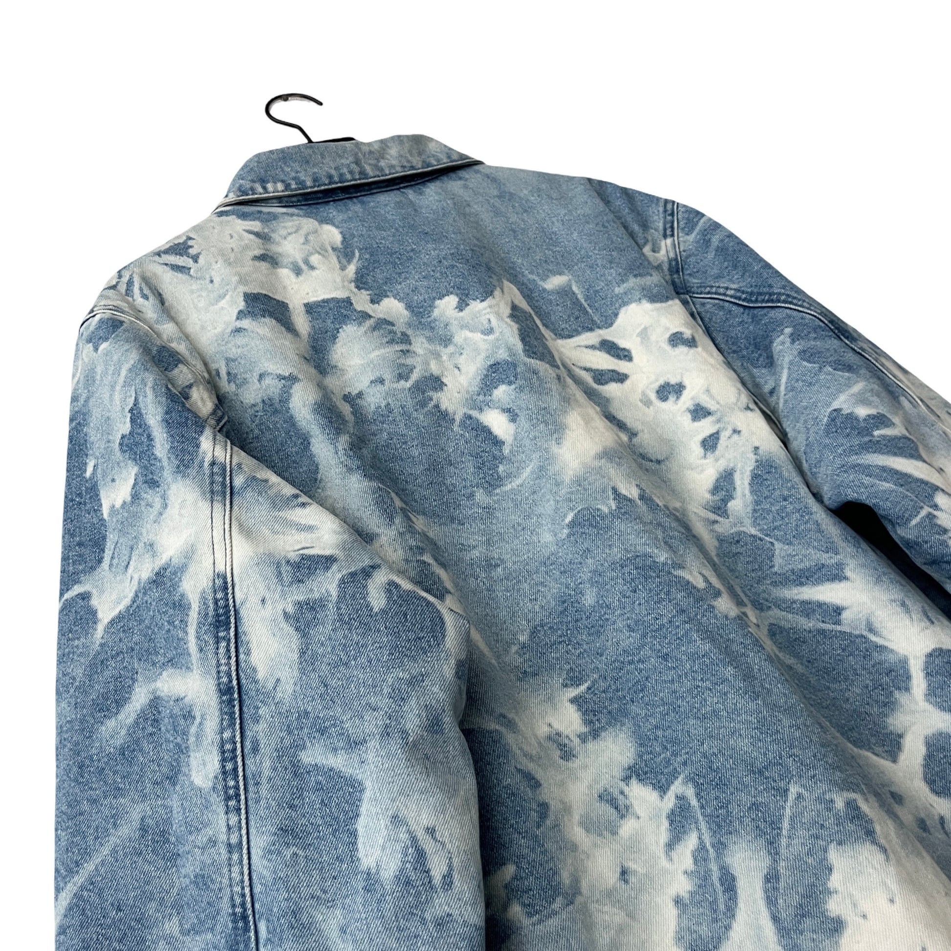 It started as a solid medium blue prior to receiving a bleach treatment, producing a washy, cloudy mixture of light blue and white tones.