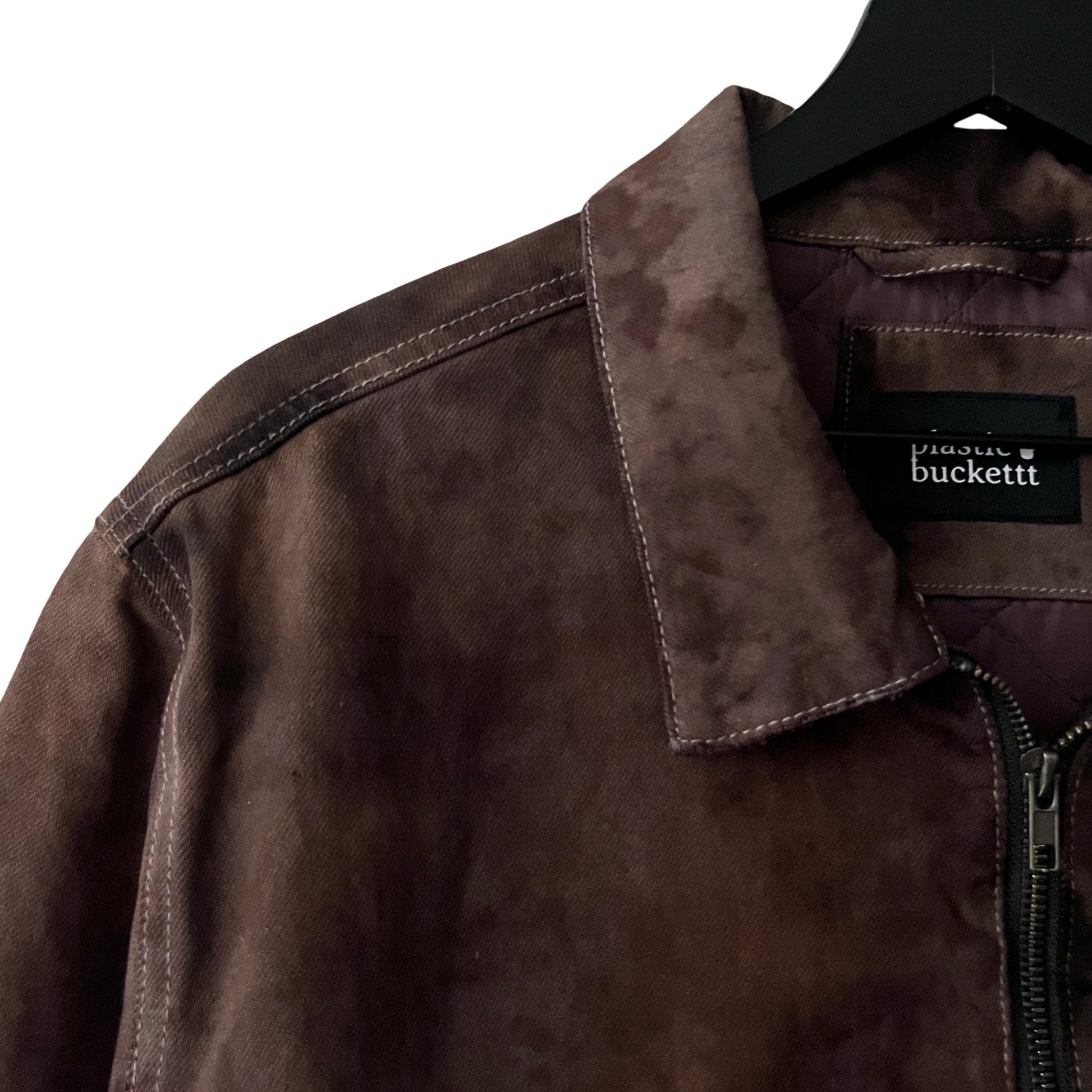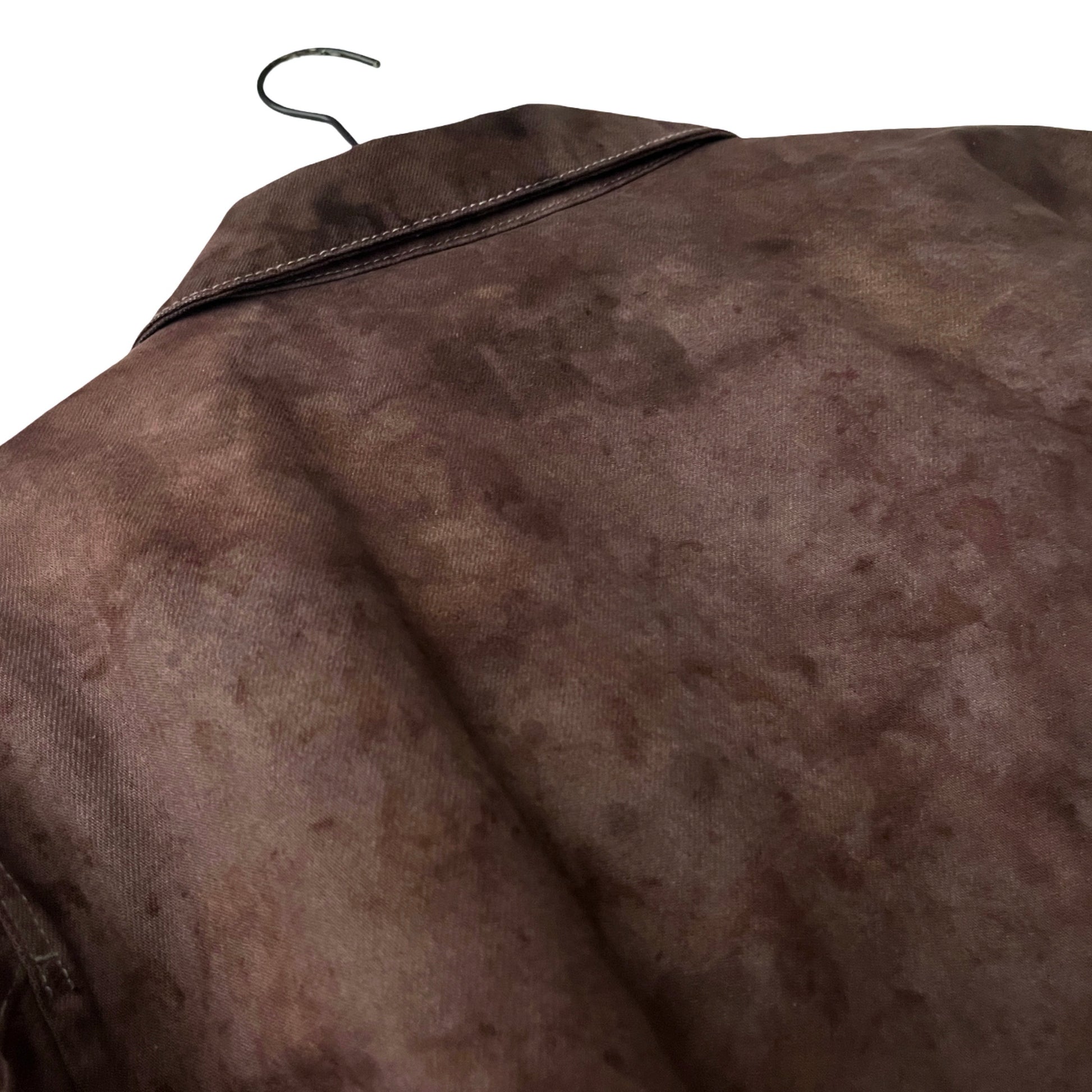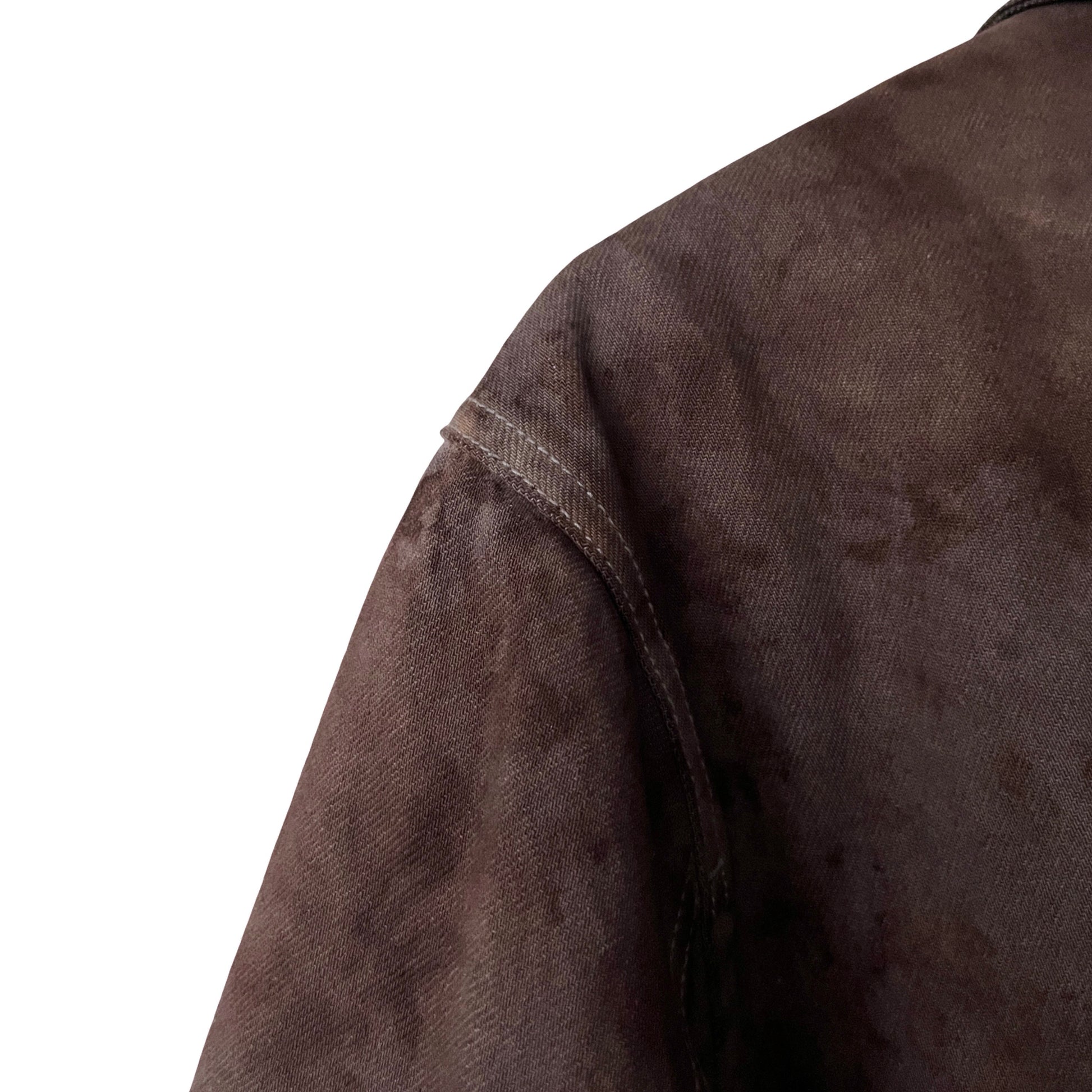 This jacket started as a light blue prior to receiving a complete bleach washout, and then multiple brown overdye treatments, producing a marbled, textured, nuanced, and scattered mixture of brown tones, mimicking textures like aged wood or aged metal.