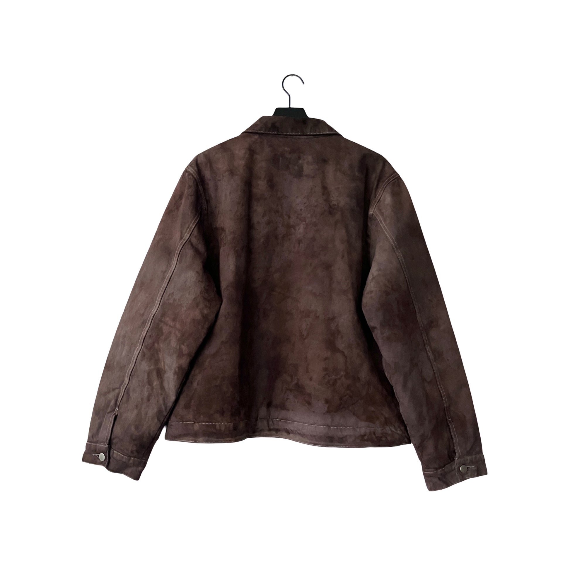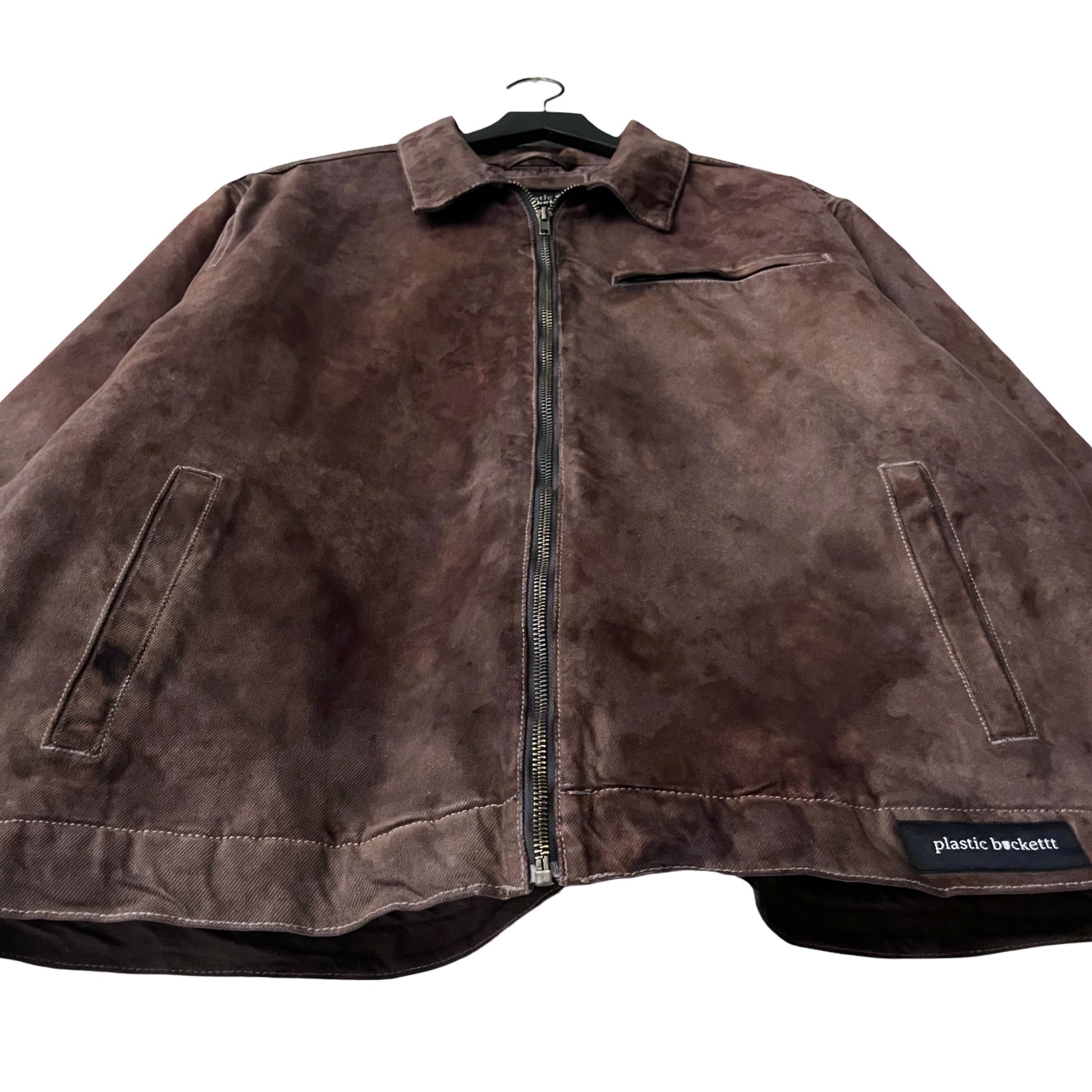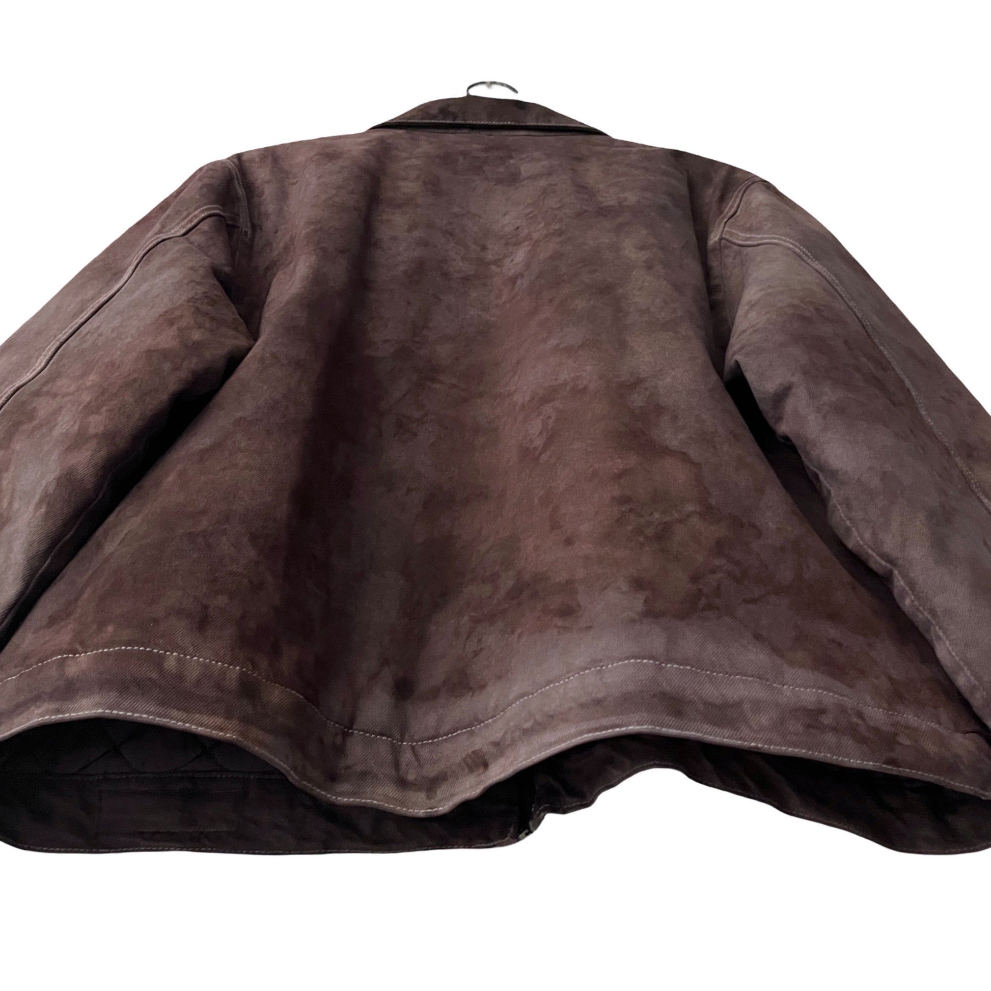 This jacket started as a light blue prior to receiving a complete bleach washout, and then multiple brown overdye treatments, producing a marbled, textured, nuanced, and scattered mixture of brown tones, mimicking textures like aged wood or aged metal.