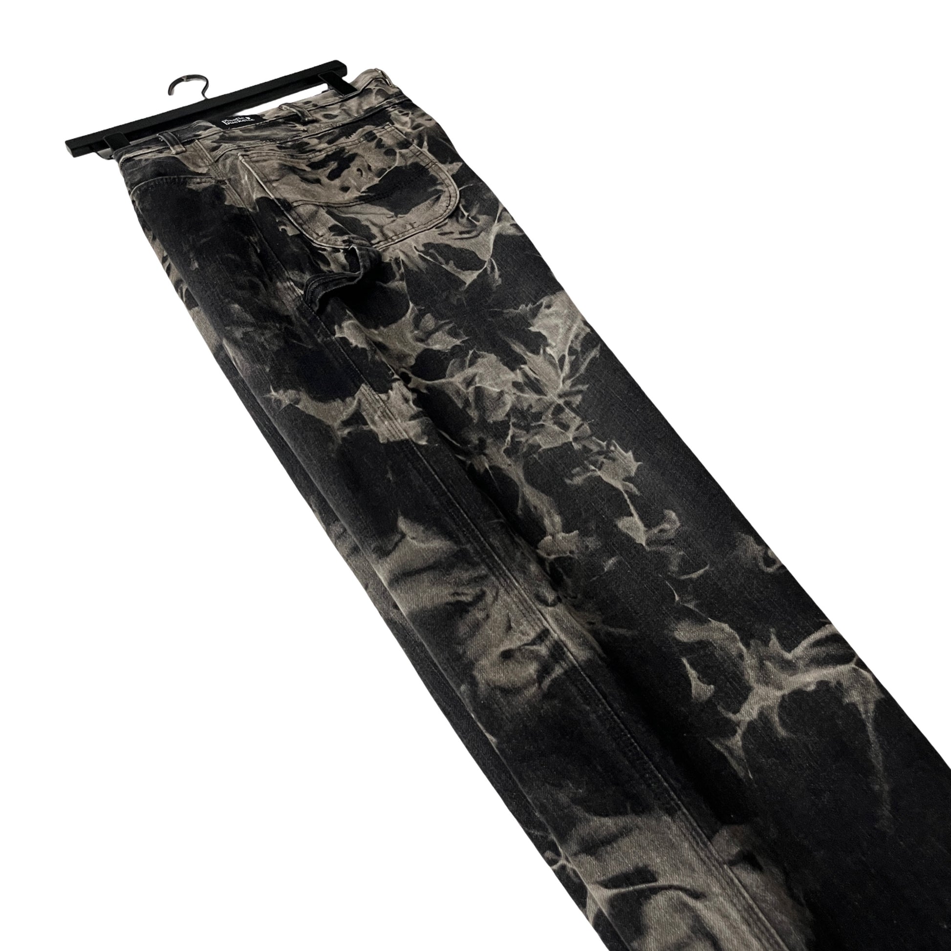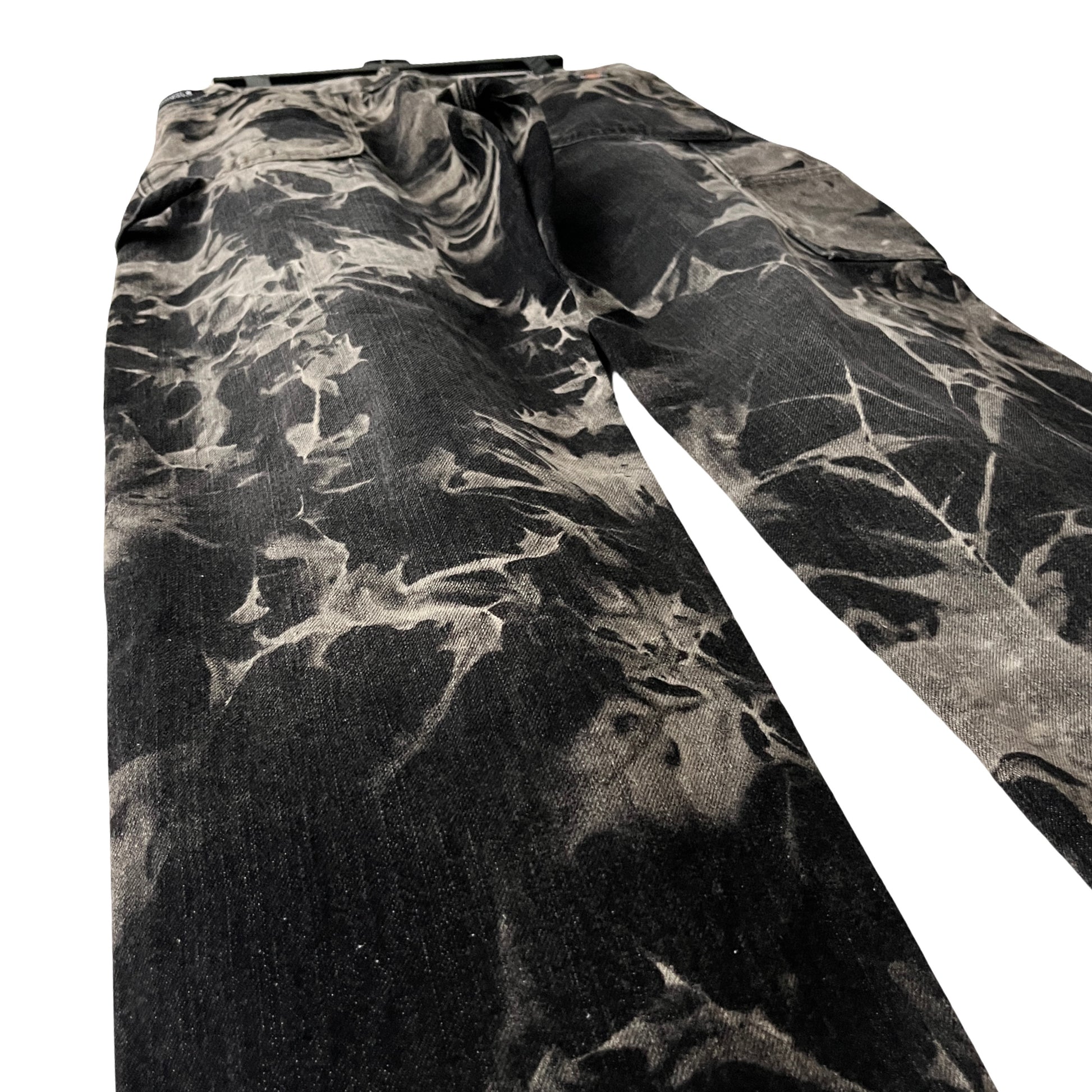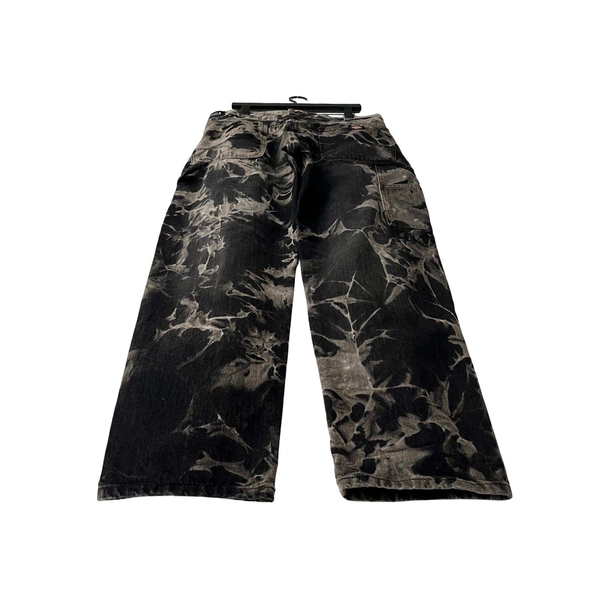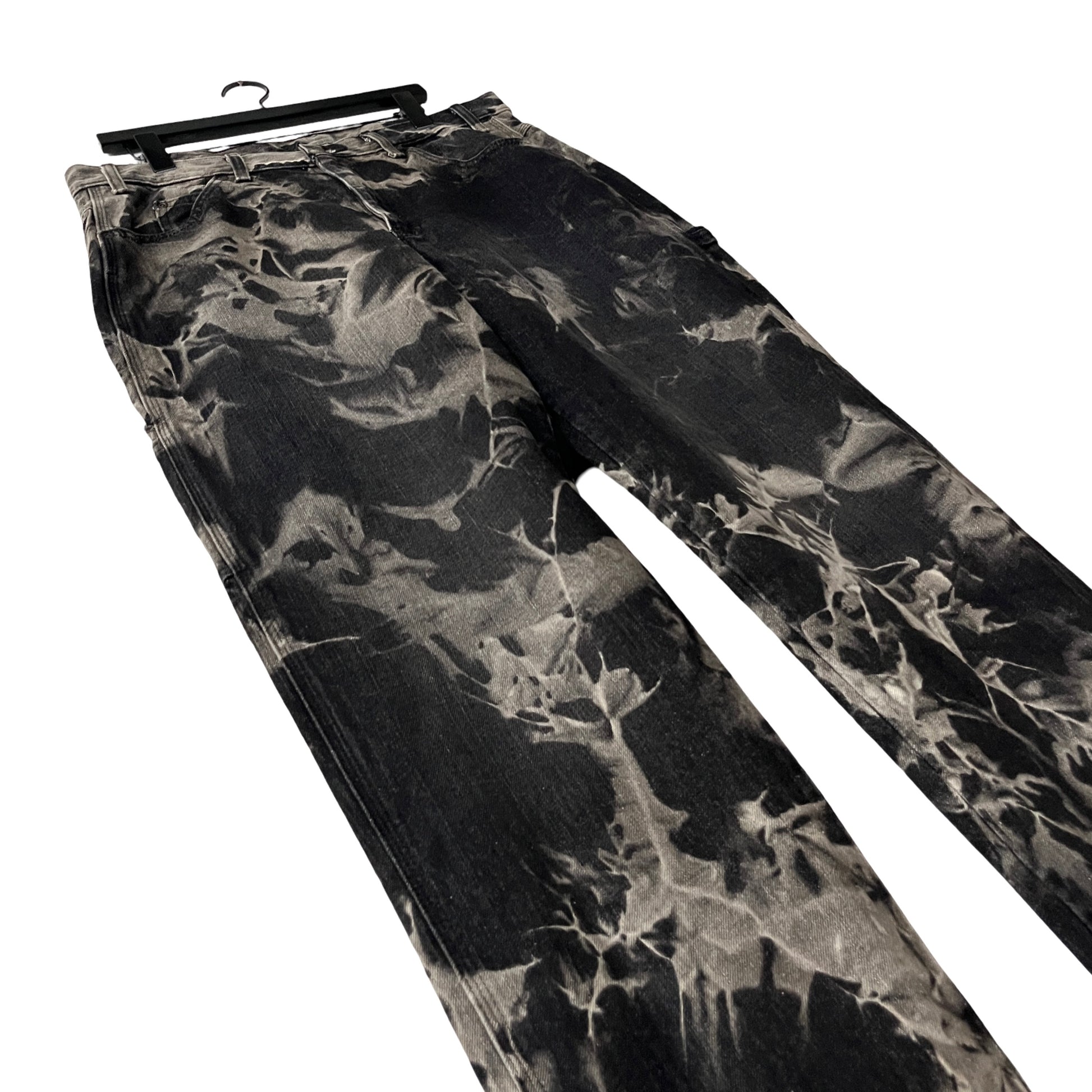The pants began as solid black prior to receiving a bleach treatment, producing a multi-tonal, vaporous finish with a mixture of black, grey, and off white tones.