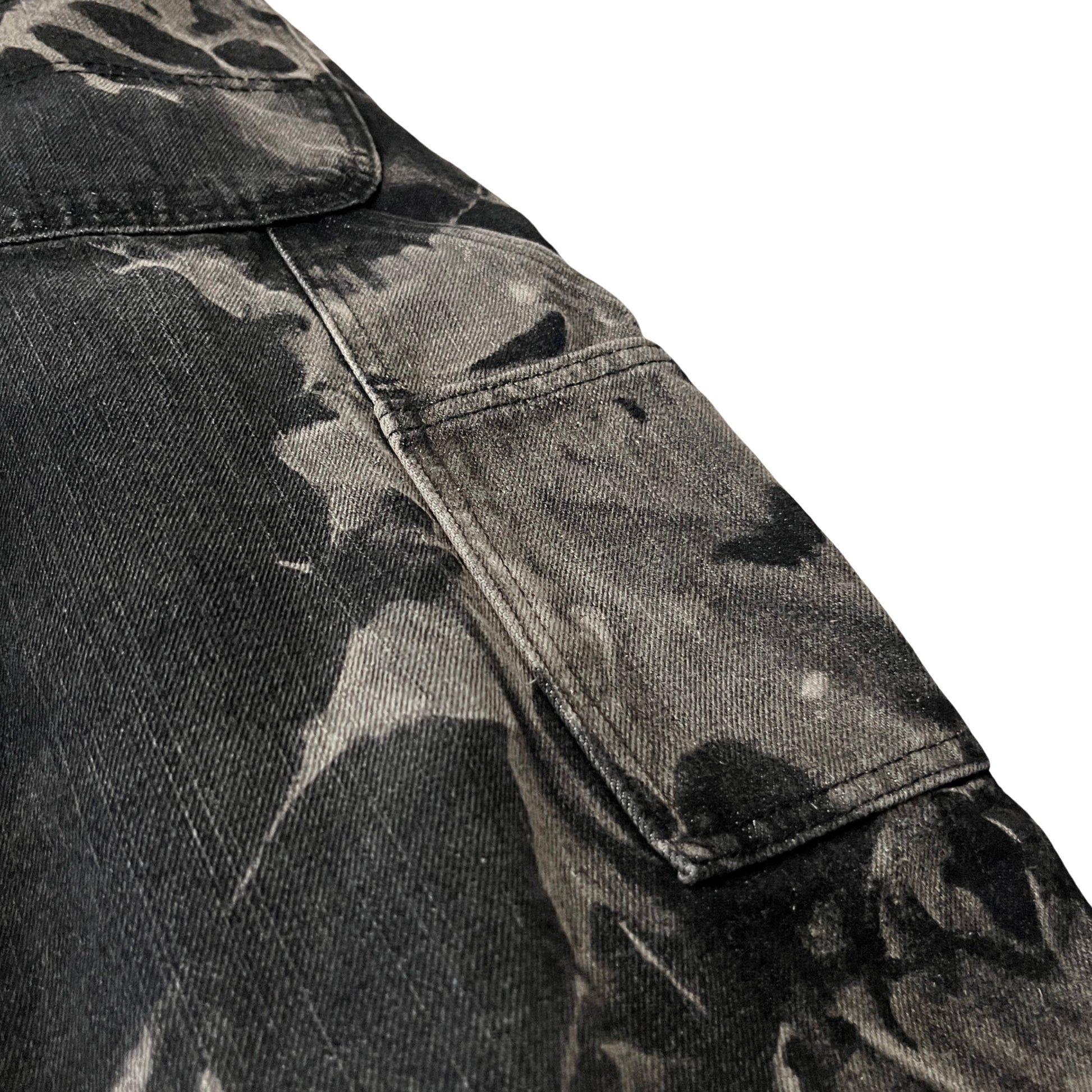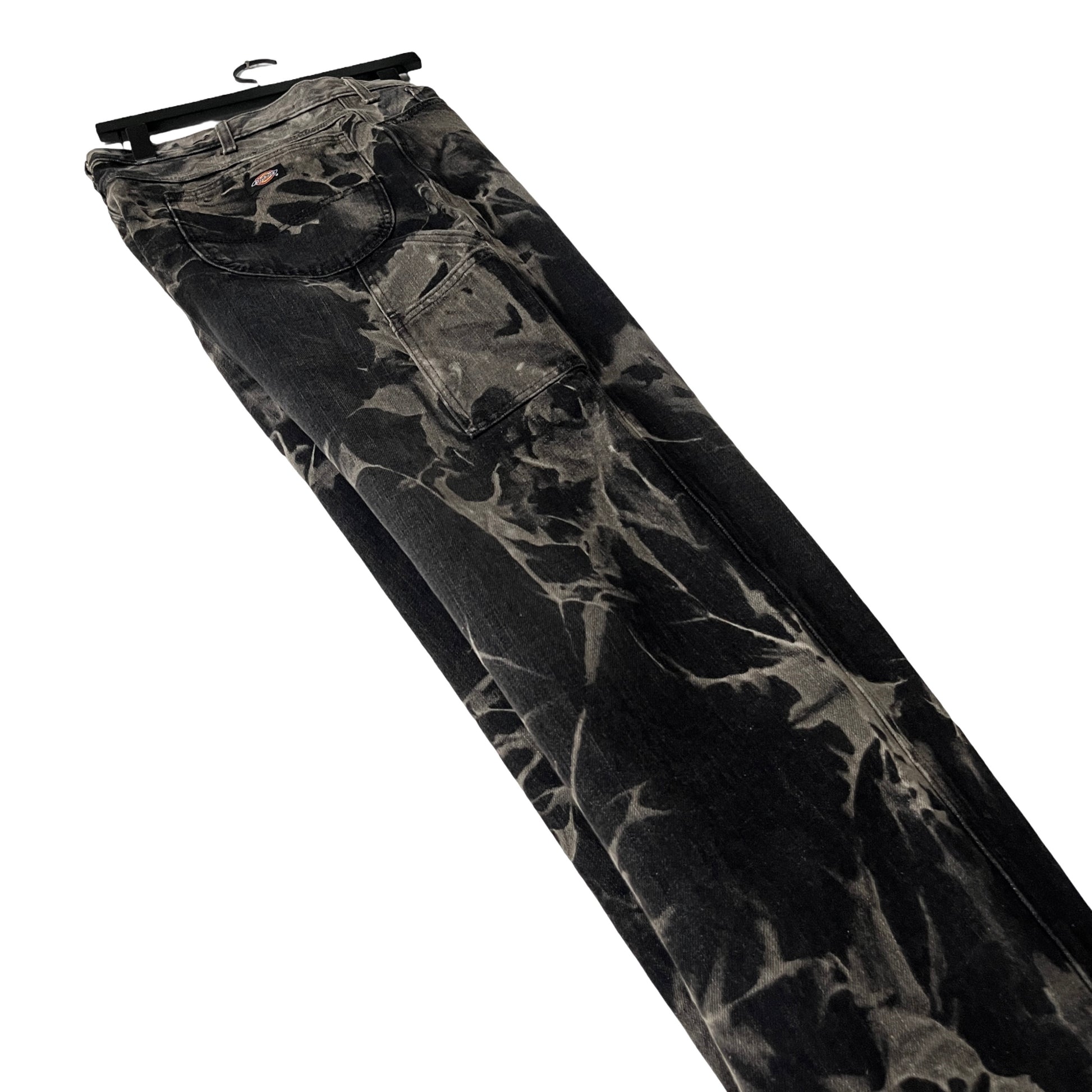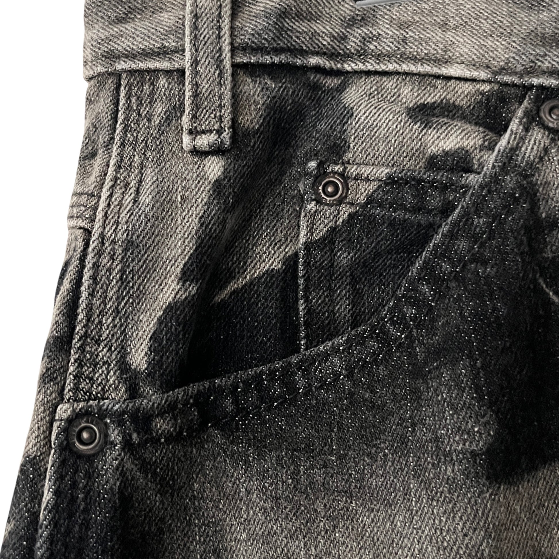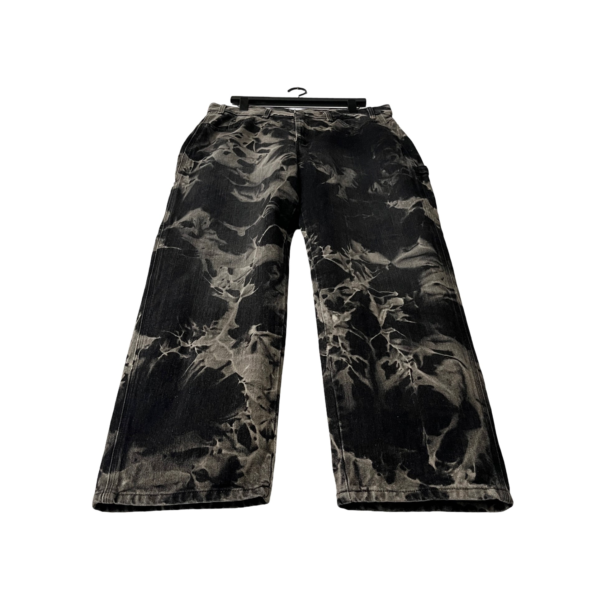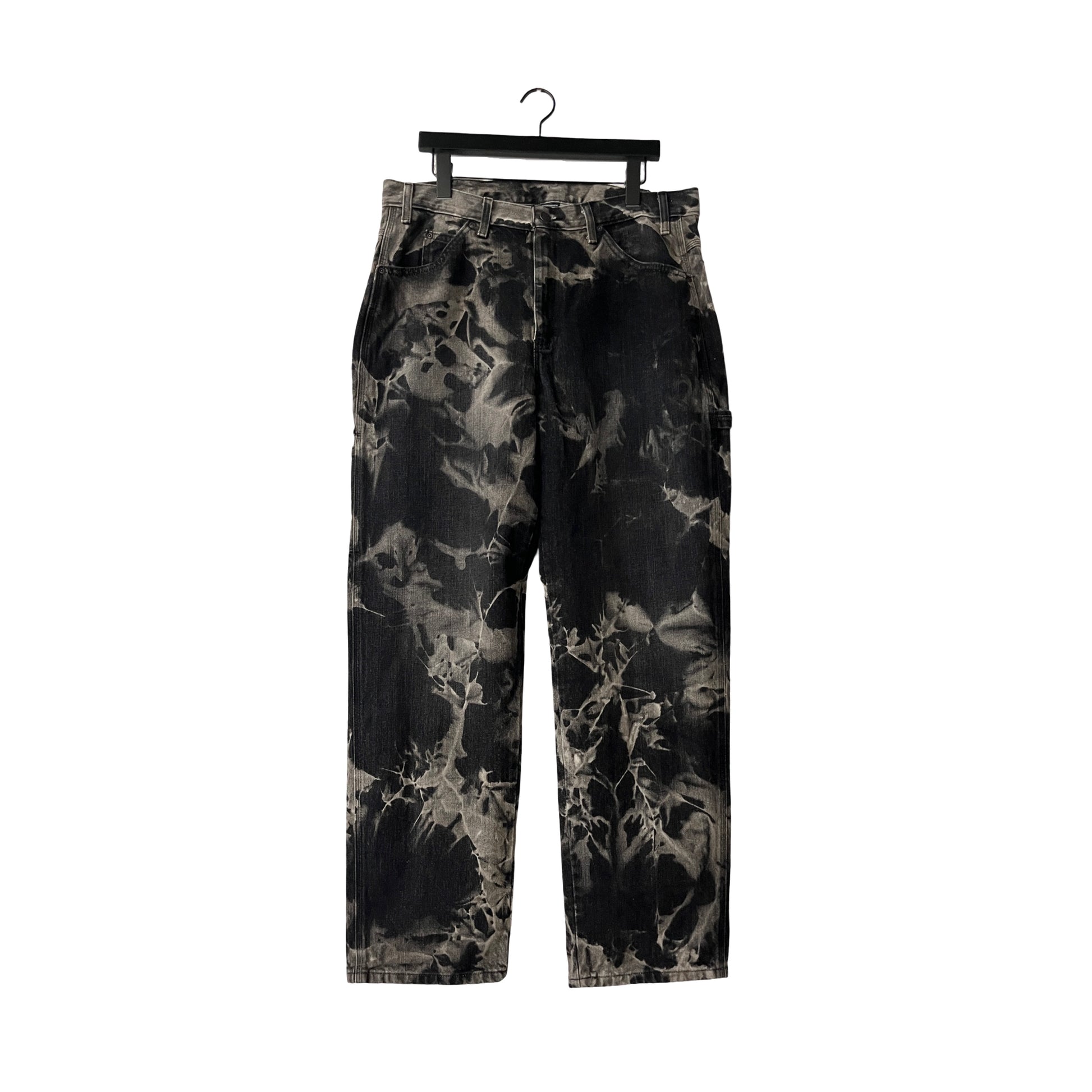 The pants began as solid black prior to receiving a bleach treatment, producing a multi-tonal, vaporous finish with a mixture of black, grey, and off white tones.