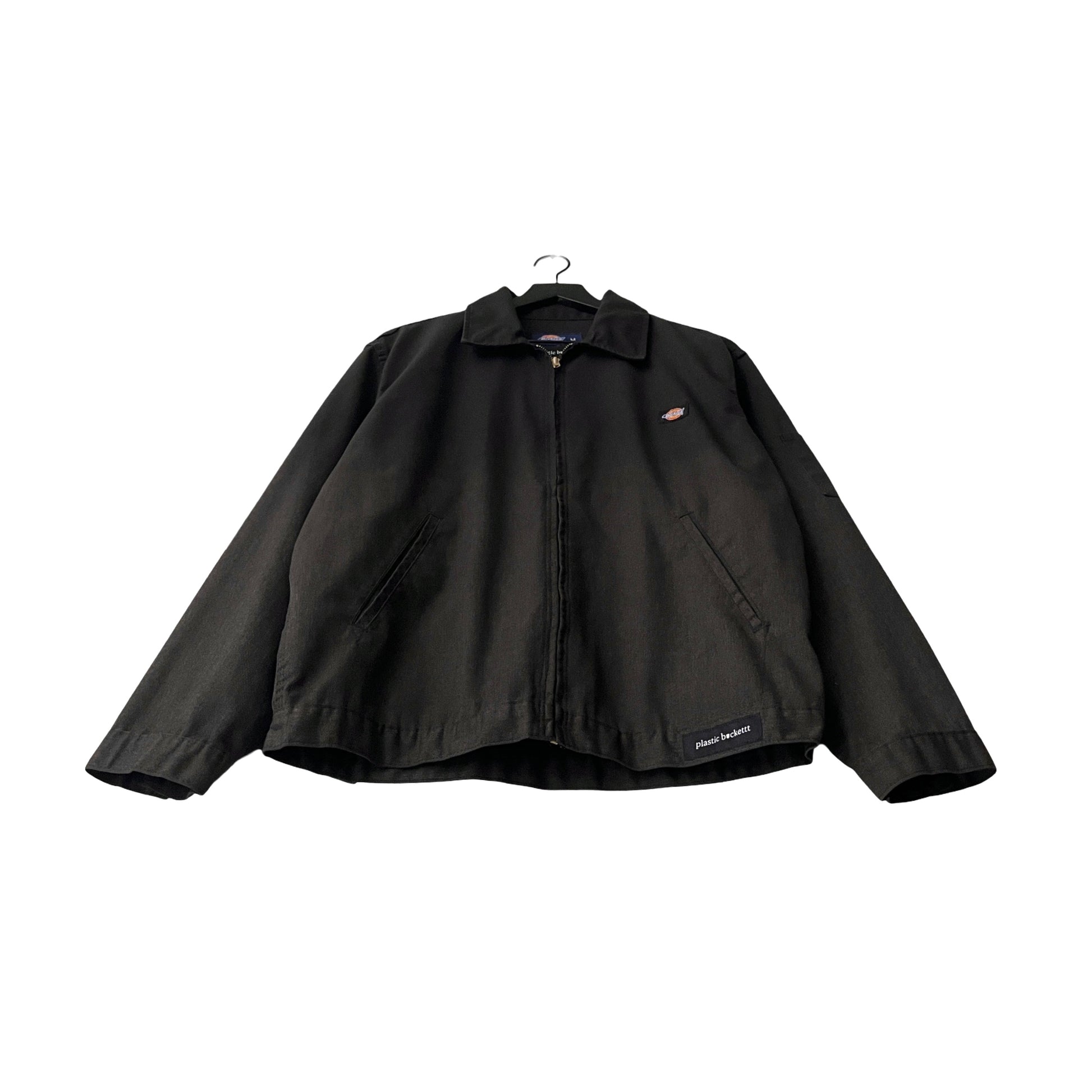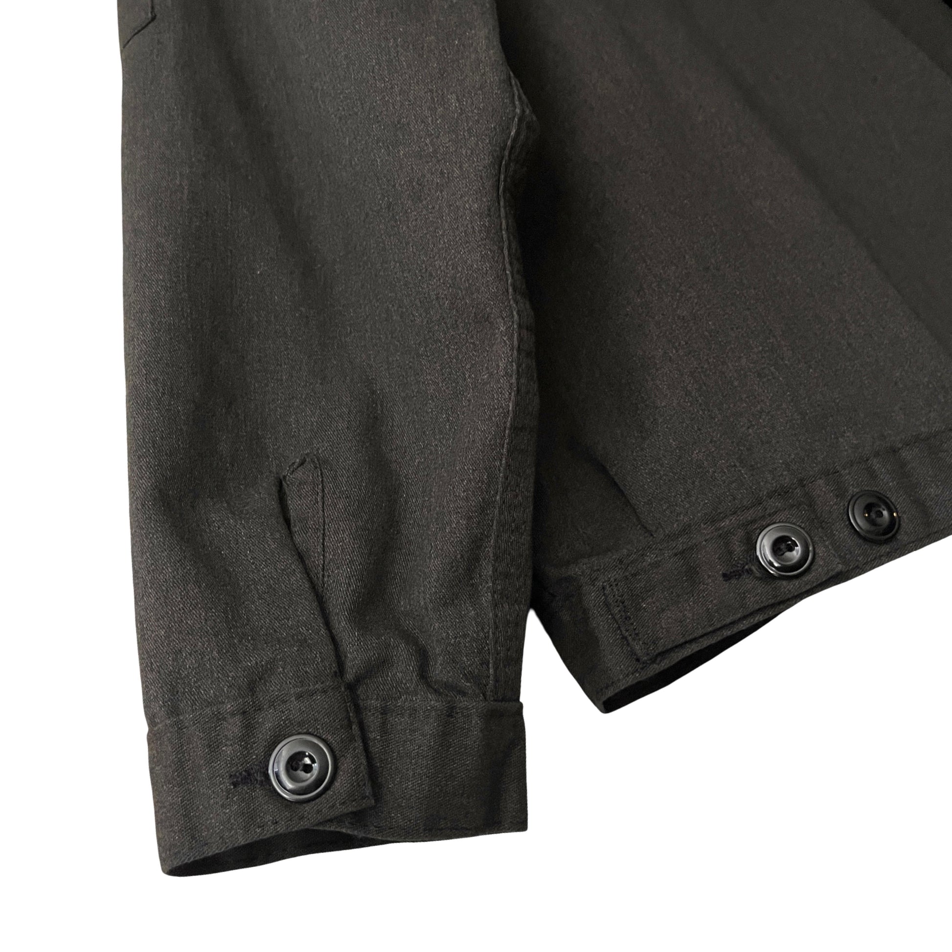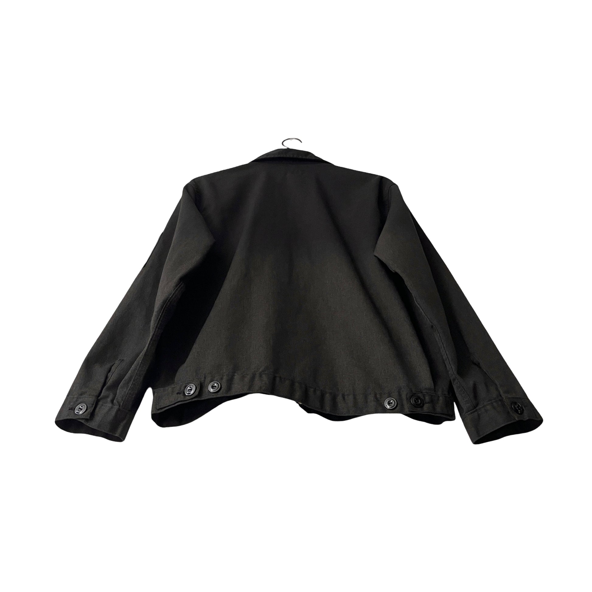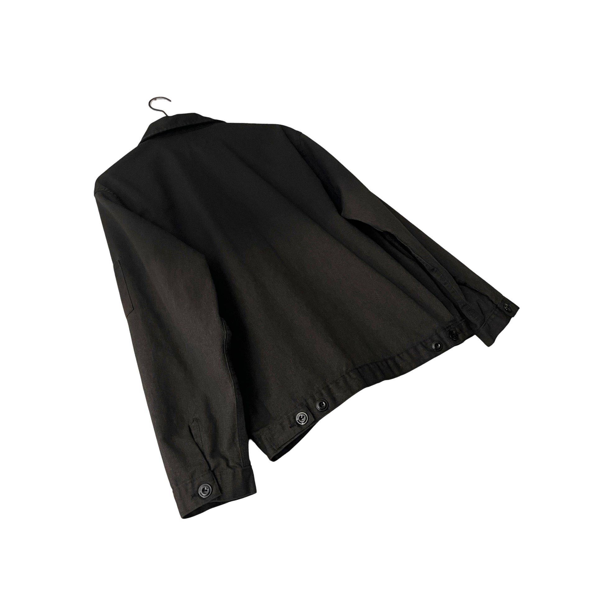 This is a customized Eisenhower work jacket from Dickies. It is lightweight, unlined, and has a polycotton fabric. Jacket has a traditional workwear silhouette, and is a perfect lightweight outer layer.