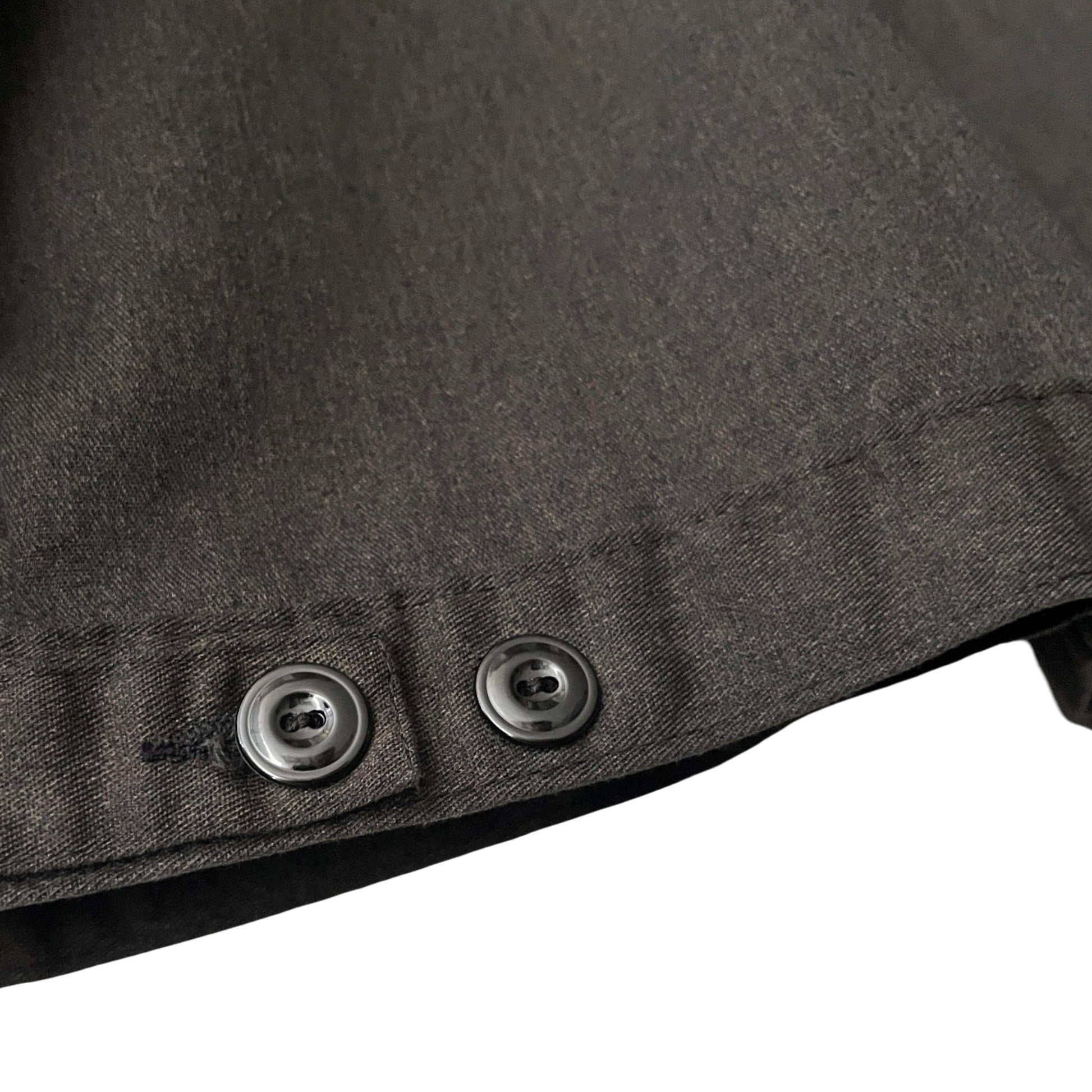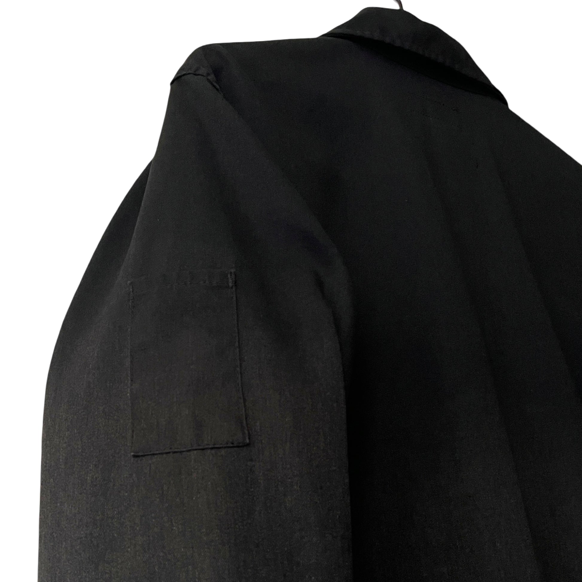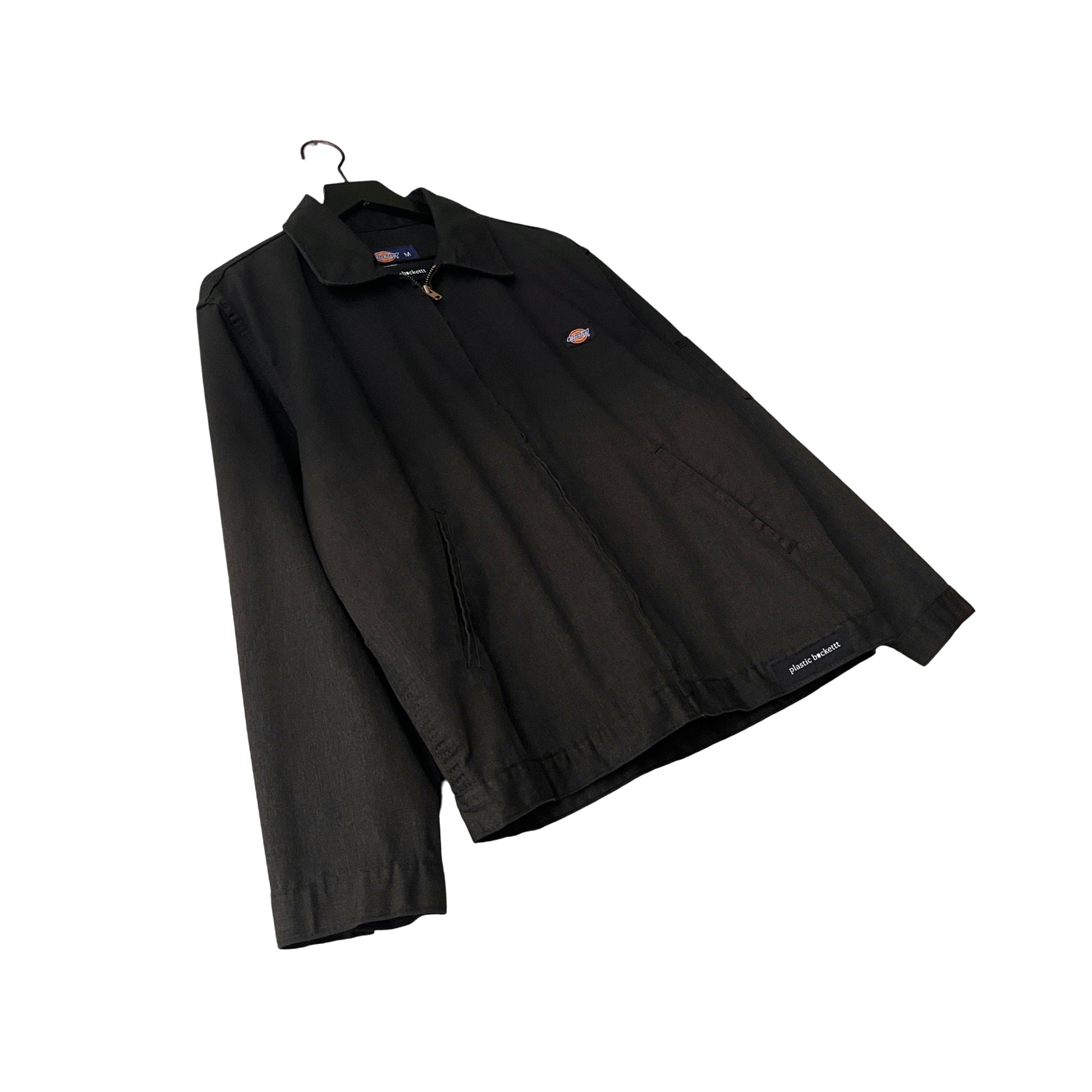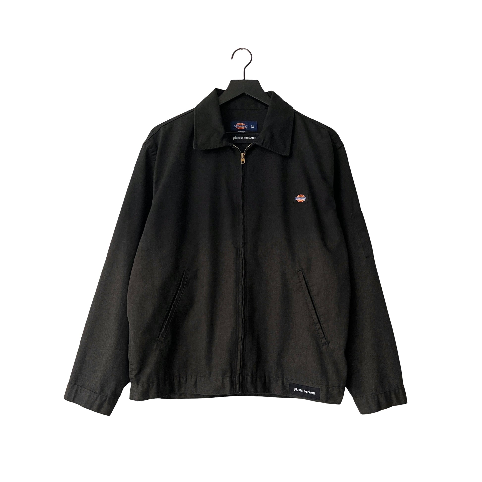 This is a customized Eisenhower work jacket from Dickies. It is lightweight, unlined, and has a polycotton fabric. Jacket has a traditional workwear silhouette, and is a perfect lightweight outer layer.