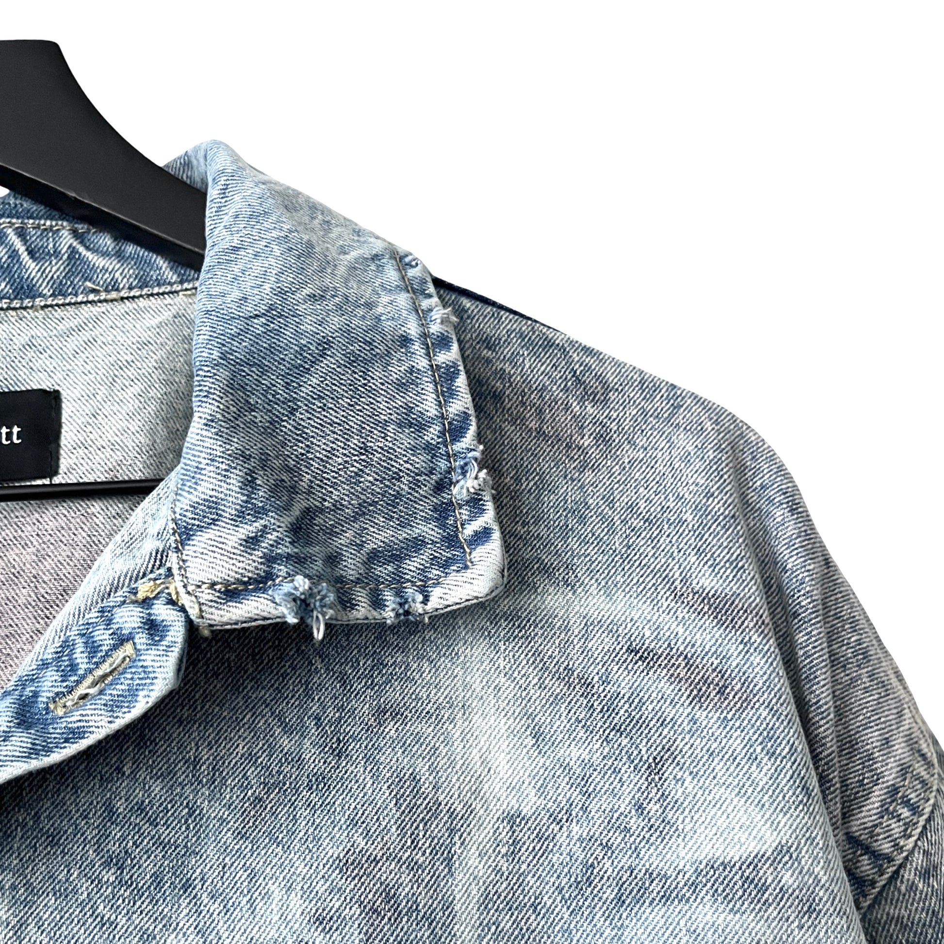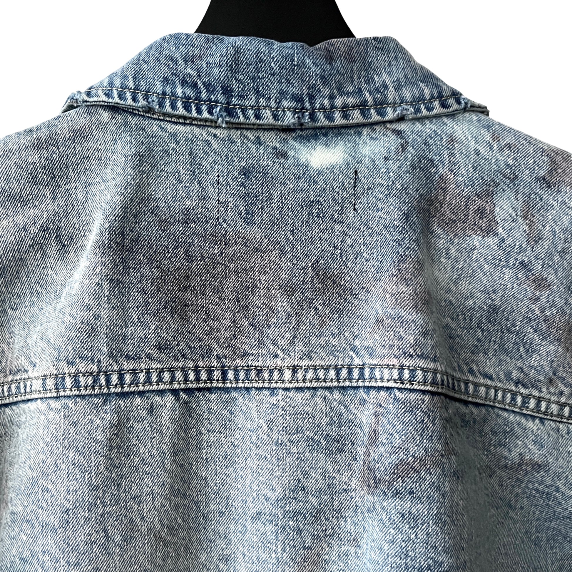 It started out as solid blue prior to receiving an overdye treatment and a bleach treatment. The finish is a vaporous mixture of blues, pale lavender, and white tones.