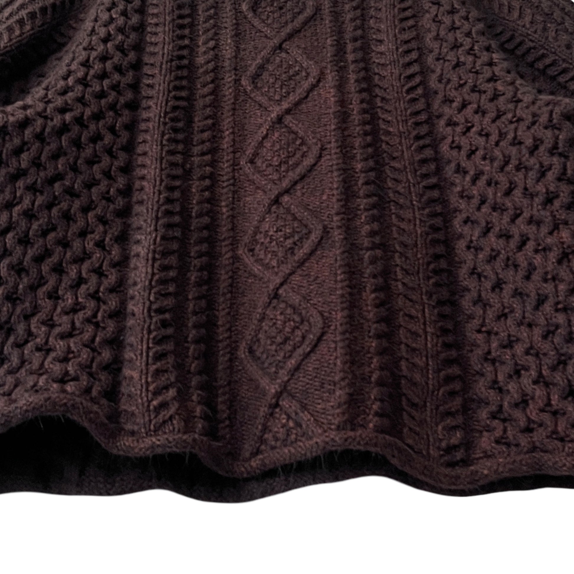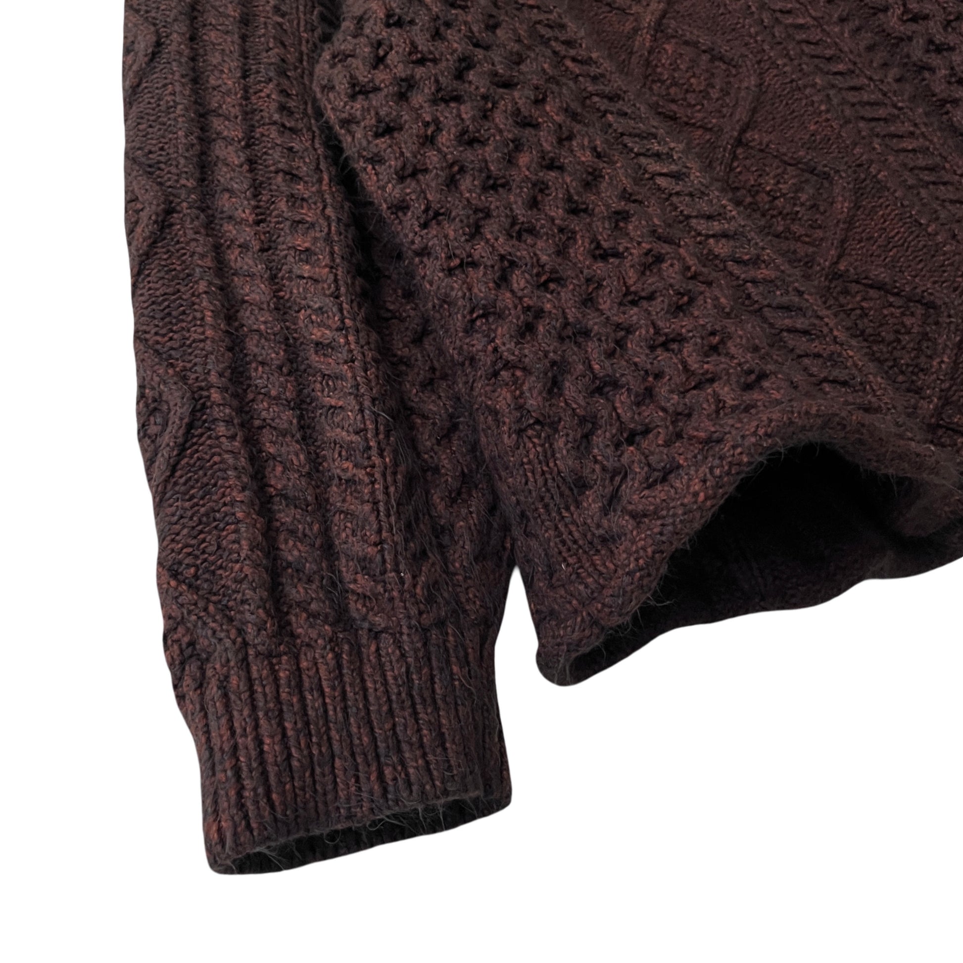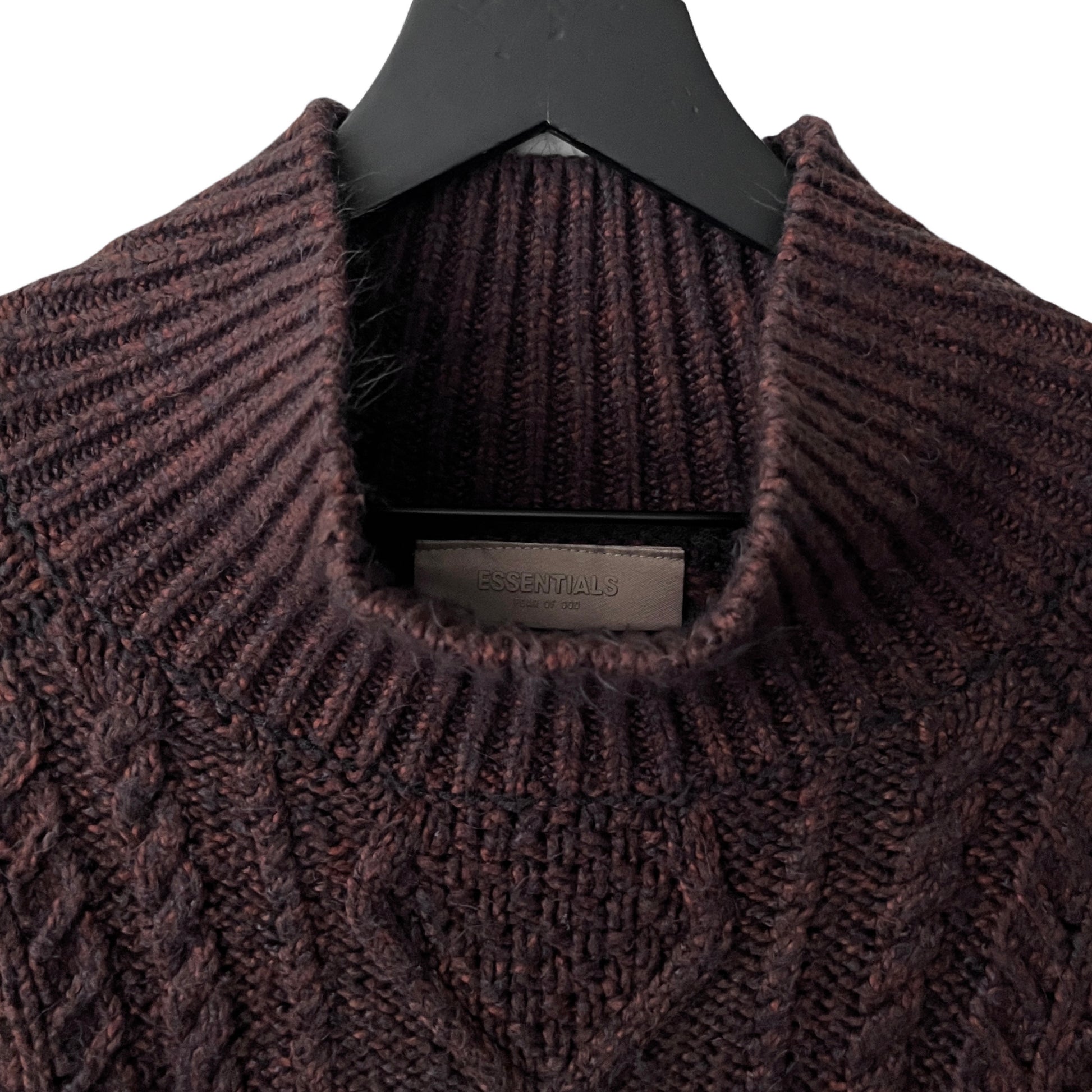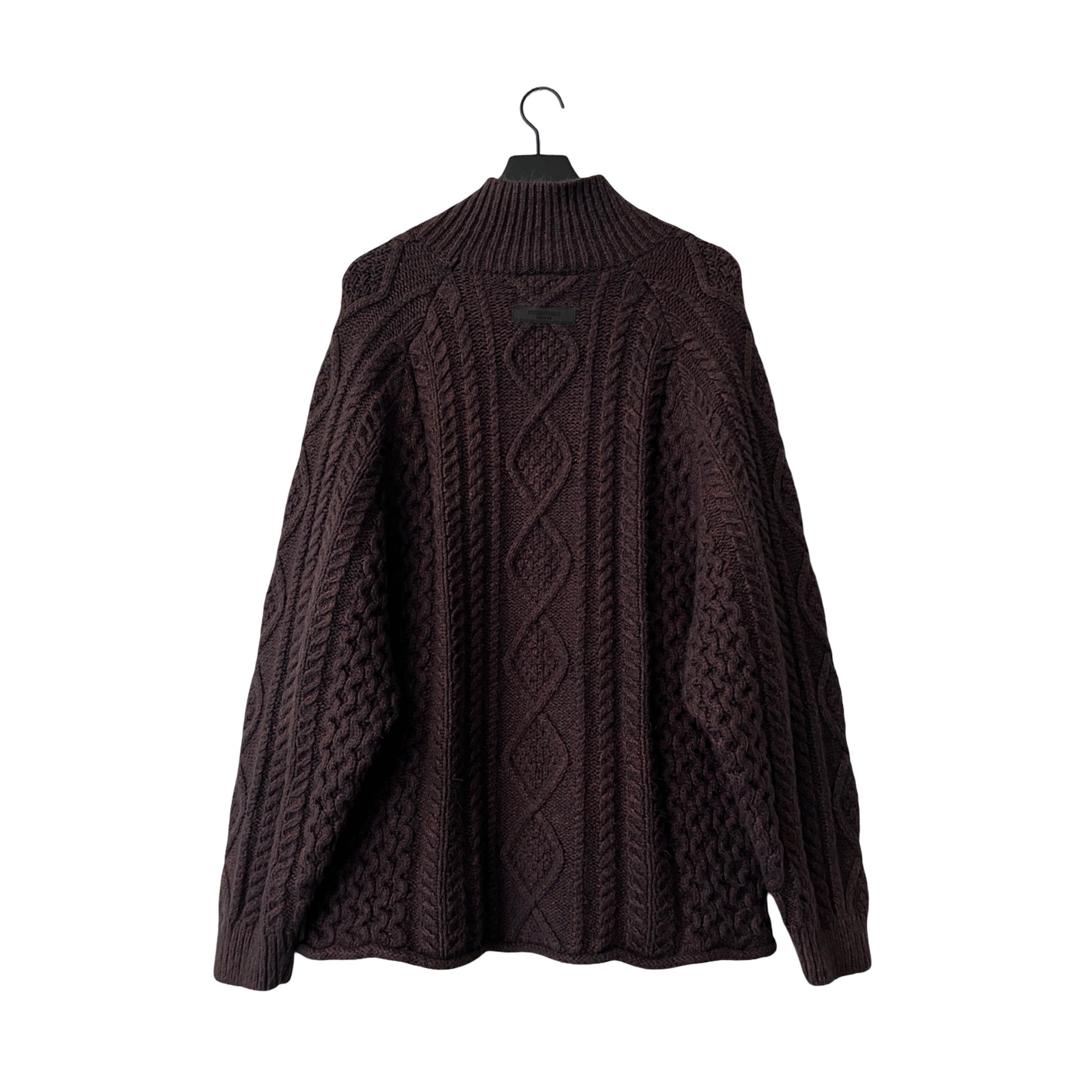 This is a customized, 1 of 1, Fear of God cable knit sweater. The sweater has classic cable knit styling and patterns, a blended yarn construction (cotton, acrylic, nylon), a comfortable handfeel, raglan style sleeves, a slouchy fit, and a rollneck opening.