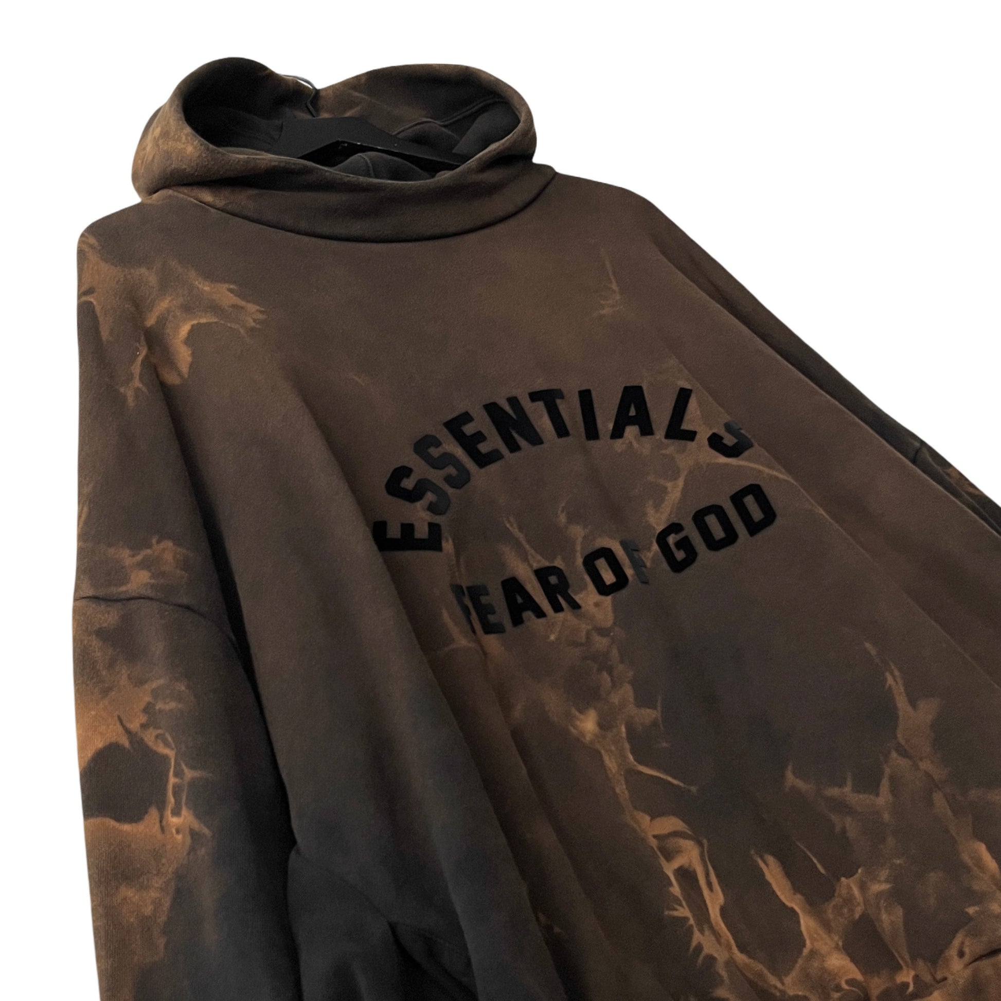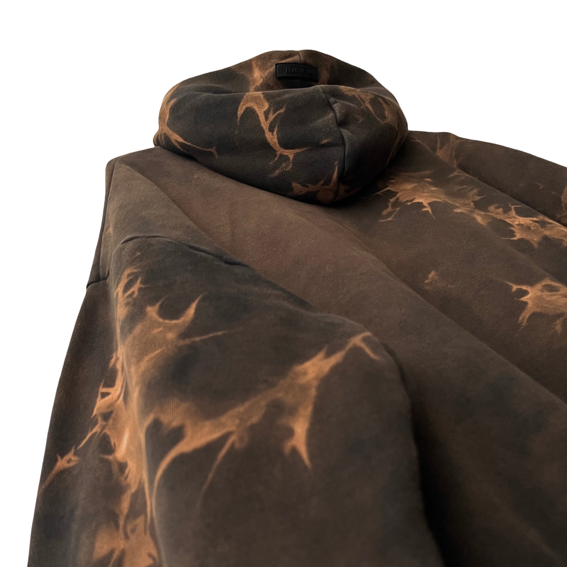 The hoodie began as solid black, prior to receiving a bleach treatment. The finish is a vaporous mixture of hazy deep brown and rust tone highlights.
