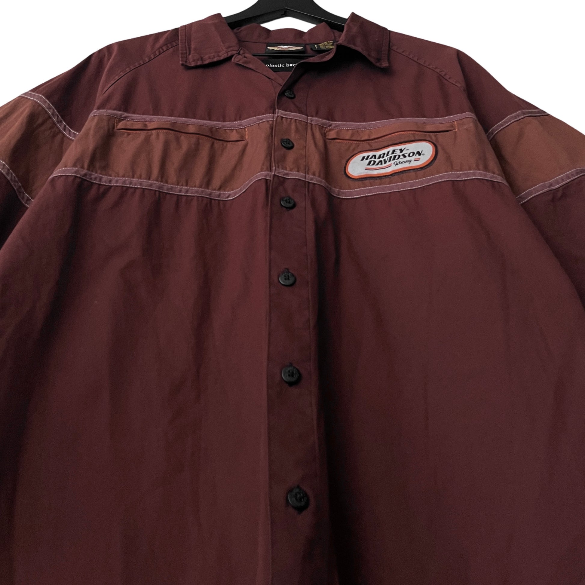 This is a customized Harley Davidson button up shirt. The shirt has two Harley Davidson callouts (Racing Team logo on chest and embroidered script across back), 2 stealth zipper chest pockets, branded touches throughout (buttons, neck label, etc), and a classic short sleeve silhouette.