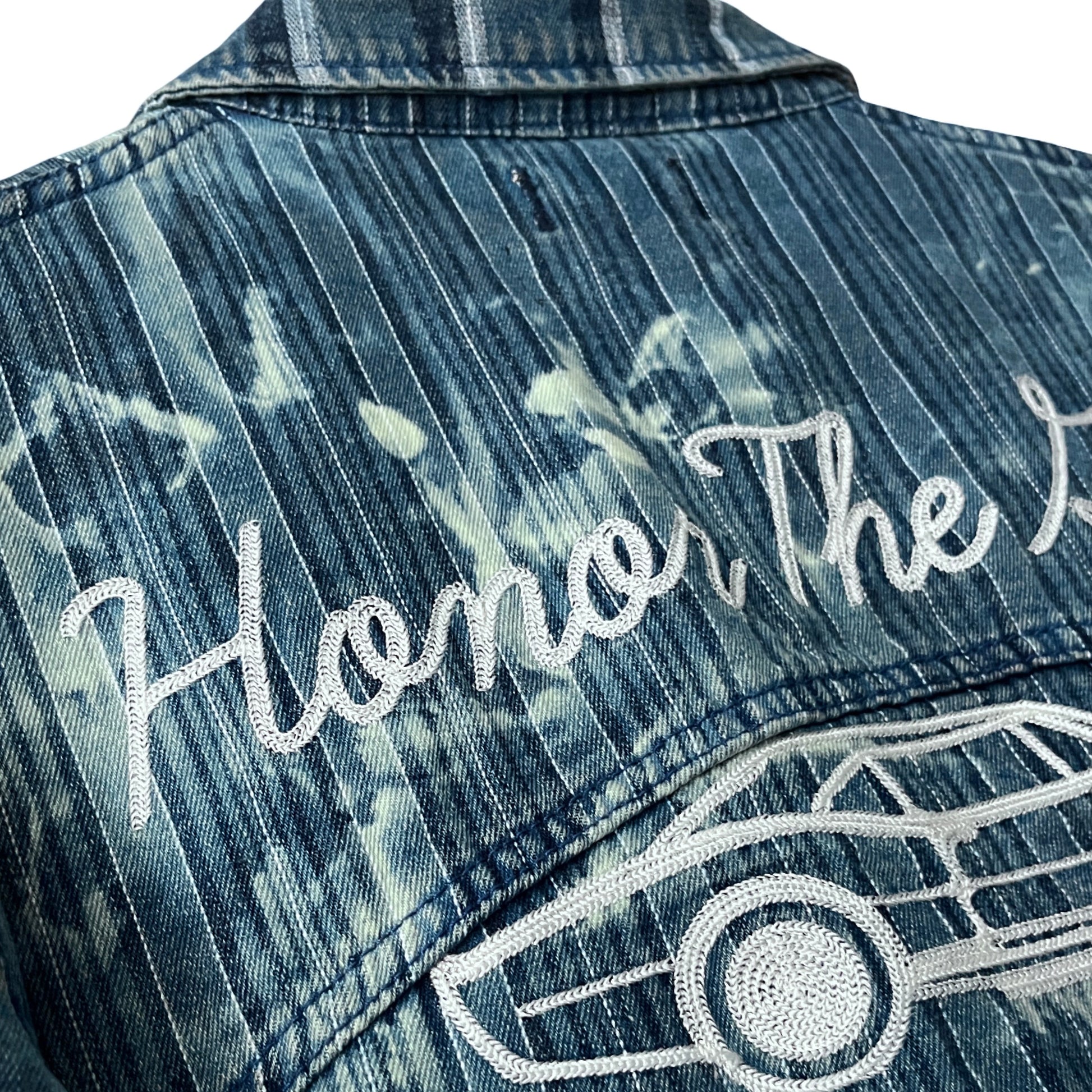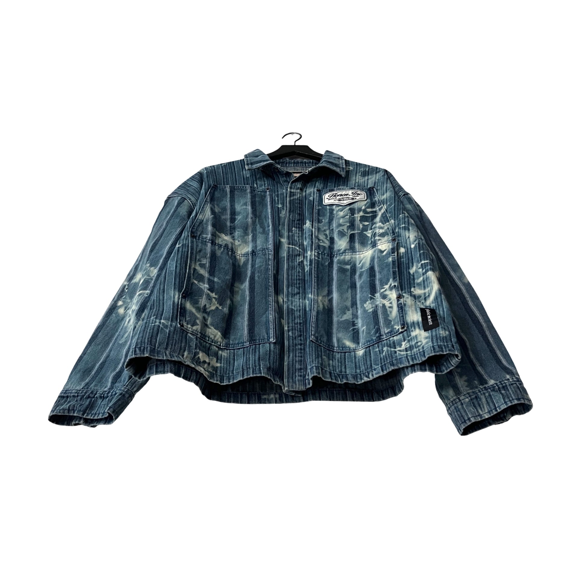 The jacket started with it's tonal pinstripe design before receiving a vaporous bleach treatment.