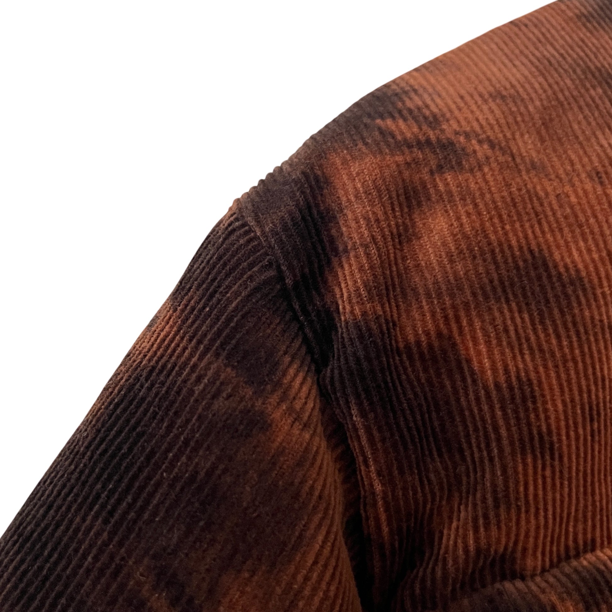 Jacket began as solid black prior to receiving a bleach treatment. The finish is a warm mixture of rust, brown, and black tones. Some screens may cause the lighter tones to appear closer to orange, but they are closer to rust and copper in real life.