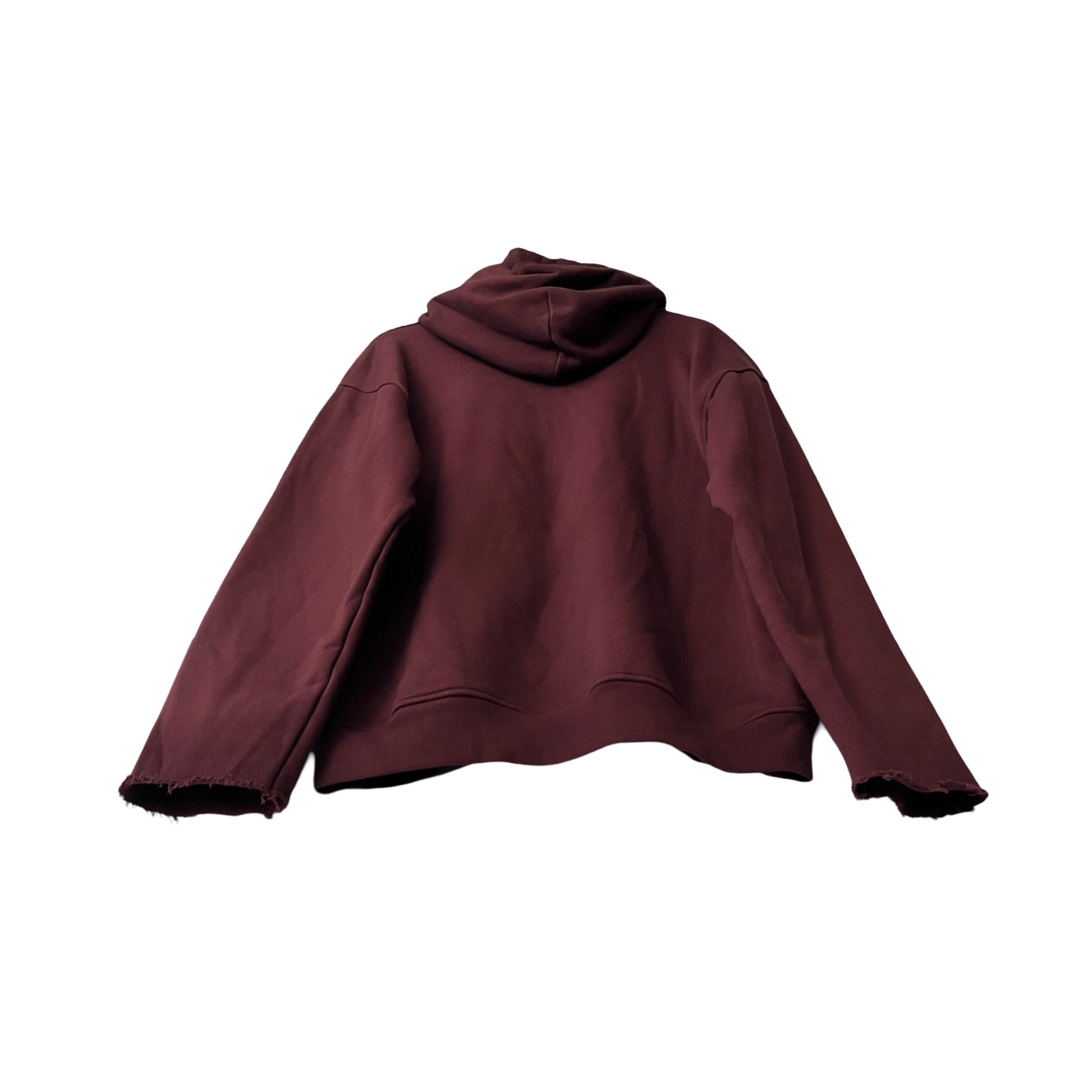 This is a customized Nahmias Carpenter Hoodie. The hoodie began as solid brown prior to receiving a bleach wash out treatment, and then an overdye treatment, resulting in a soft, muted wine tone.