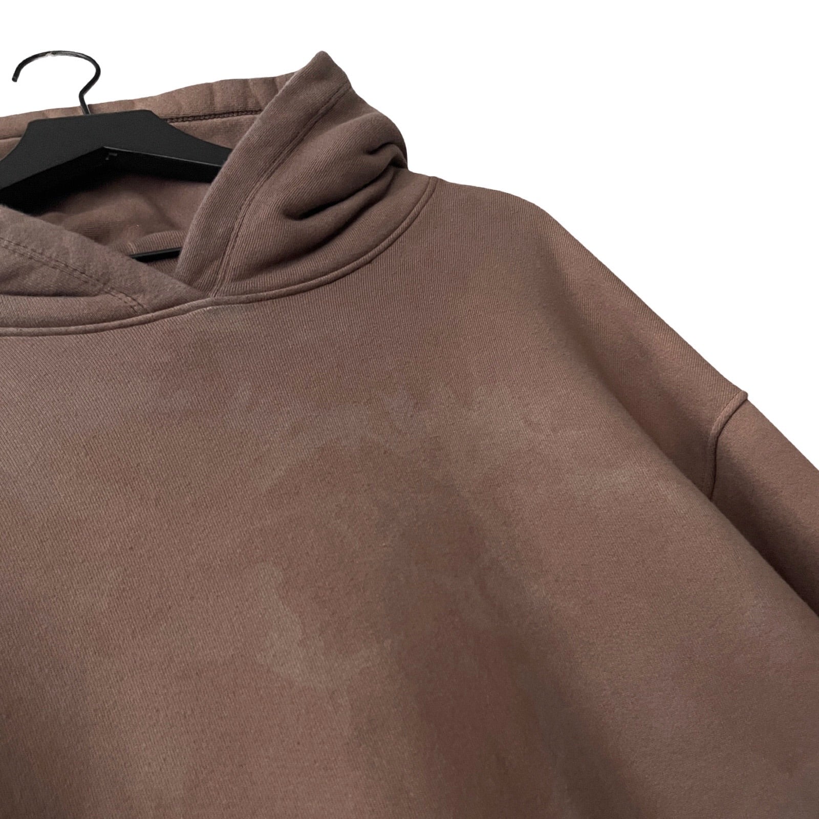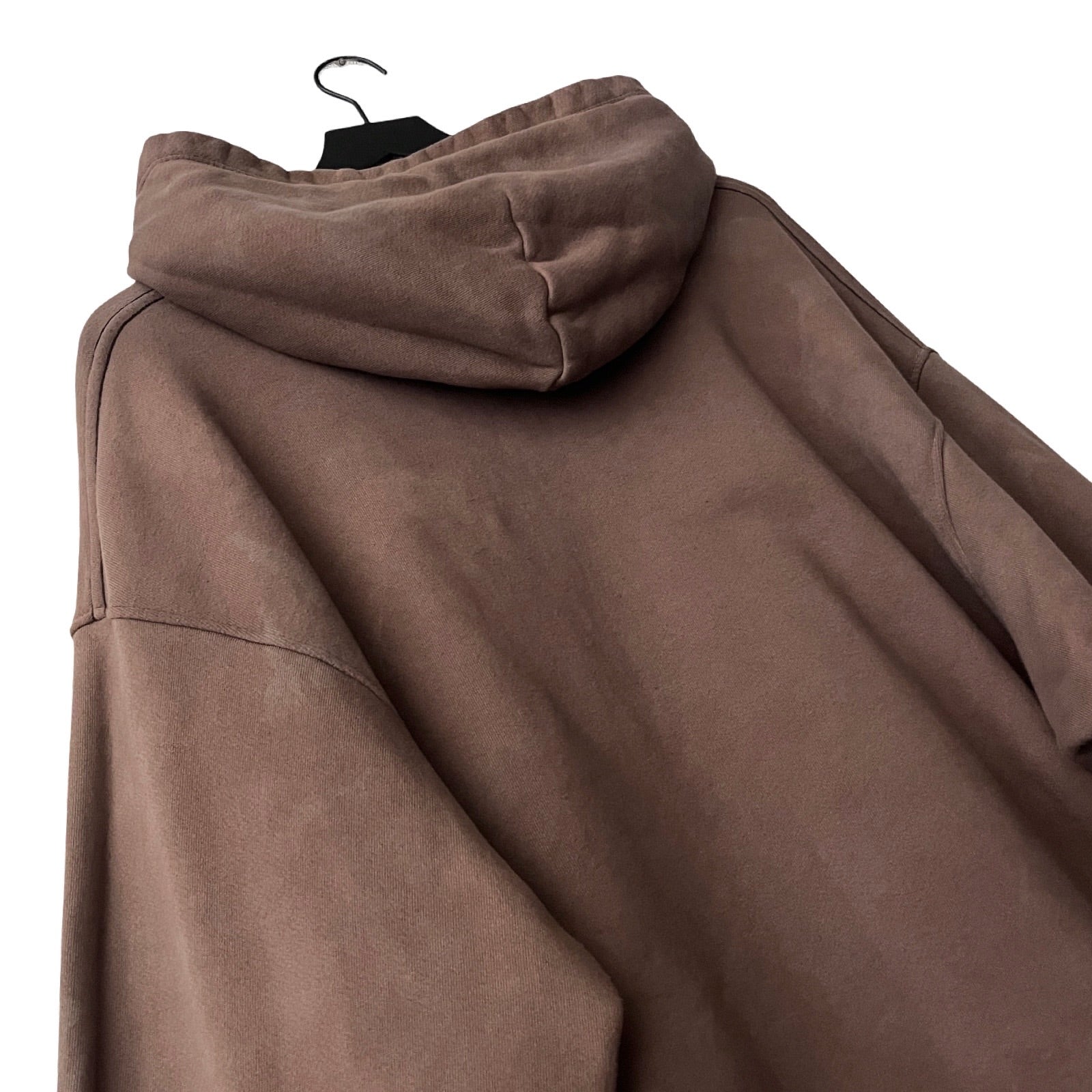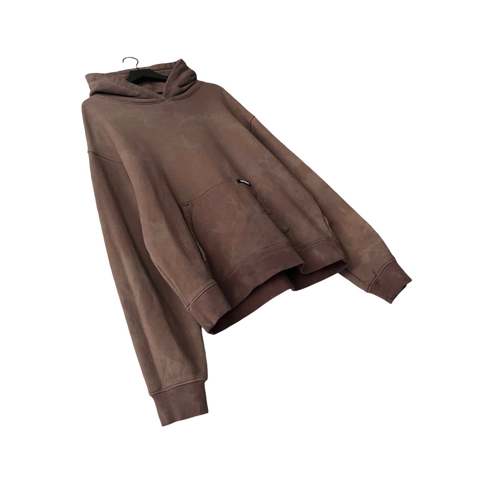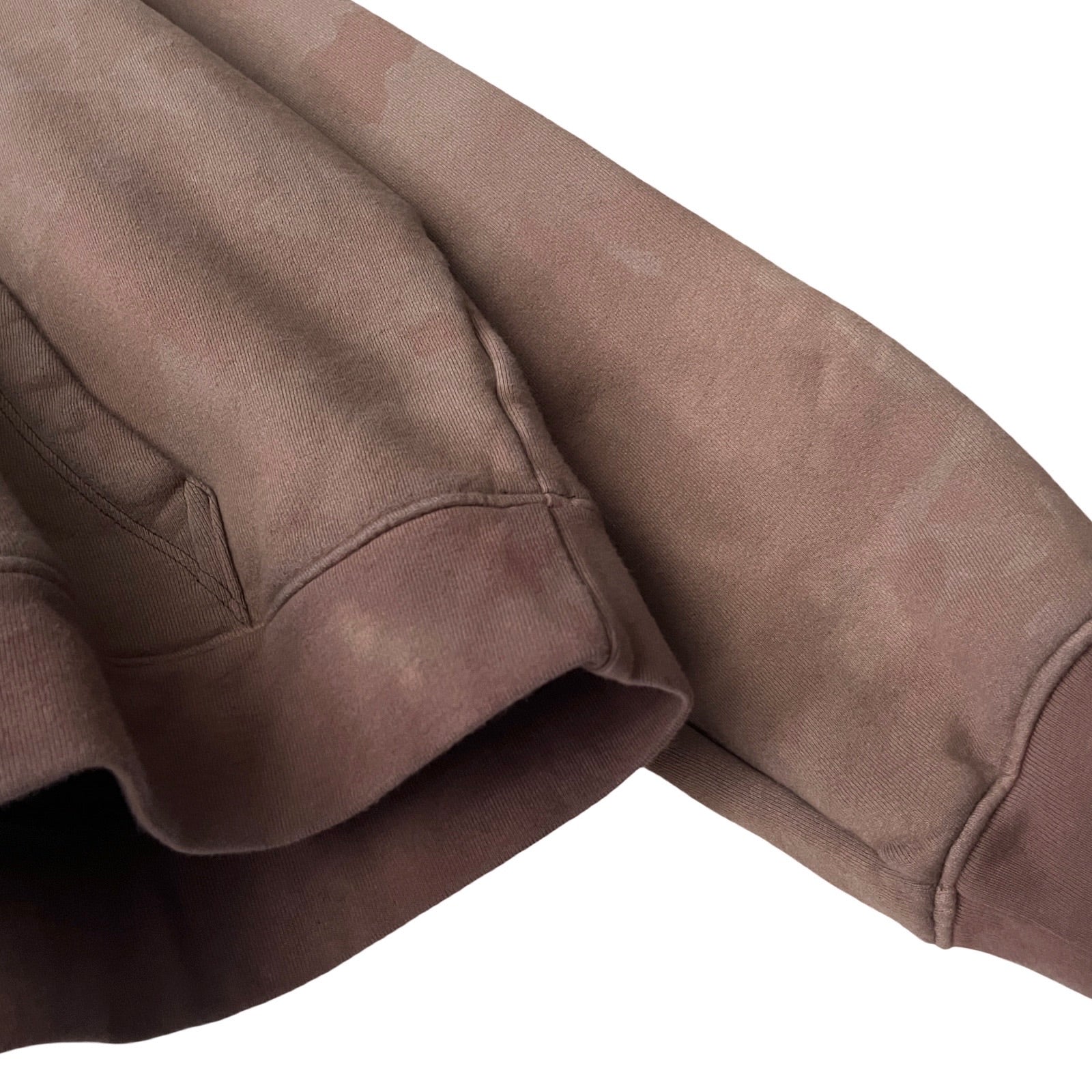The hoodie began as solid black (reference image in gallery) prior to receiving a bleach treatment and a dye treatment. The finish is a cloudy, soft, cold, rose-tinged brown, with areas of tonal variance throughout.