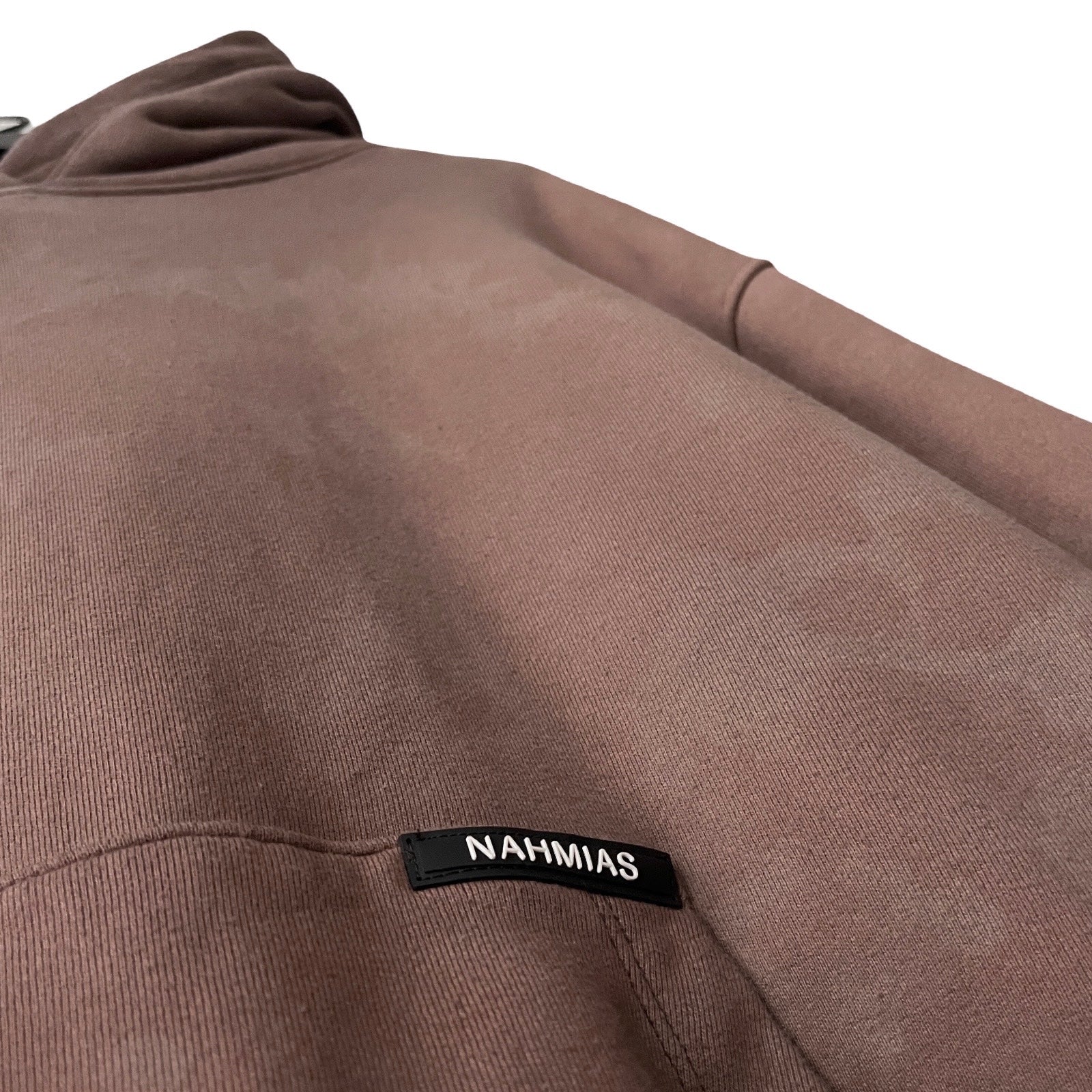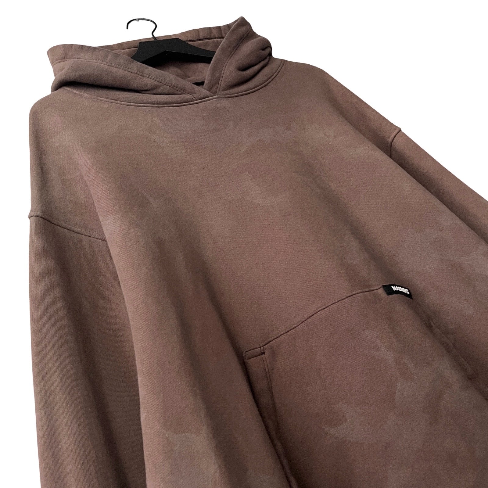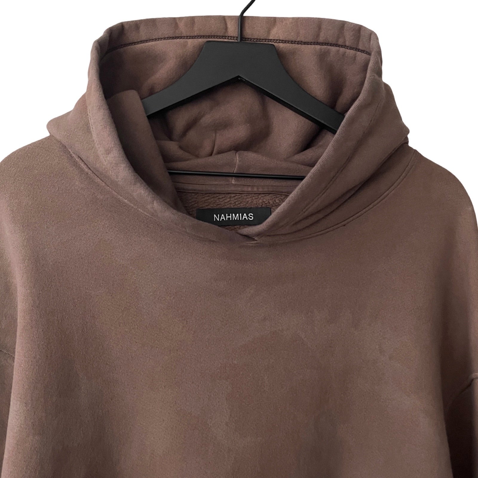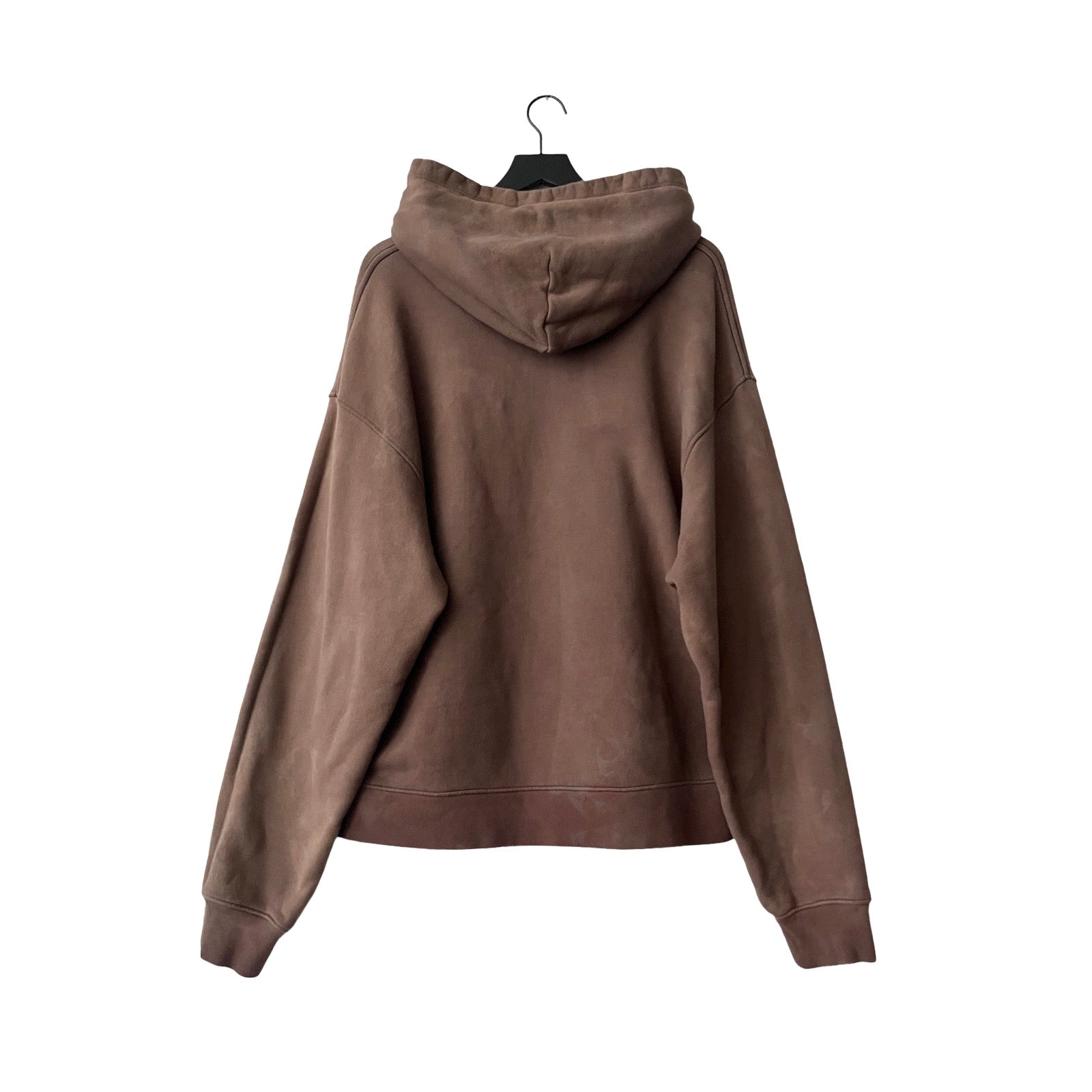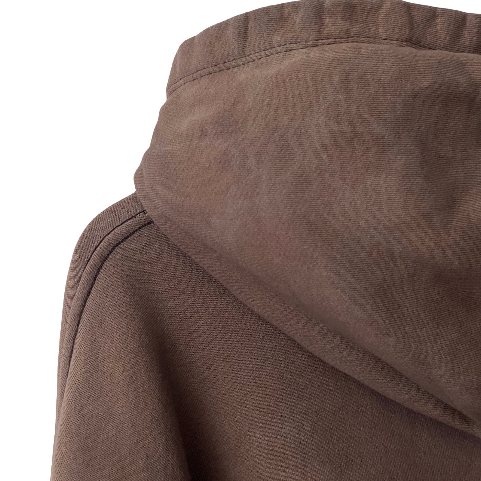 The hoodie began as solid black (reference image in gallery) prior to receiving a bleach treatment and a dye treatment. The finish is a cloudy, soft, cold, rose-tinged brown, with areas of tonal variance throughout.