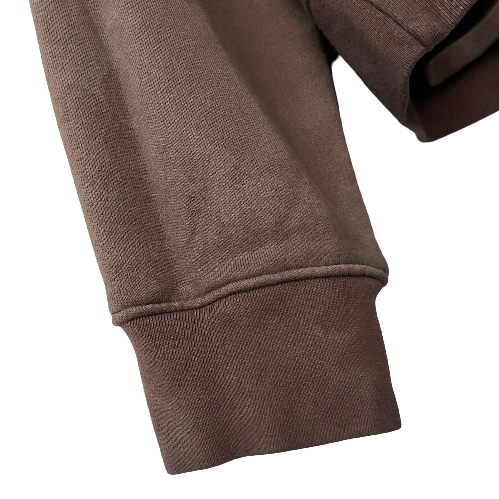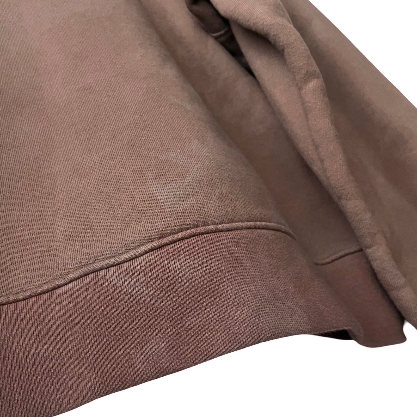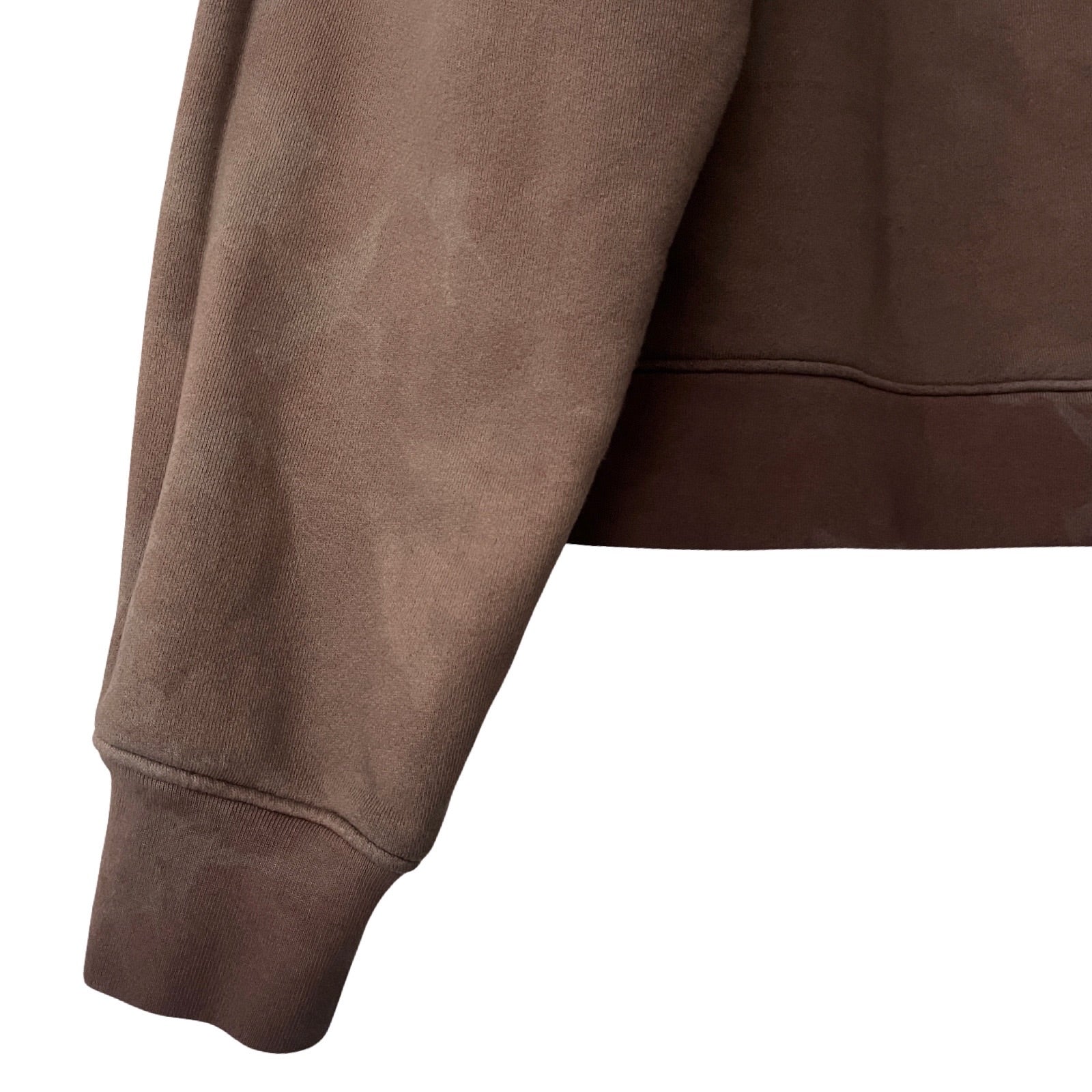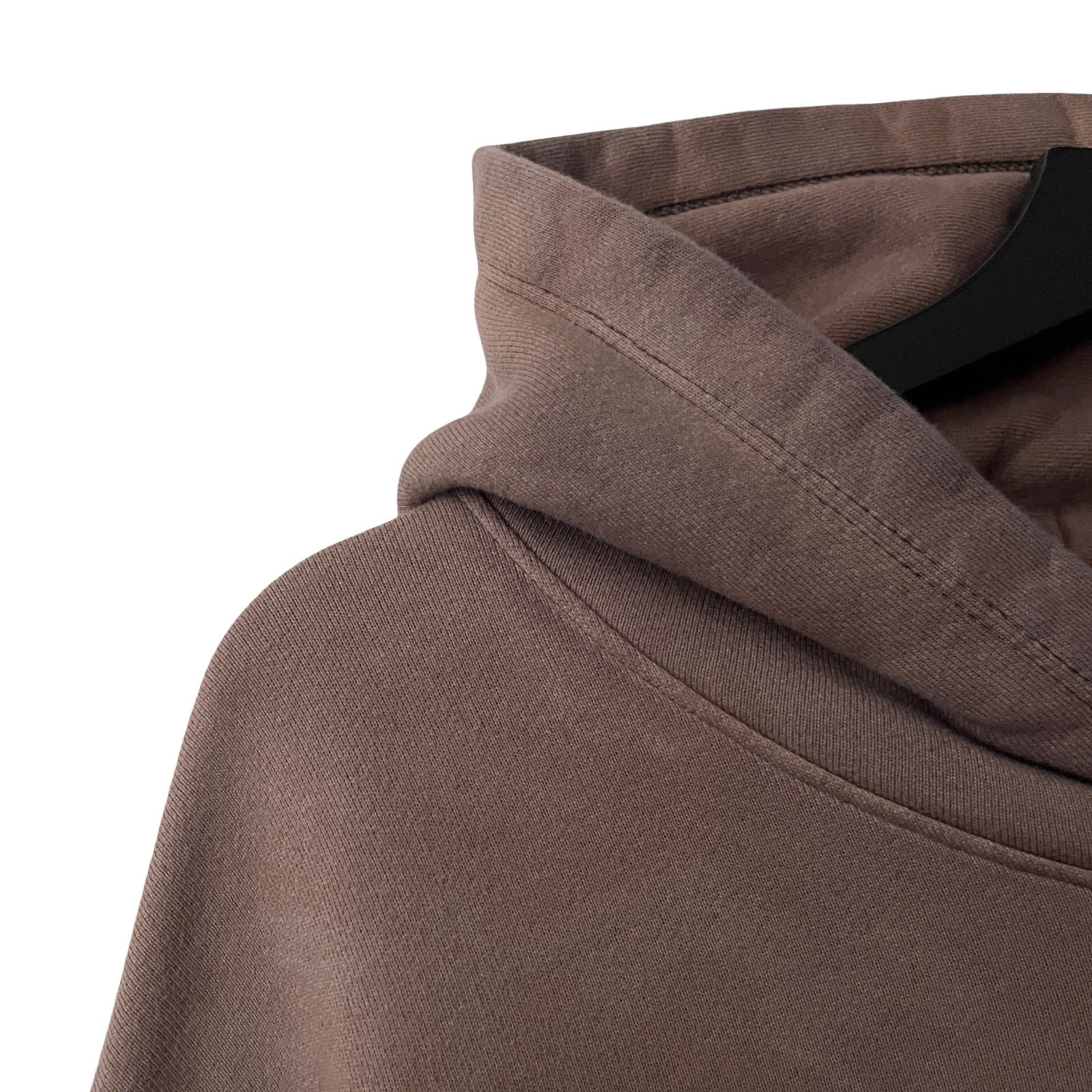 The hoodie began as solid black (reference image in gallery) prior to receiving a bleach treatment and a dye treatment. The finish is a cloudy, soft, cold, rose-tinged brown, with areas of tonal variance throughout.