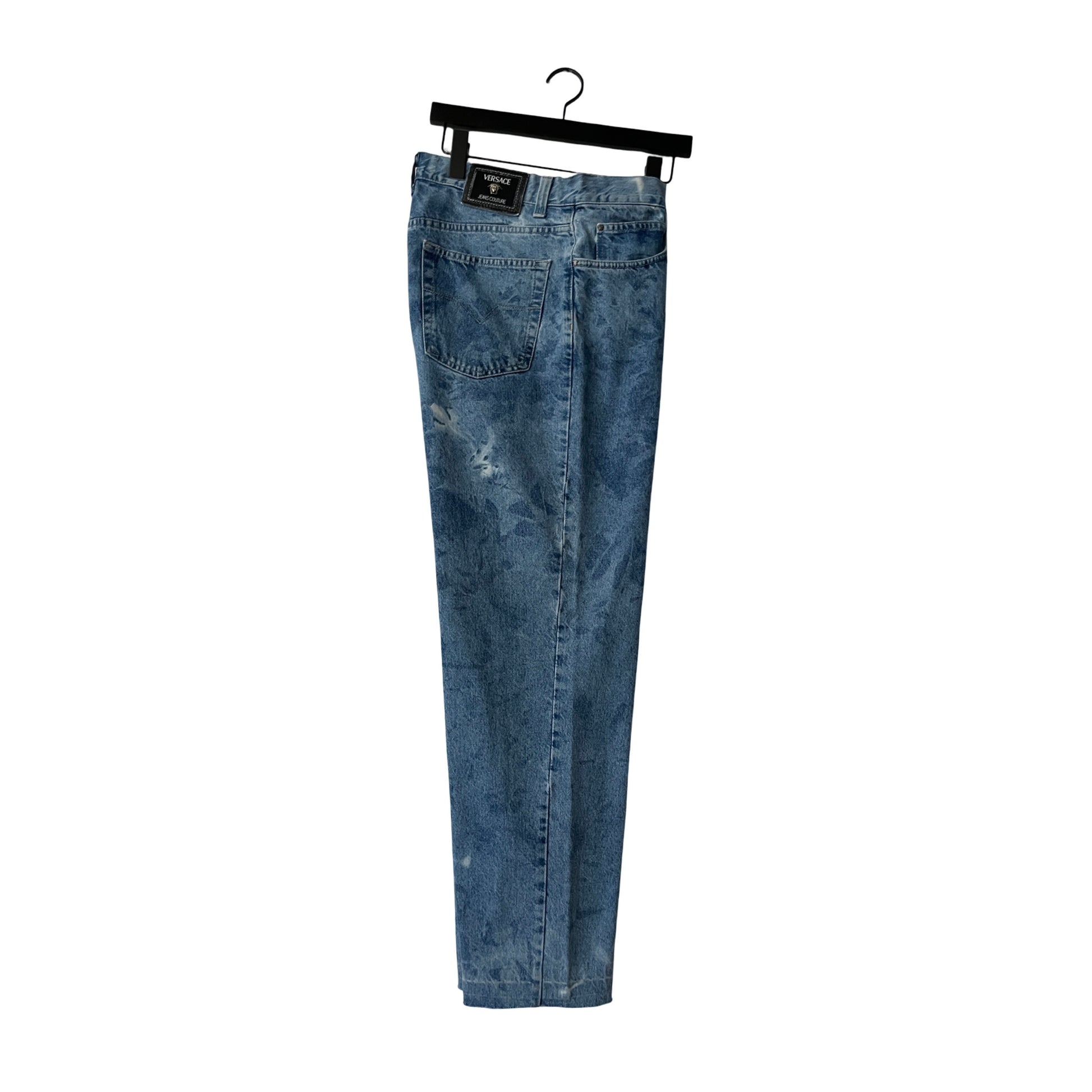 This is a customized, 1 of 1 pair of Versace denim jeans. They have branded touches throughout, released bottom hems, and subtle touches of bleach work.