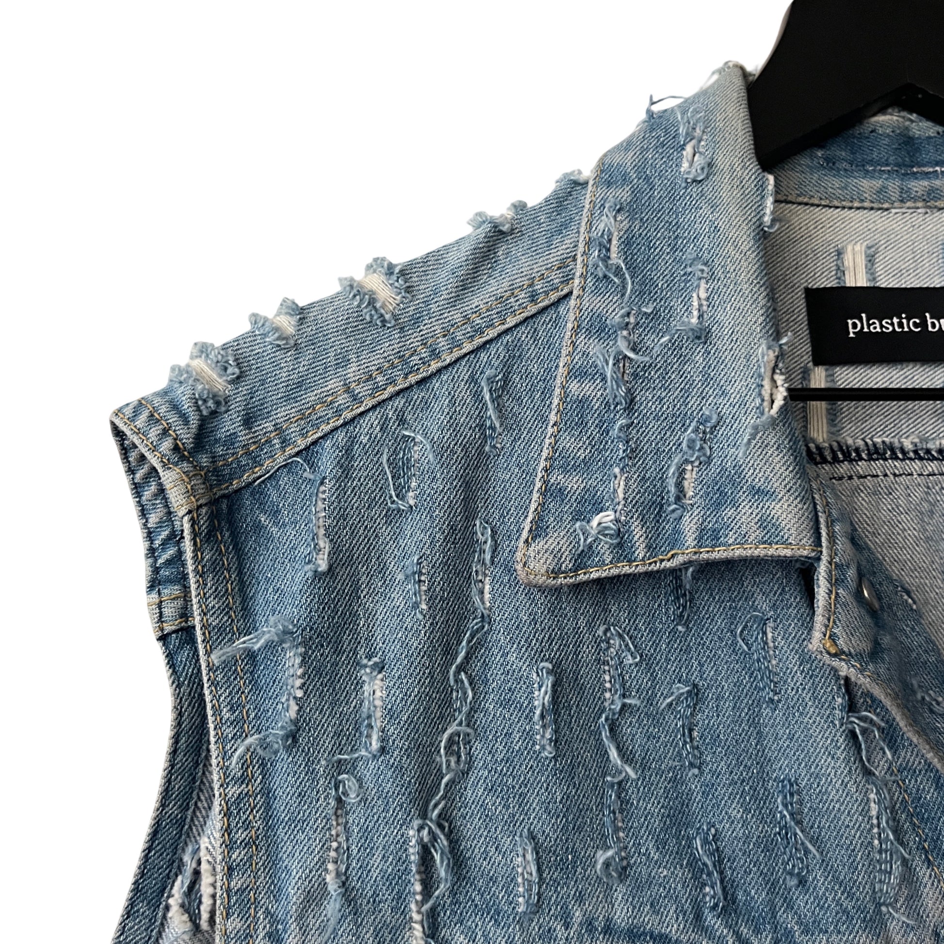 The vest began originally as medium blue, prior to receiving a bleach fade treatment and a unique distressing treatment executed by hand.