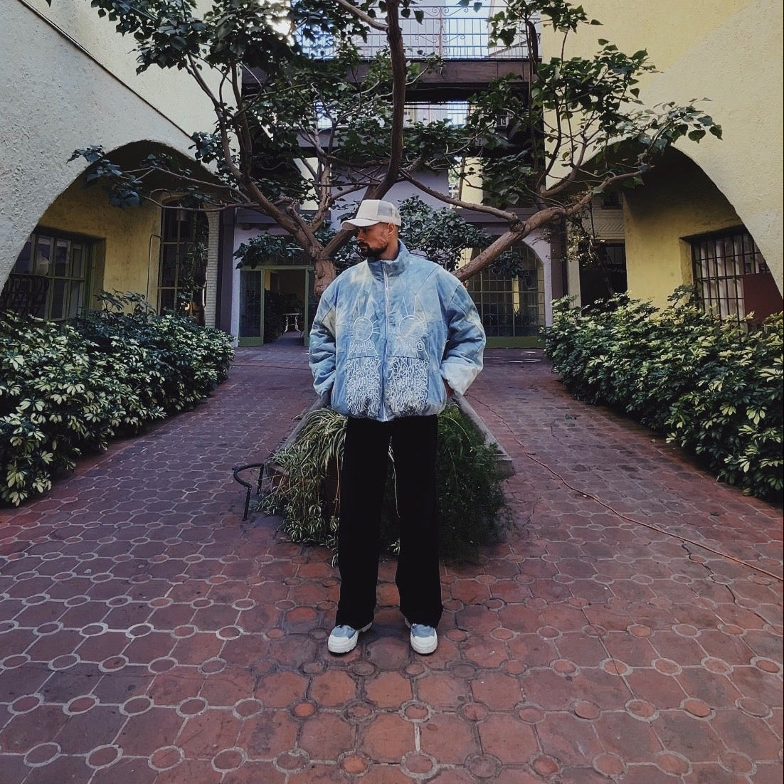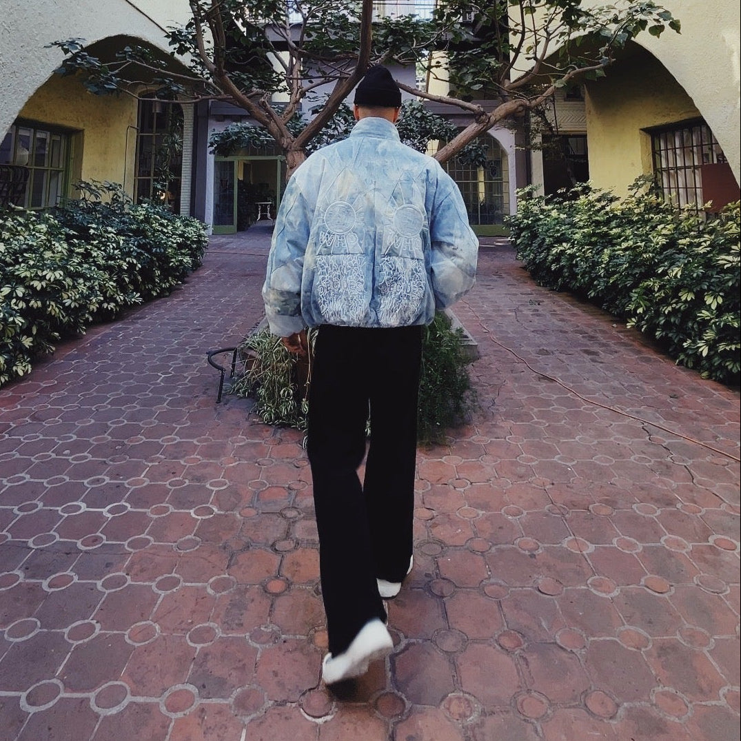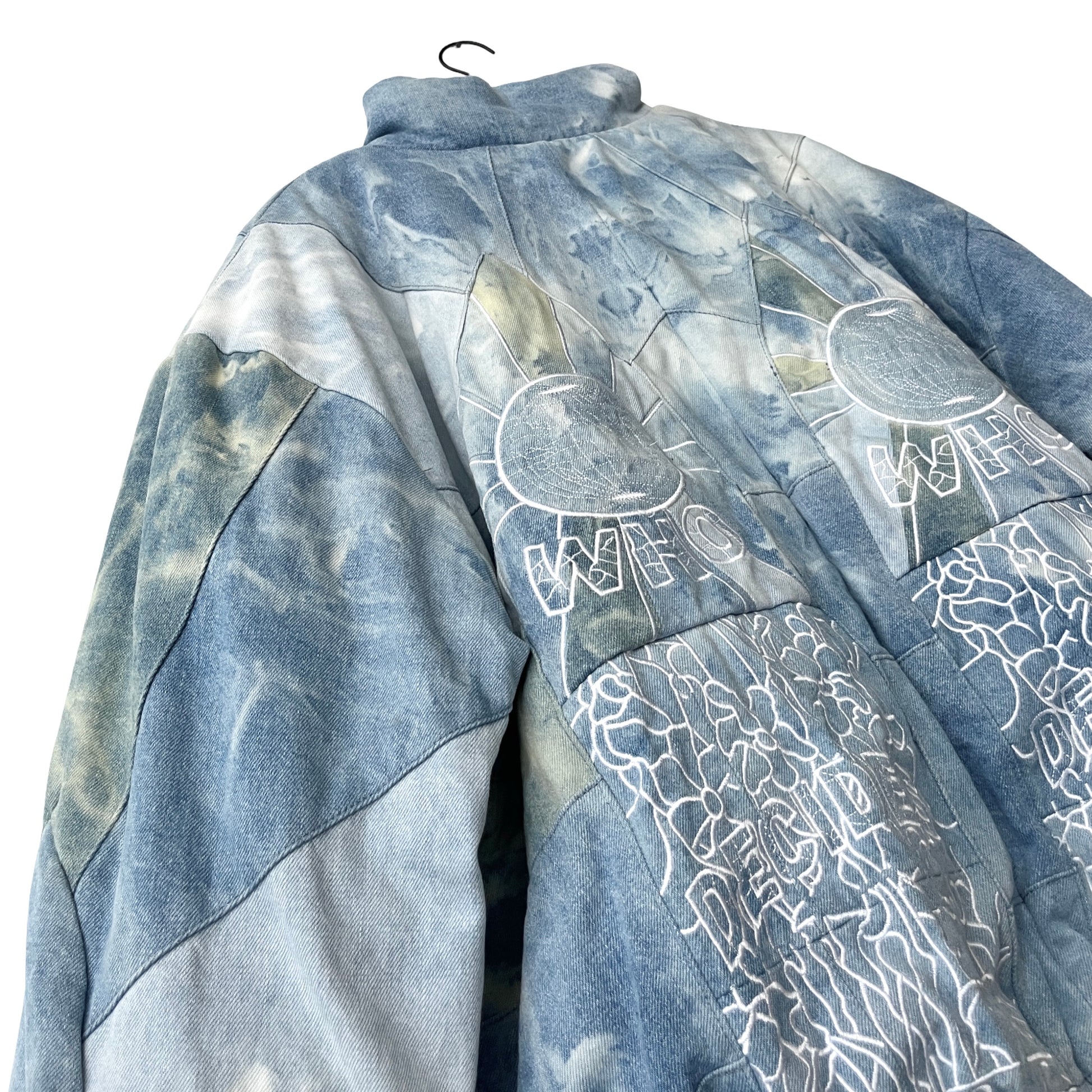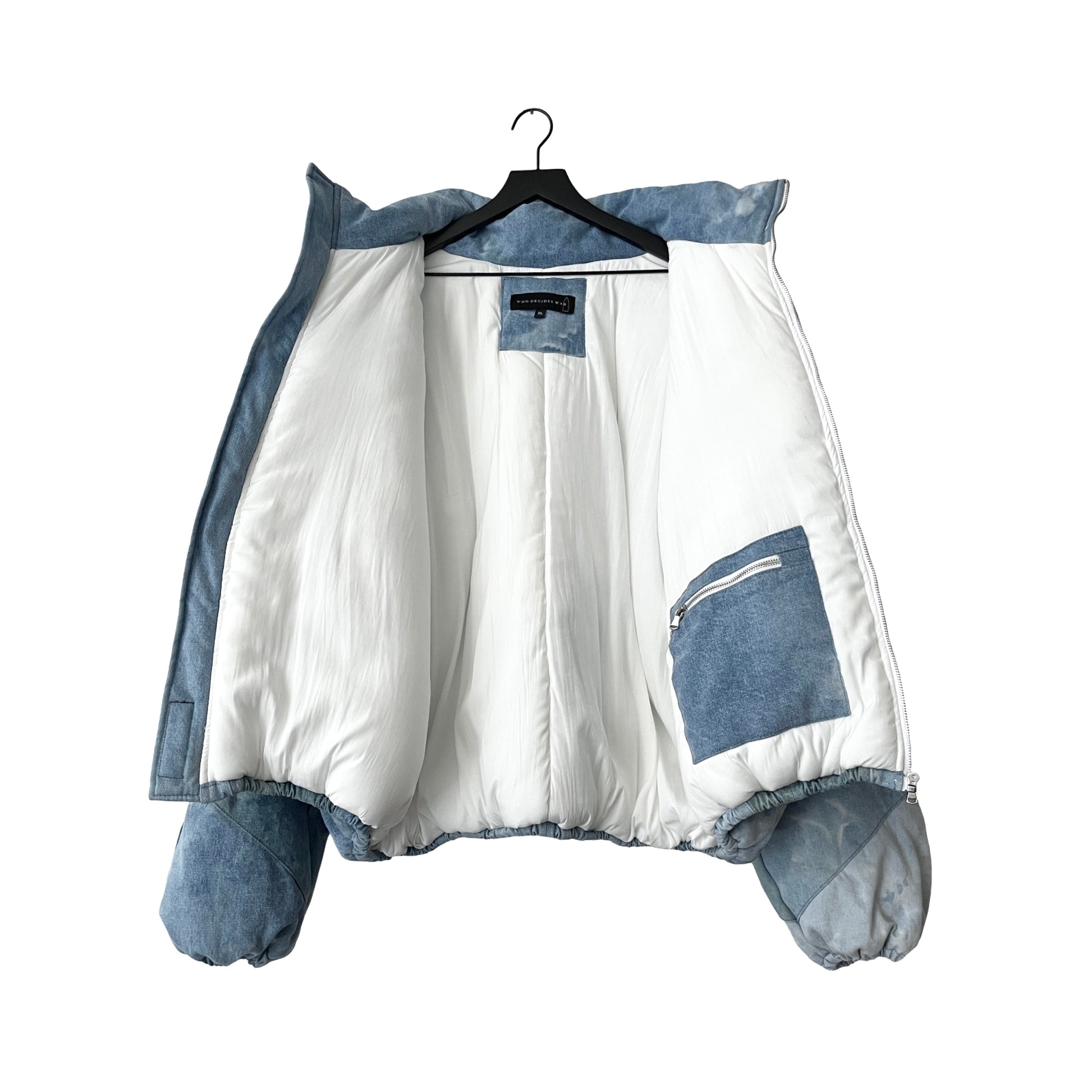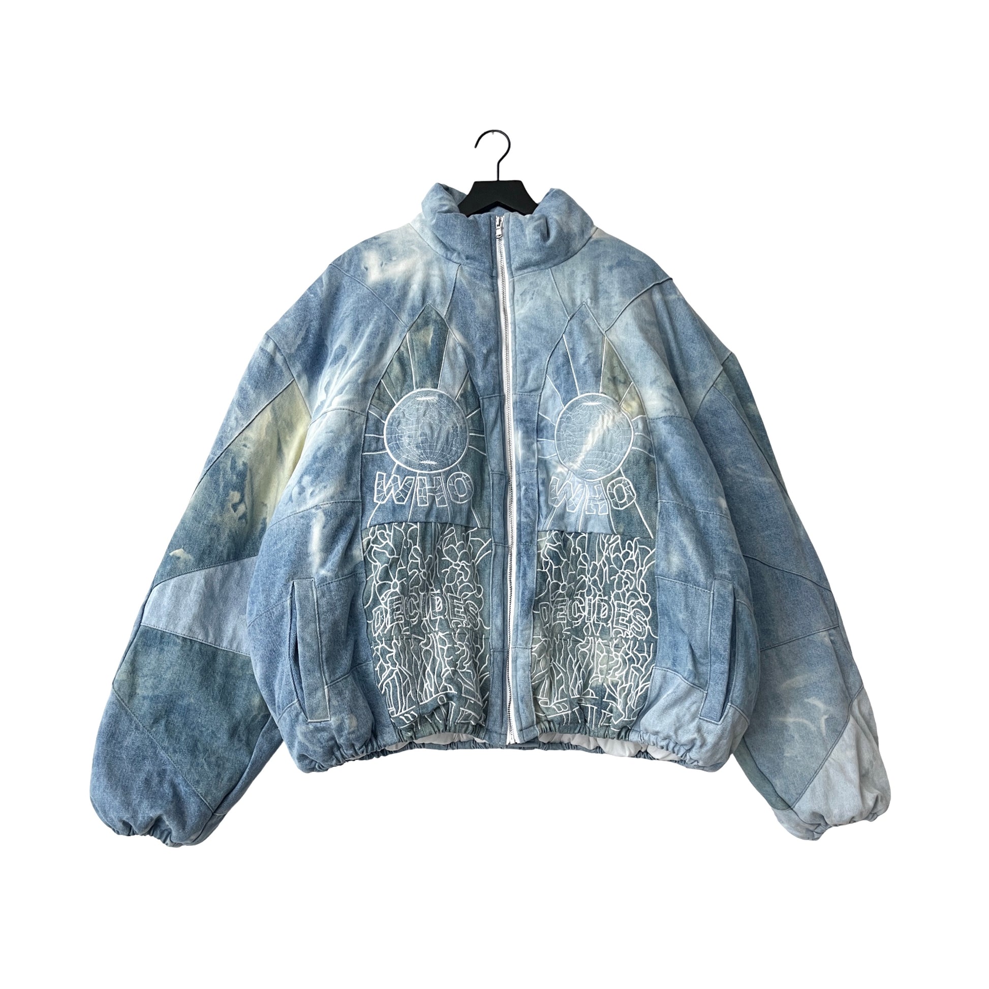 This is a customized, 1 of 1 denim puffer jacket from Who Decides War, originally released in their Fall/Winter 23 collection.