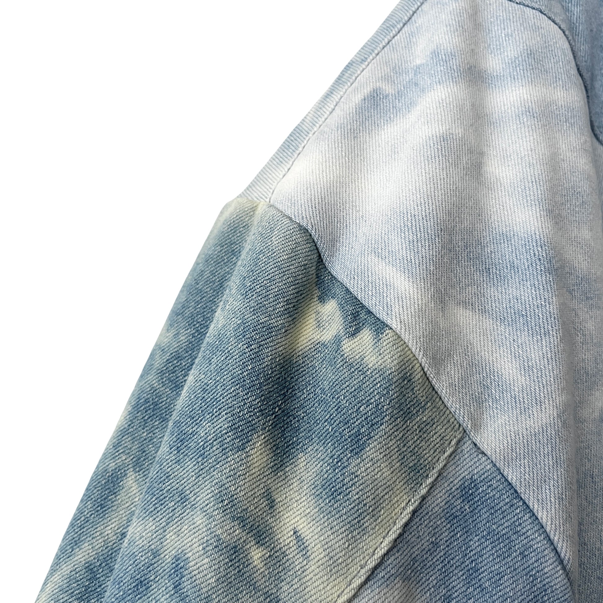 This jacket received a bleach treatment by hand, producing a unique marbled finish. The images show the nuances and details of the marbling.
